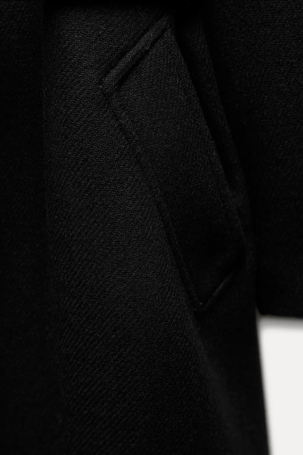 Abrigo confeccionado con lana. Cuello solapa y manga larga. Bolsillos delanteros de vivo. Bajo con abertura en espalda. Cierre con cinturón del mismo tejido.
