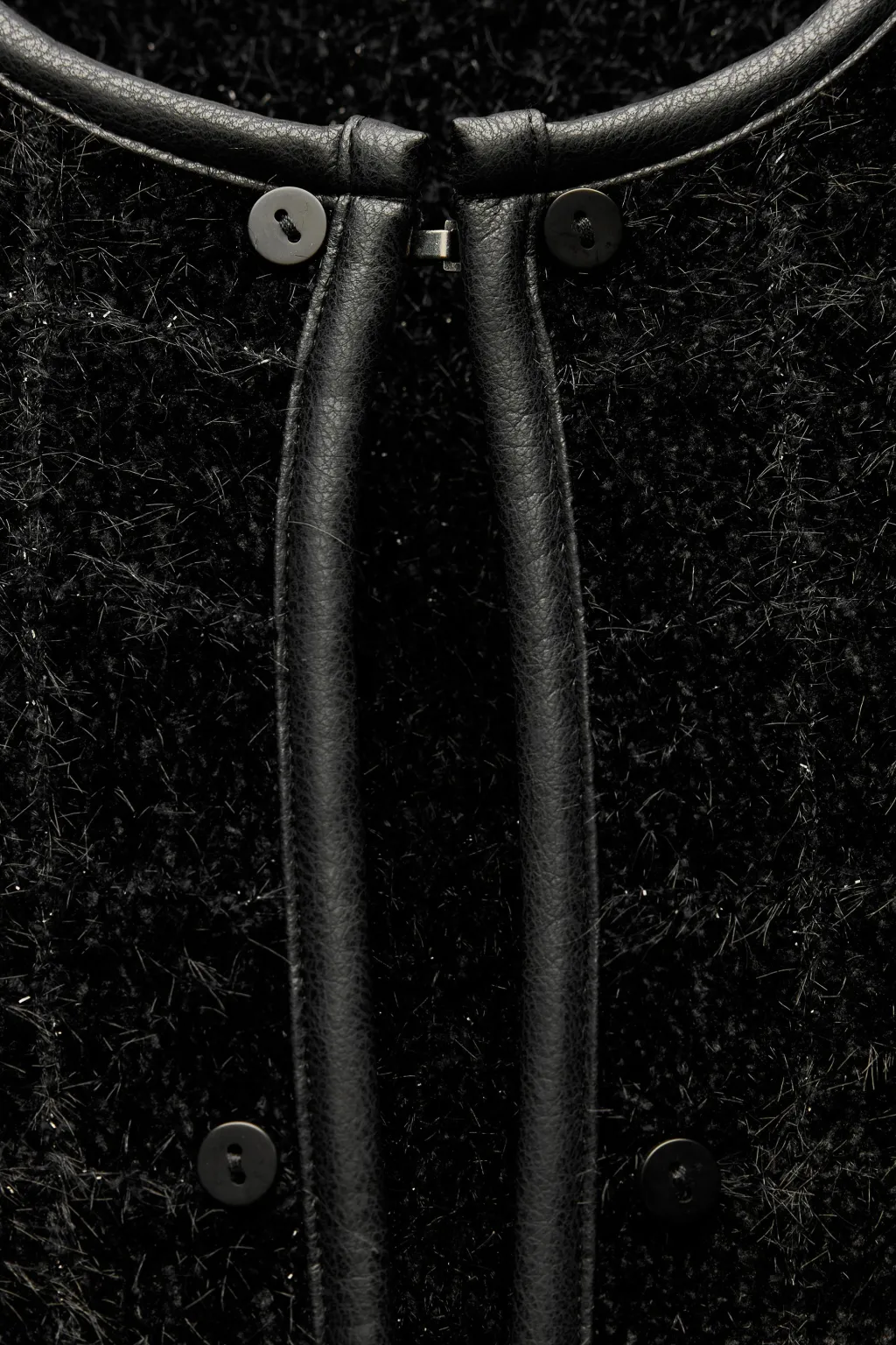 Abrigo de cuello con solapa desmontable efecto pelo y manga por debajo del codo. Bolsillos delanteros. Detalle de vivos efecto piel. Cierre frontal con gancho oculto.