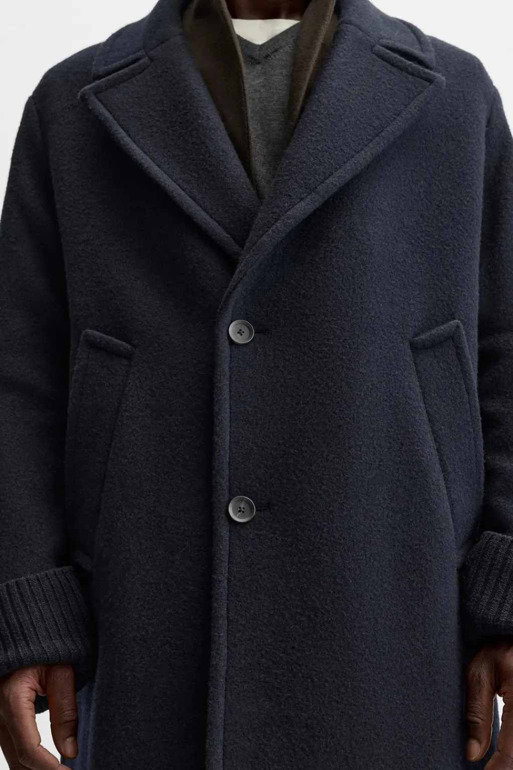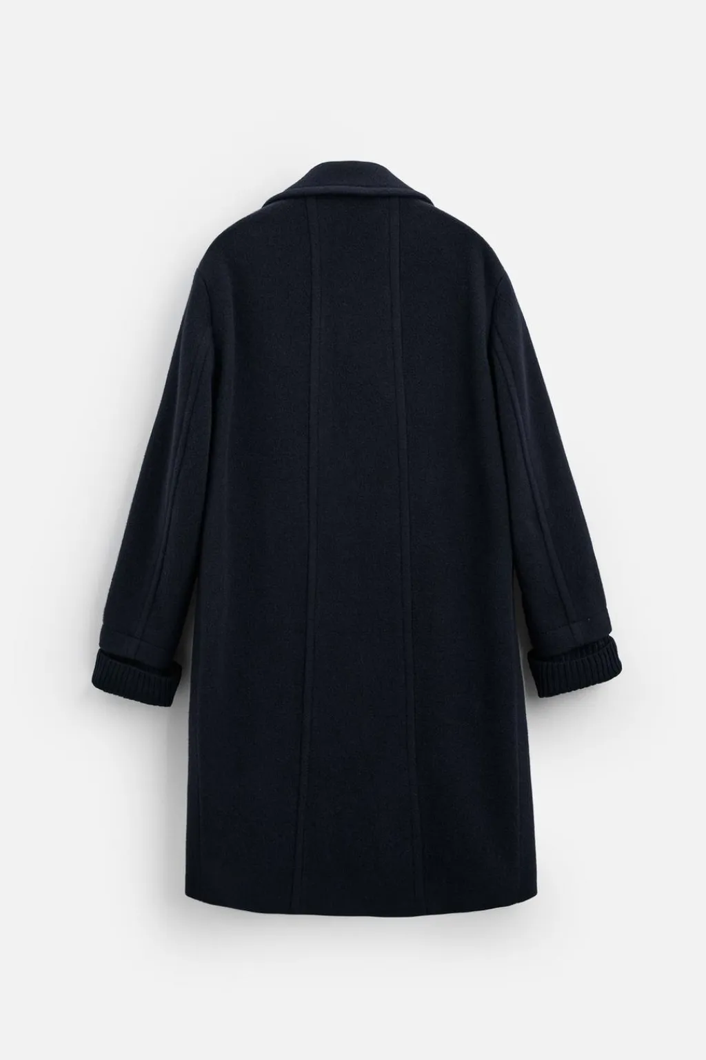 Abrigo relaxed fit confeccionado en tejido con mezcla de lana. Cuello con solapas de pico y manga larga acabada en puño de punto desmontable mediante botones. Bolsillos de vivo en cadera y detalle de bolsillo interior. Cierre frontal de botonadura.
