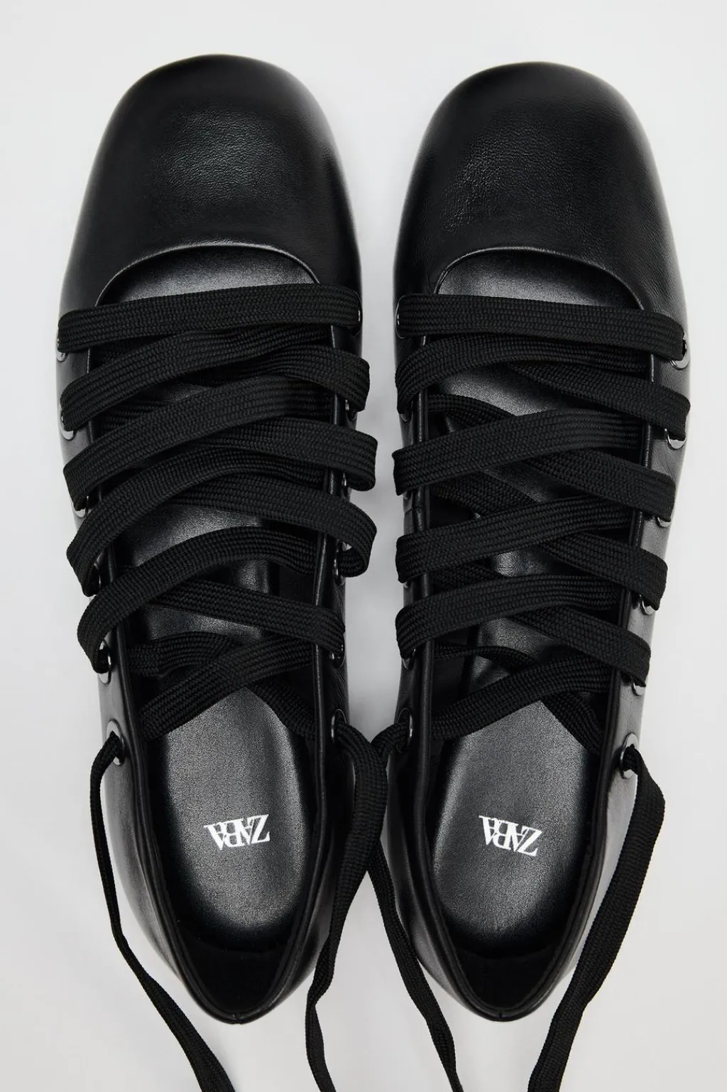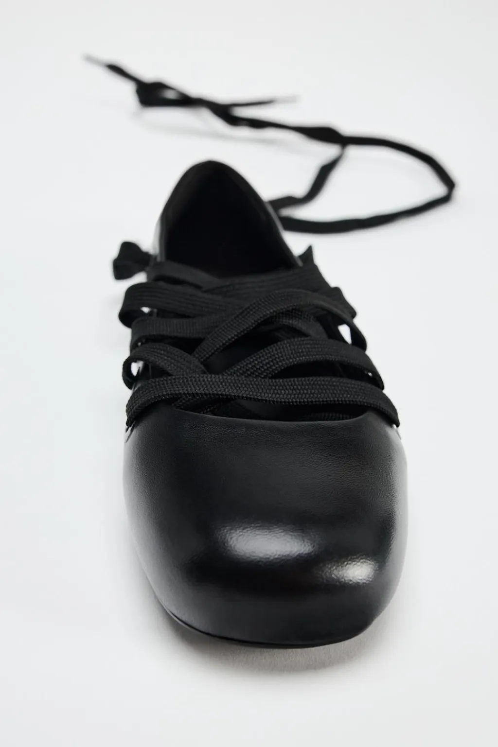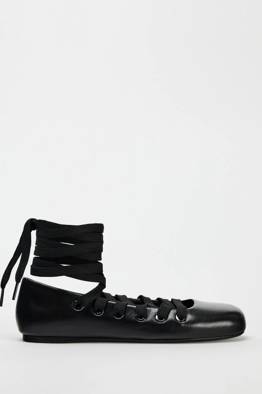 Zapato tipo bailarina en piel. Cierre mediante cordones a la pulsera del tobillo. Acabado en punta redonda.
