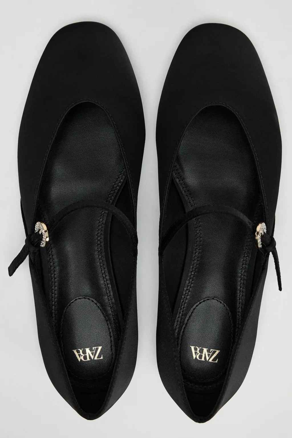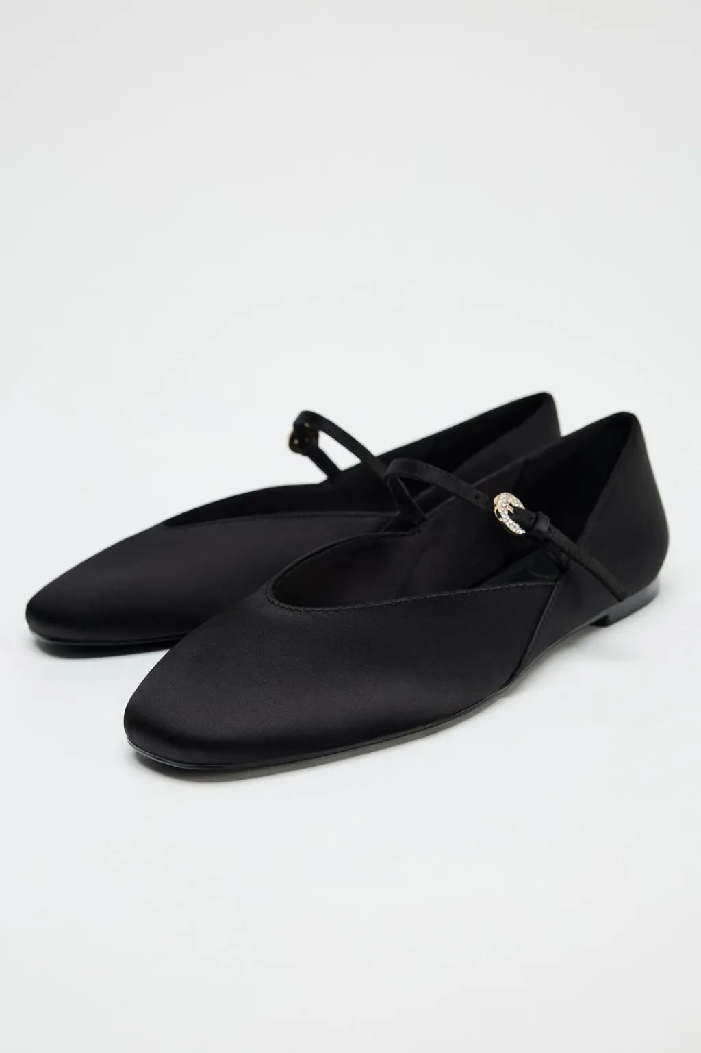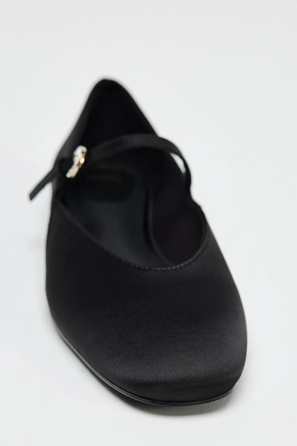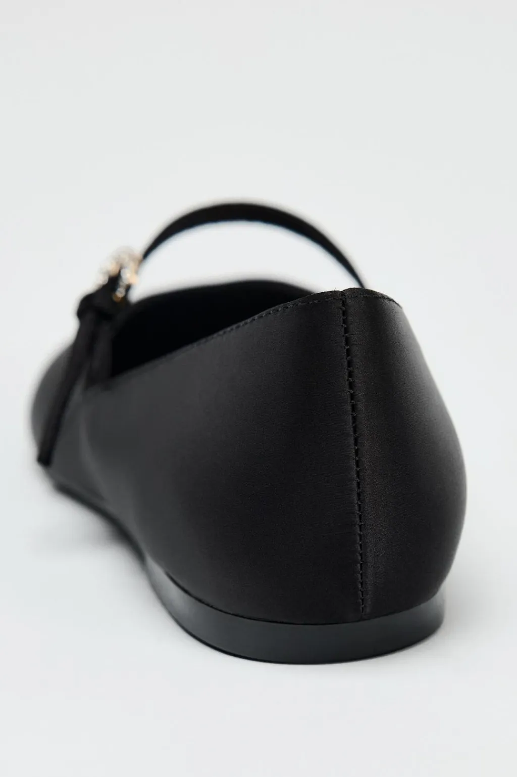 Zapato tipo bailarina en efecto satinado. Detalle de tira con hebilla ajustable en brillo. Acabado en punta redonda.