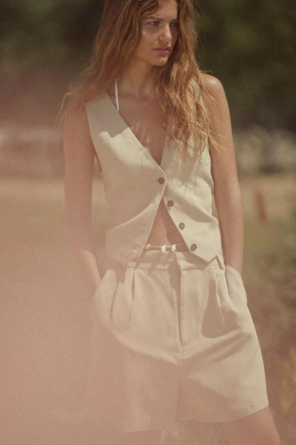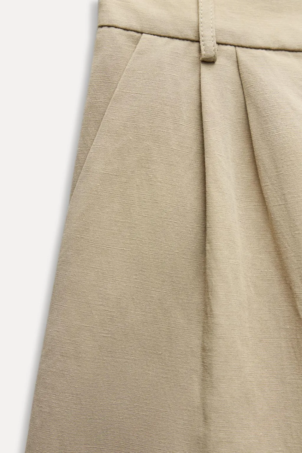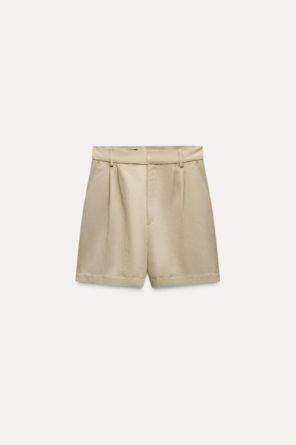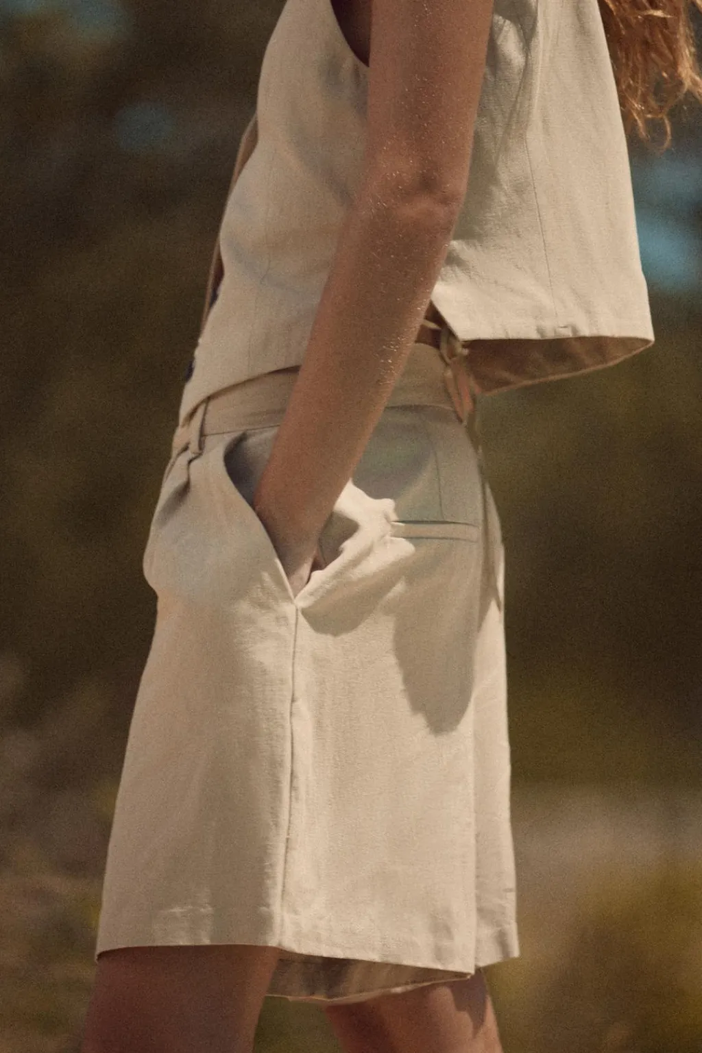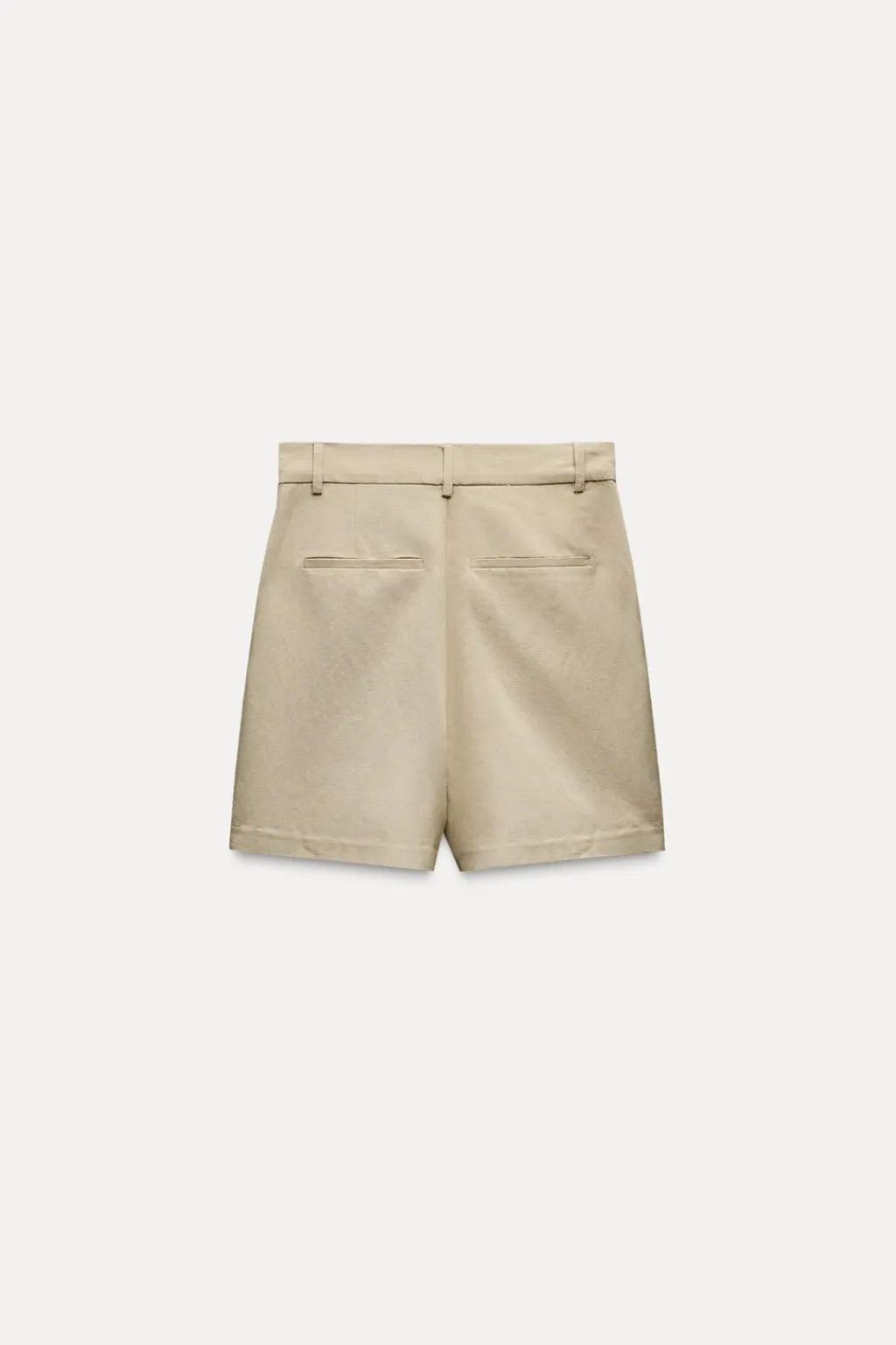 Bermuda confeccionada con 22% de lino. Tiro alto con trabillas. Bolsillos laterales y falsos bolsillos de vivo en espalda. Detalle de pliegues en delantero. Cierre frontal con cremallera, botón interior y gancho metálico.