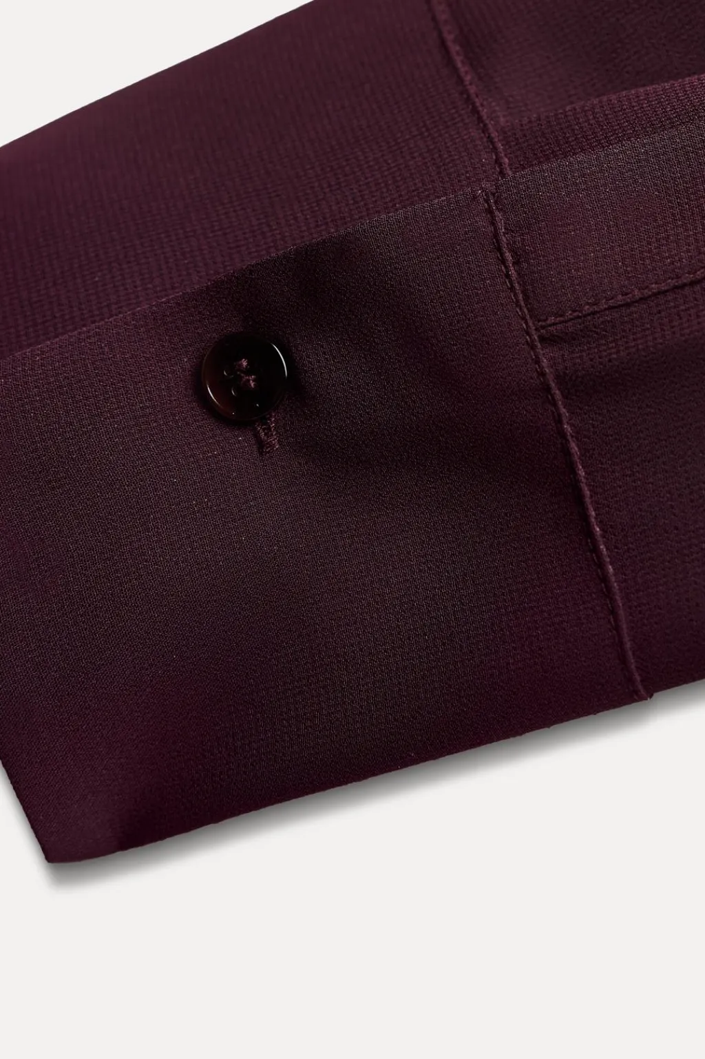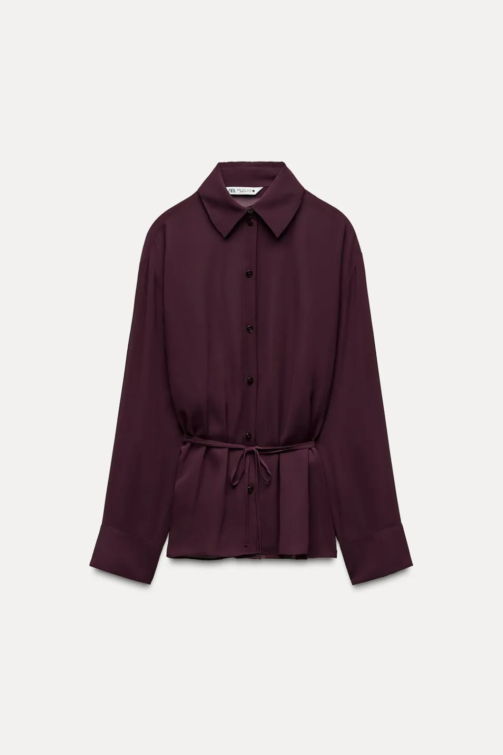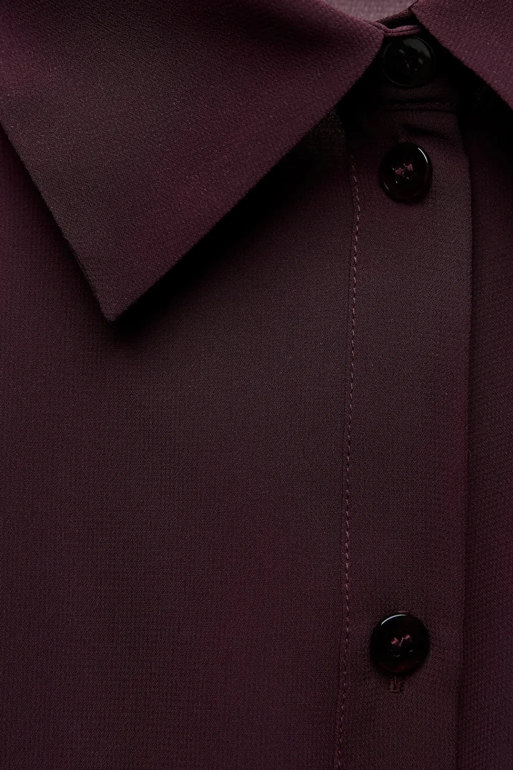 Blusa de cuello solapa y escote pico con manga larga acabada en puño. Detalle de cintura ajustable con lazadas. Cierre frontal con botones.