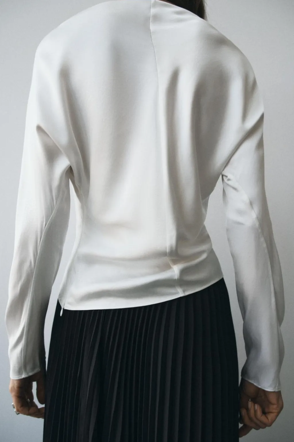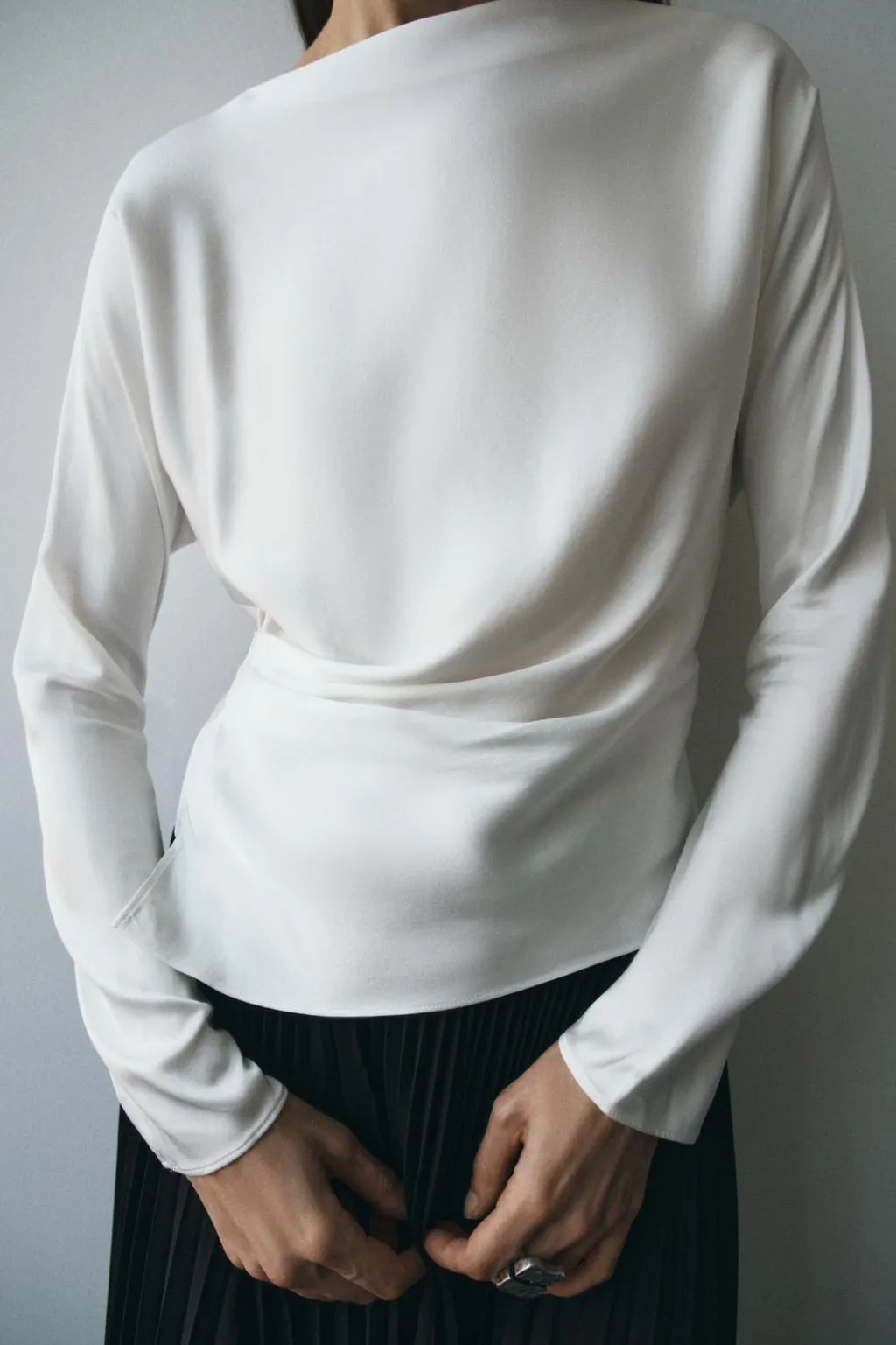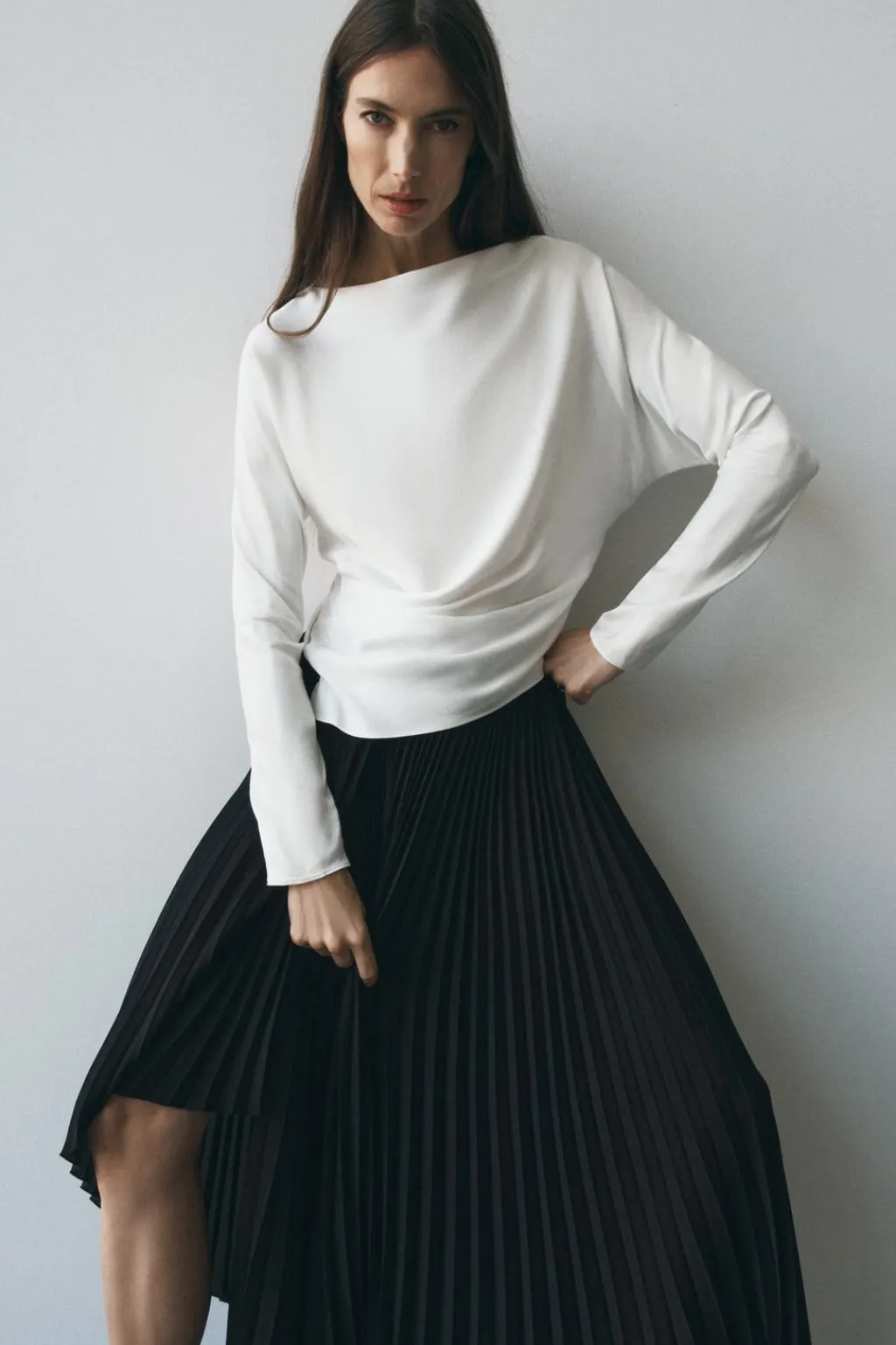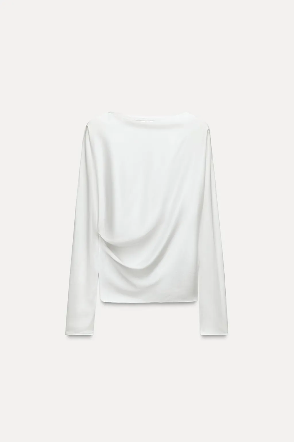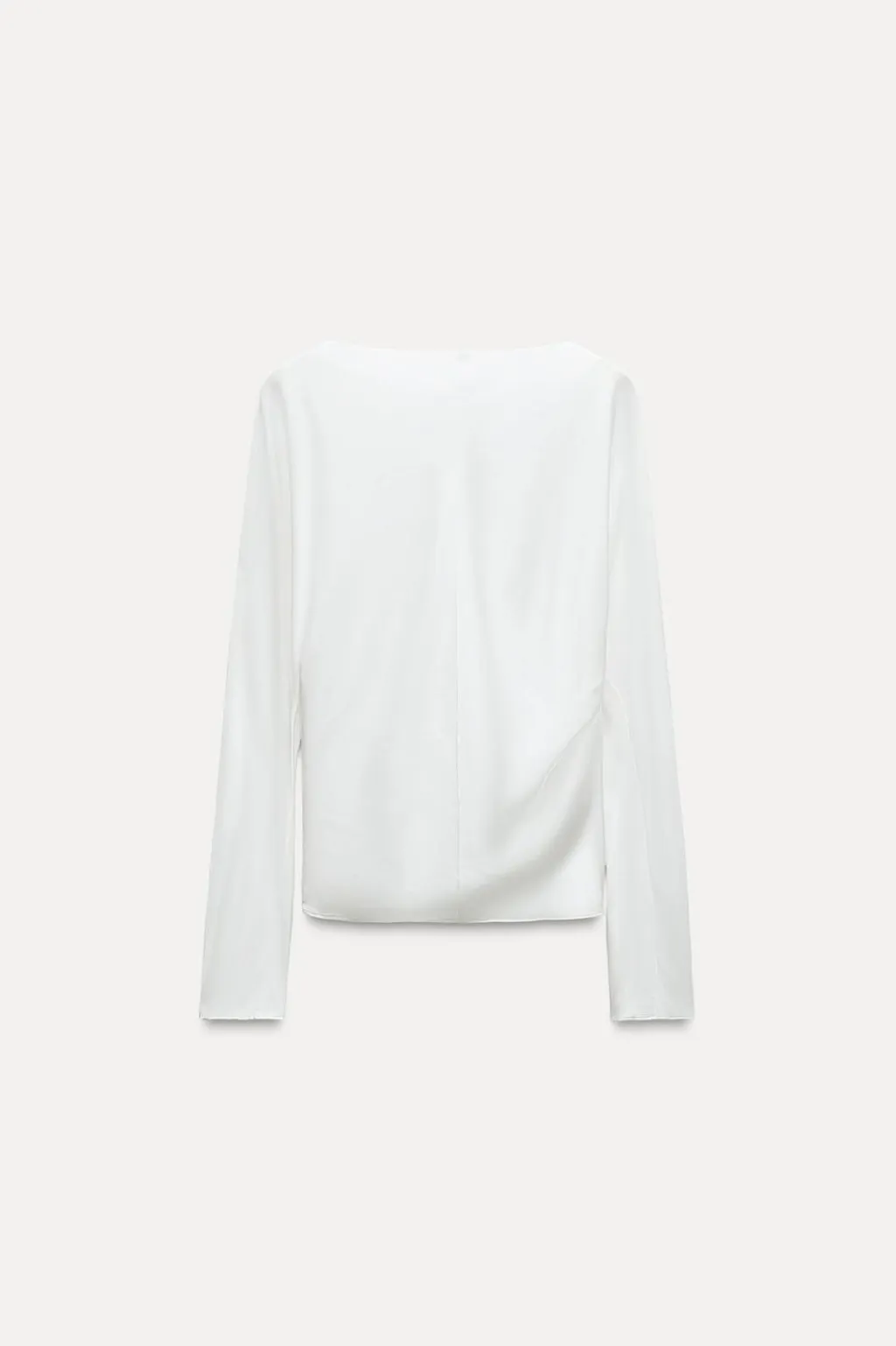 Blusa confeccionada en hilatura de viscosa. Cuello barco y manga larga. Detalle de drapeado lateral. Bajo recto