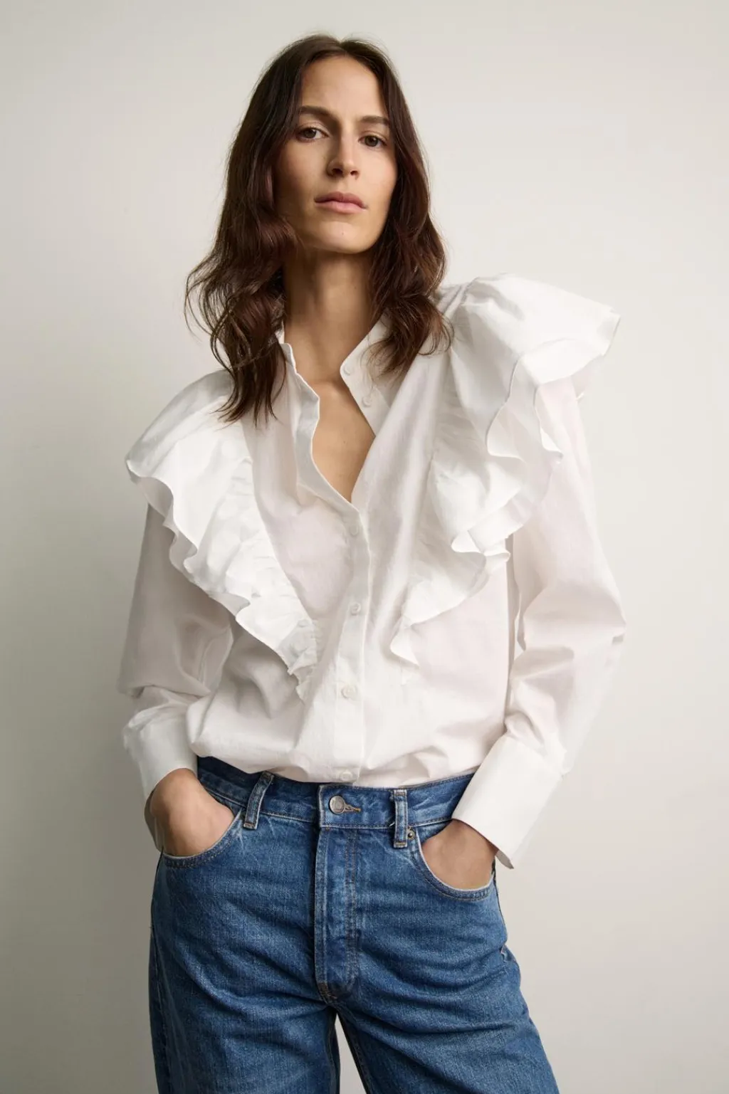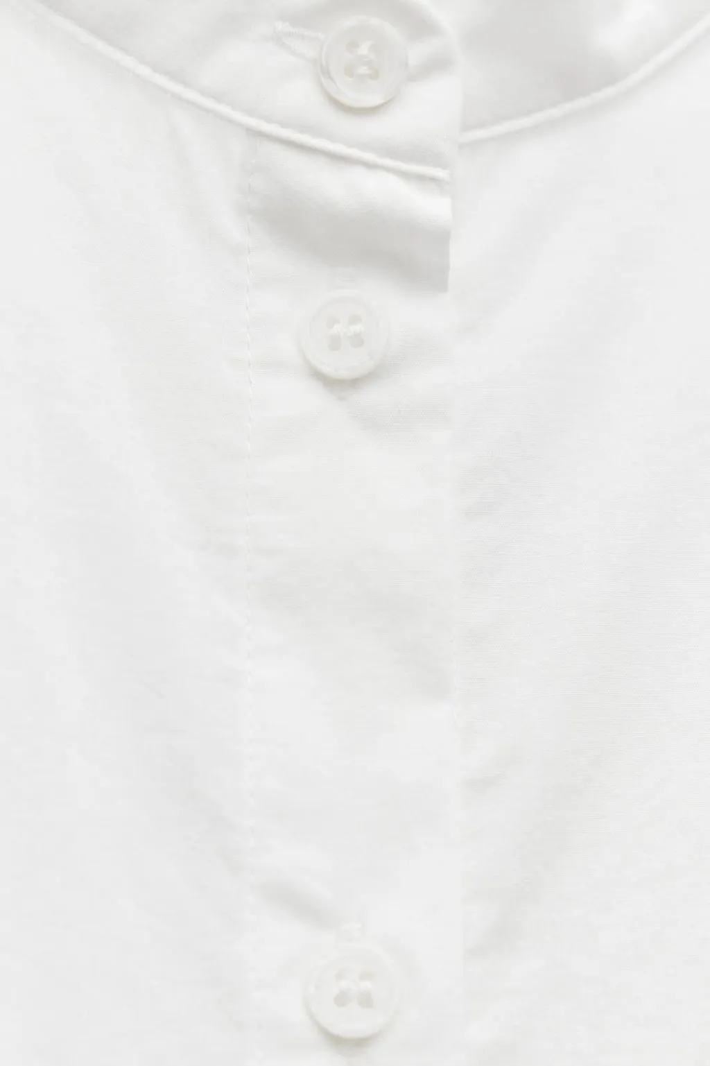 Blusa confeccionada en hilatura de algodón. Cuello redondo y manga larga acabada en puño. Detalle de volantes en mismo tejido. Cierre frontal con botones.