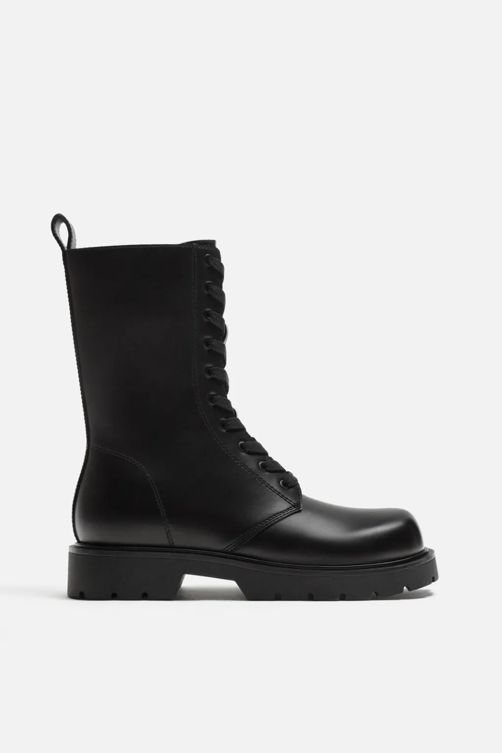 Bota con cordones de caña alta. Cordonera con diez pasados. Cuenta con un tirador en la parte trasera para facilitar el calce. Horma en punta cuadrada. Suela con volumen y piso track.