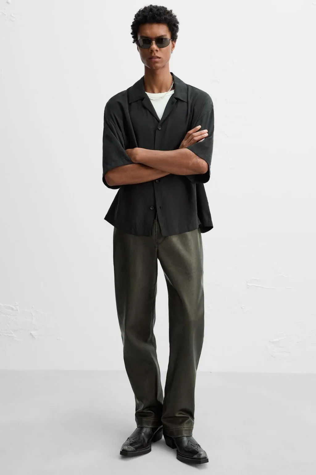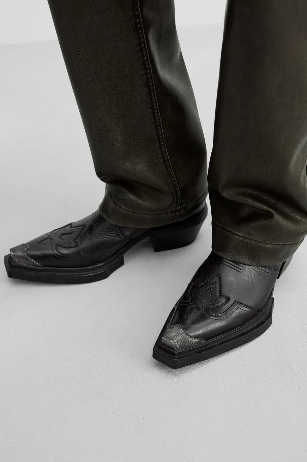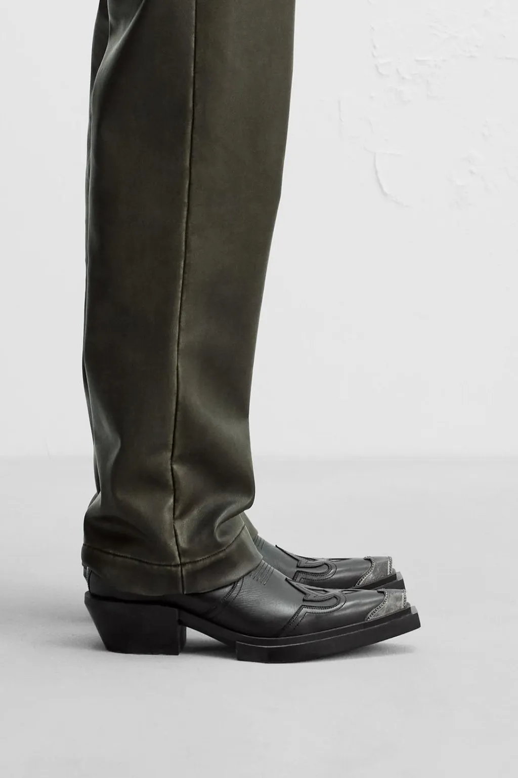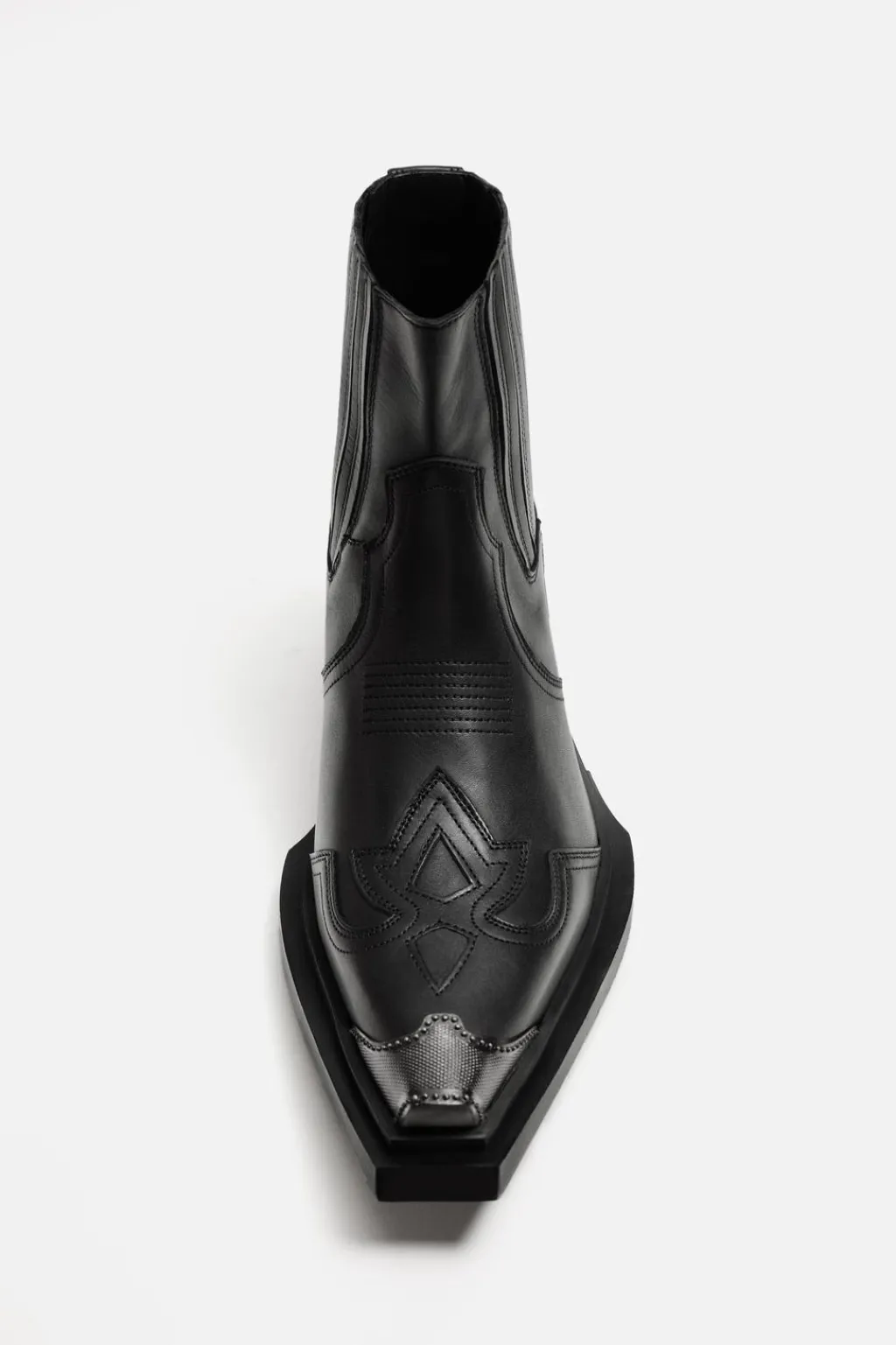 Bota tipo cowboy. Parte superior fabricada en piel. Combinación de patrones en el corte. Cuenta con dos piezas elásticas a ambos lados para facilitar el calce. Horma en punta con detalle de pieza metálica. Tacón ancho y suela con ligero volumen.