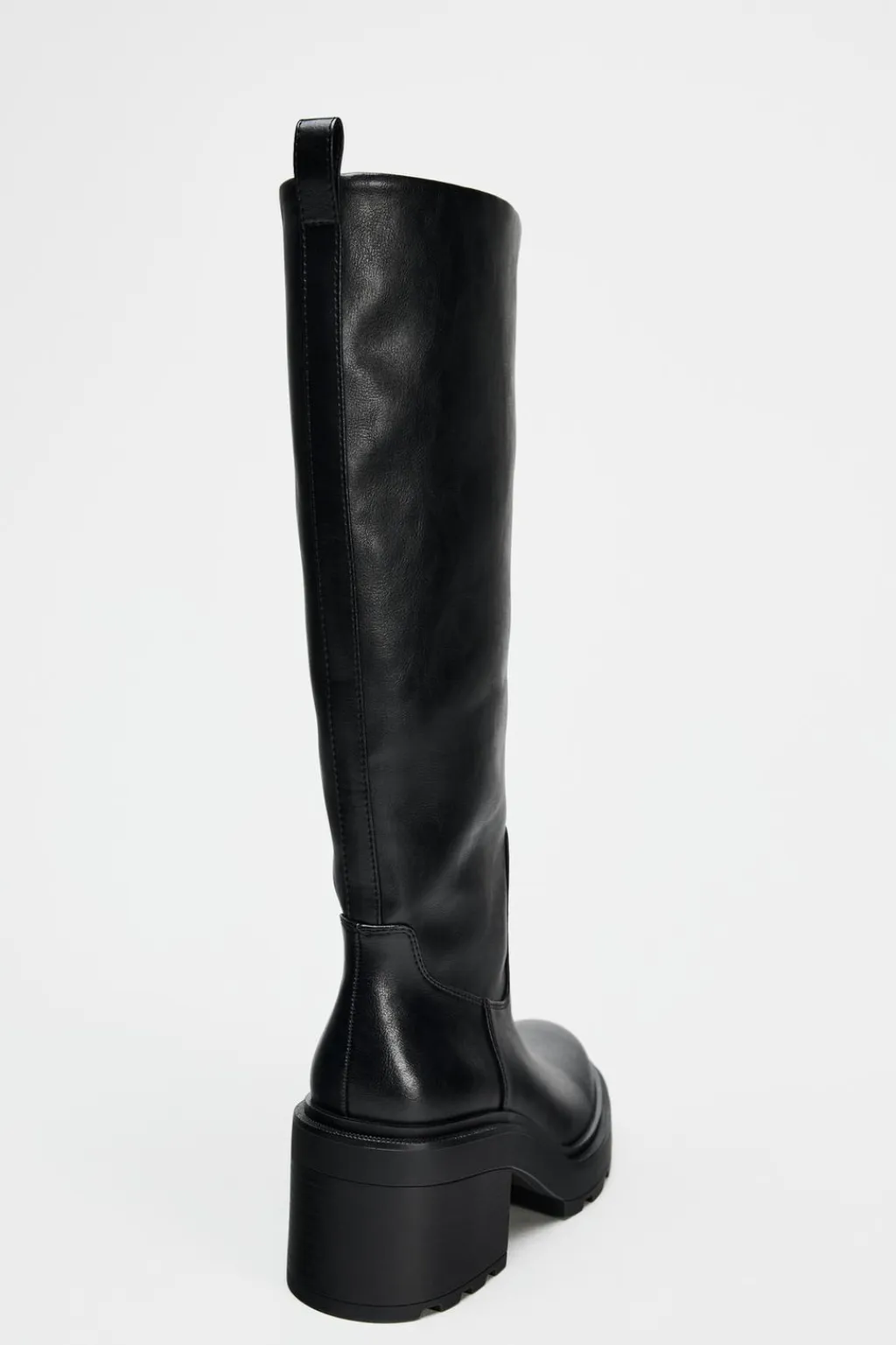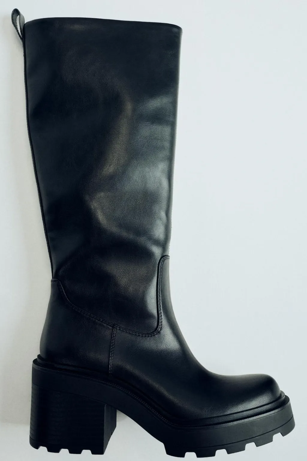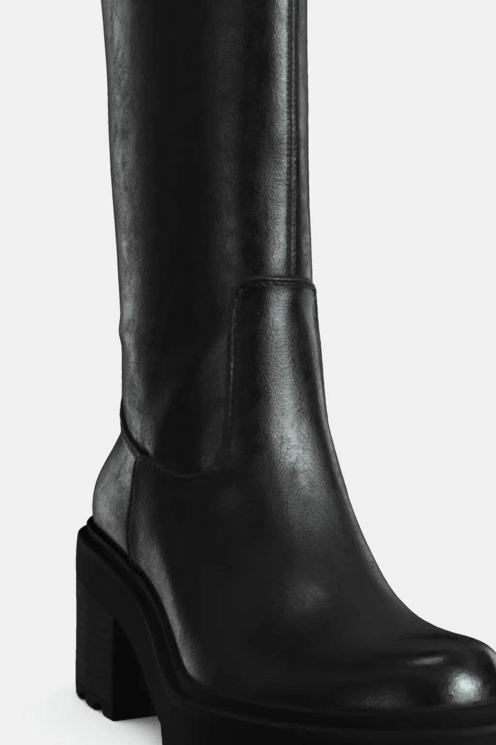 Zapato tipo bota con suela track y dentada. Tacón ancho y caña alta. Tirador trasero. Acabado en punta redonda.