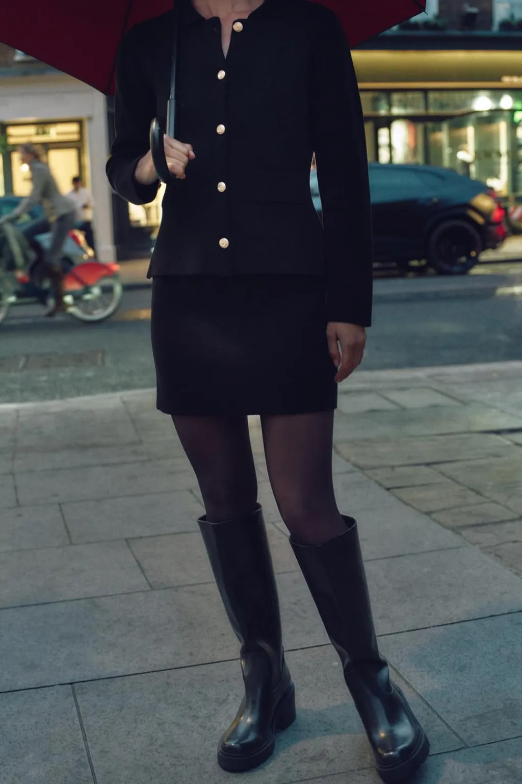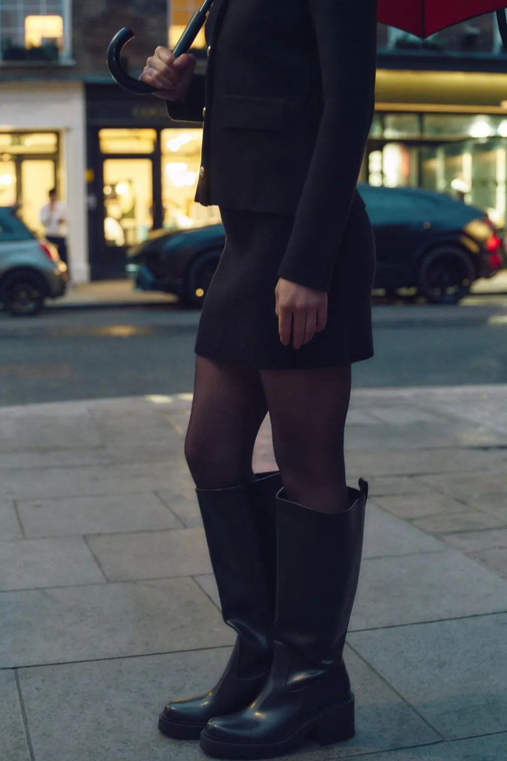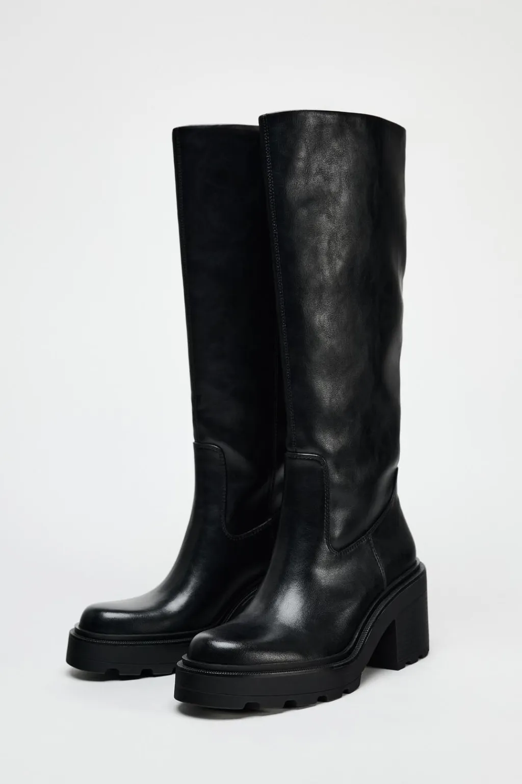 Zapato tipo bota con suela track y dentada. Tacón ancho y caña alta. Tirador trasero. Acabado en punta redonda.