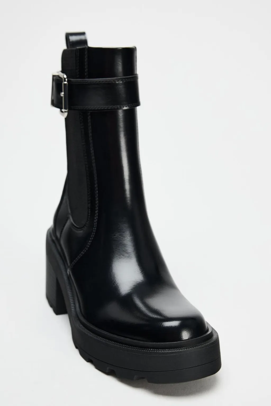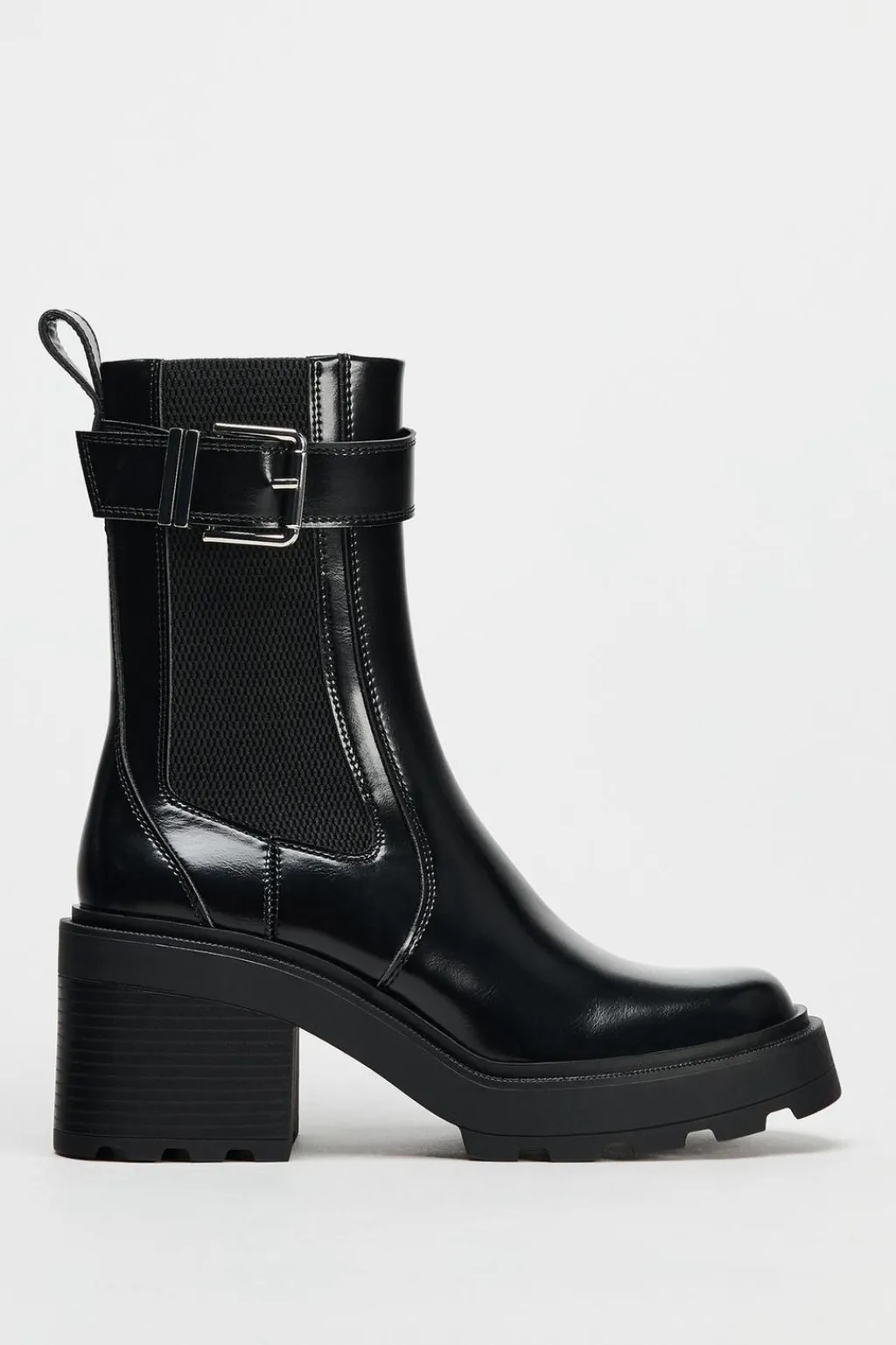 Zapato tipo botín con suela dentada. Detalle de hebilla en la caña ylateral elástico. Tirador trasero. Cierre mediante cremallera. Acabado en punta redonda.