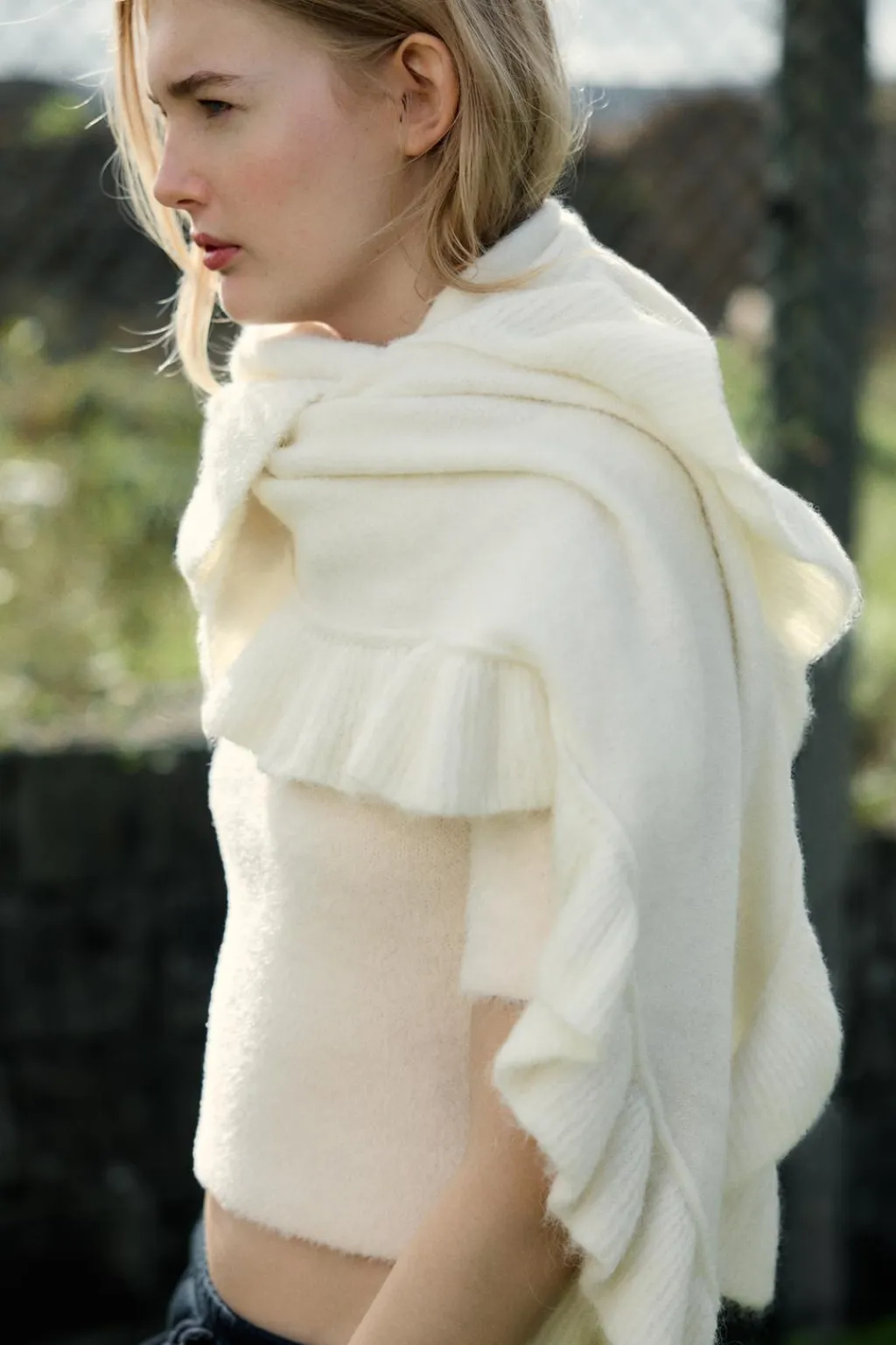 Bufanda confeccionada con lana 13% y alpaca 14%. Acabados en volantes.