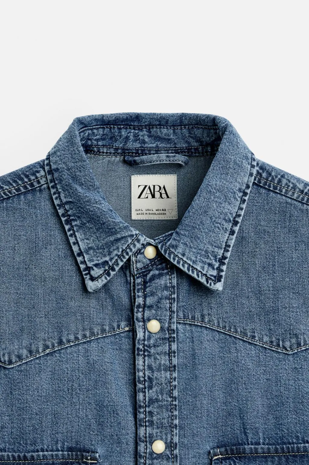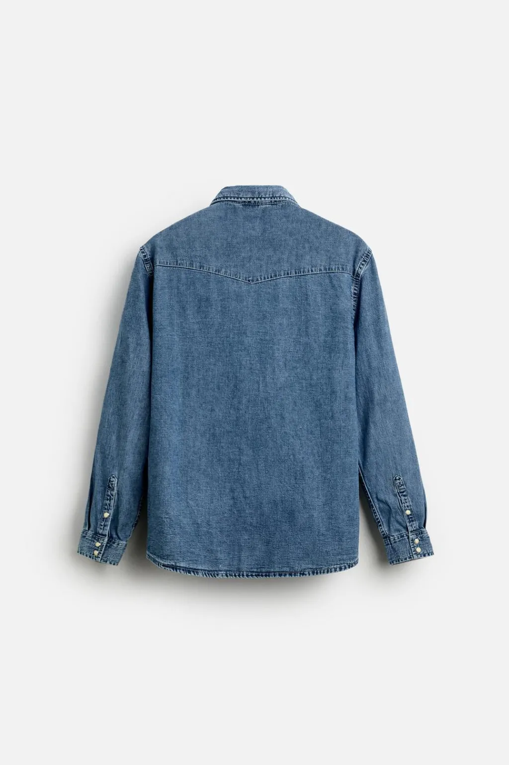 Camisa relaxed fit confeccionada en denim ligero de algodón. Cuello solapa y manga larga acabada en puño con botón a presión. Bolsillos plastrón con solapa en pecho. Efecto lavado. Cierre frontal con botones a presión.