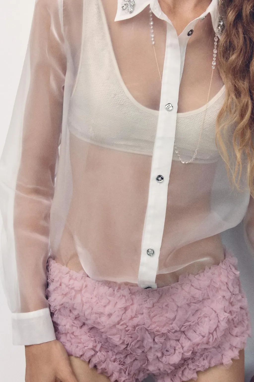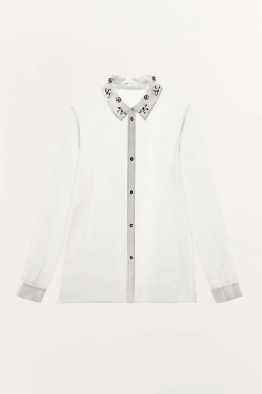 Camisa semitransparente de cuello solapa con aplicación de joyas combinadas a contraste. Manga larga acabada en puño. Cierre frontal con botones.