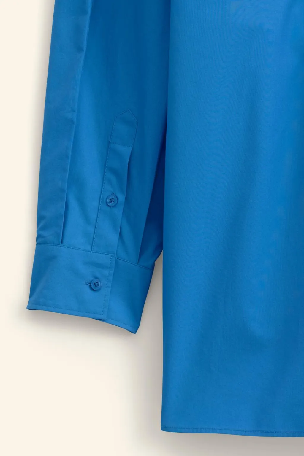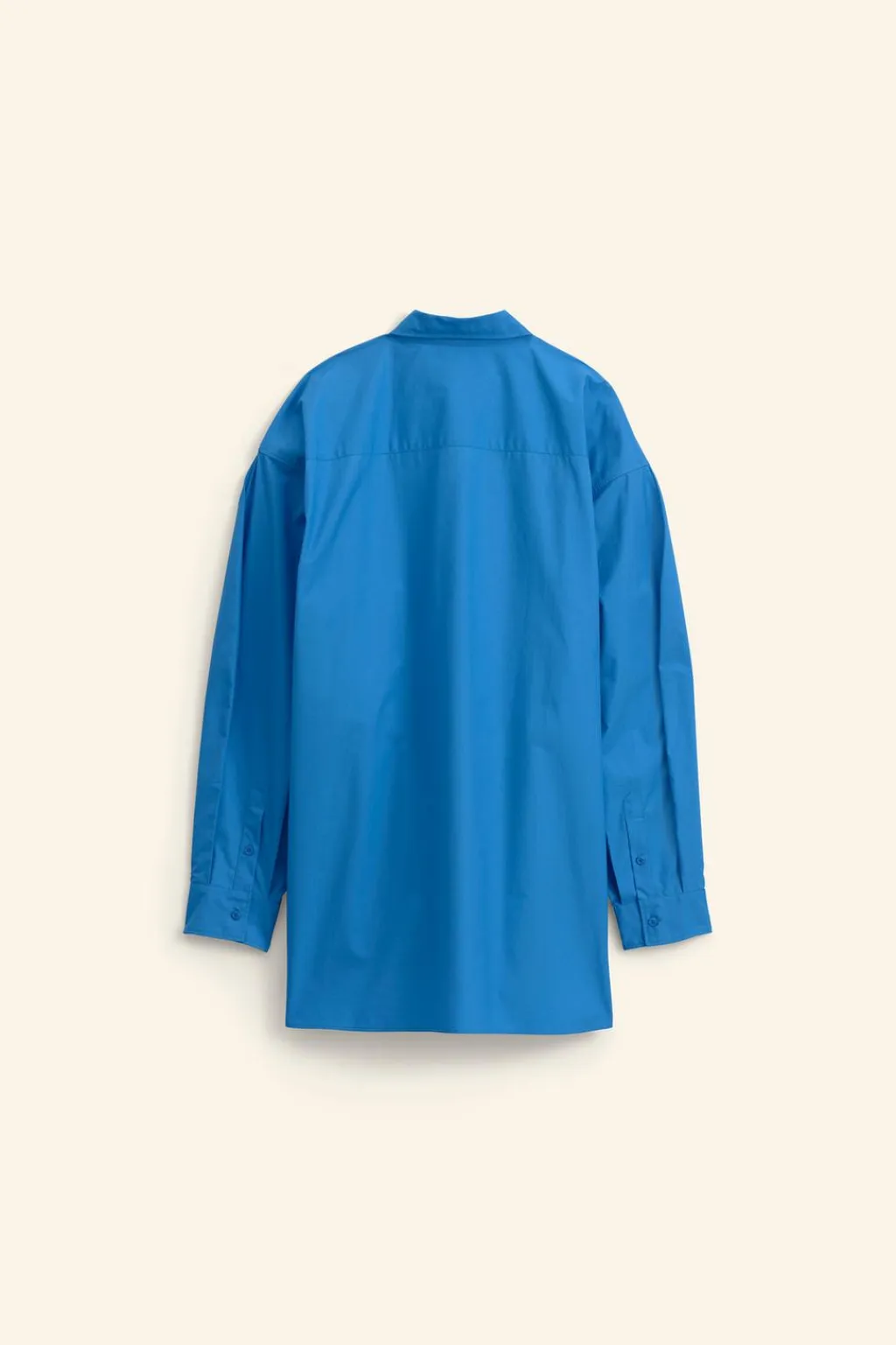 Camisa oversize fit confeccionada en algodón. Cuello solapa y manga larga con detalle de pliegues en hombro. Cierre frontal de botonadura.