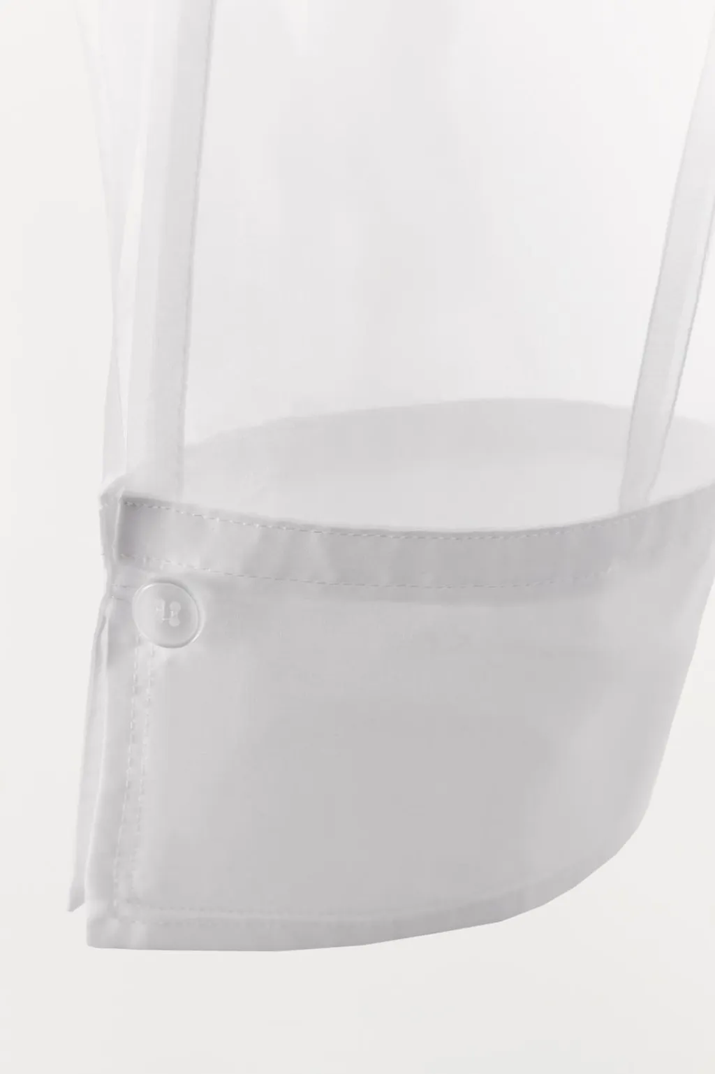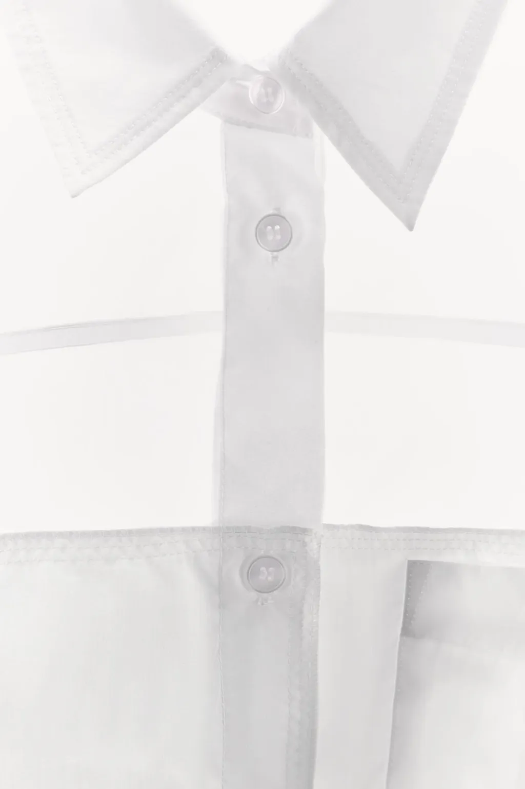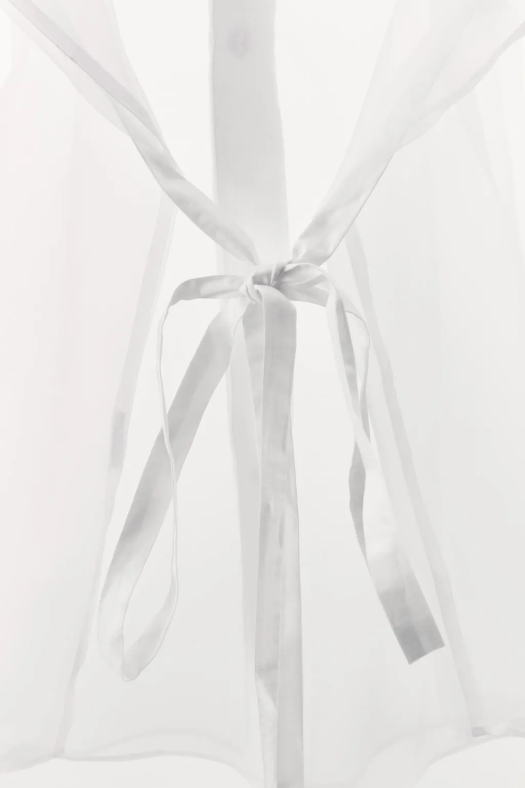 Camisa semitransparente oversize. Cuello solapa y manga larga acabada en puño. Bolsillo de plastrón en pecho. Tejido combinado en popelín a tono. Detalle de lazada en popelín. Cierre frontal con botones.