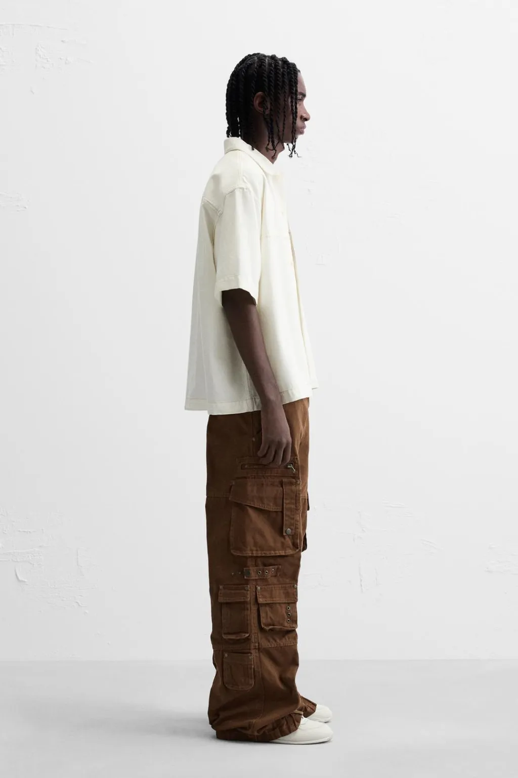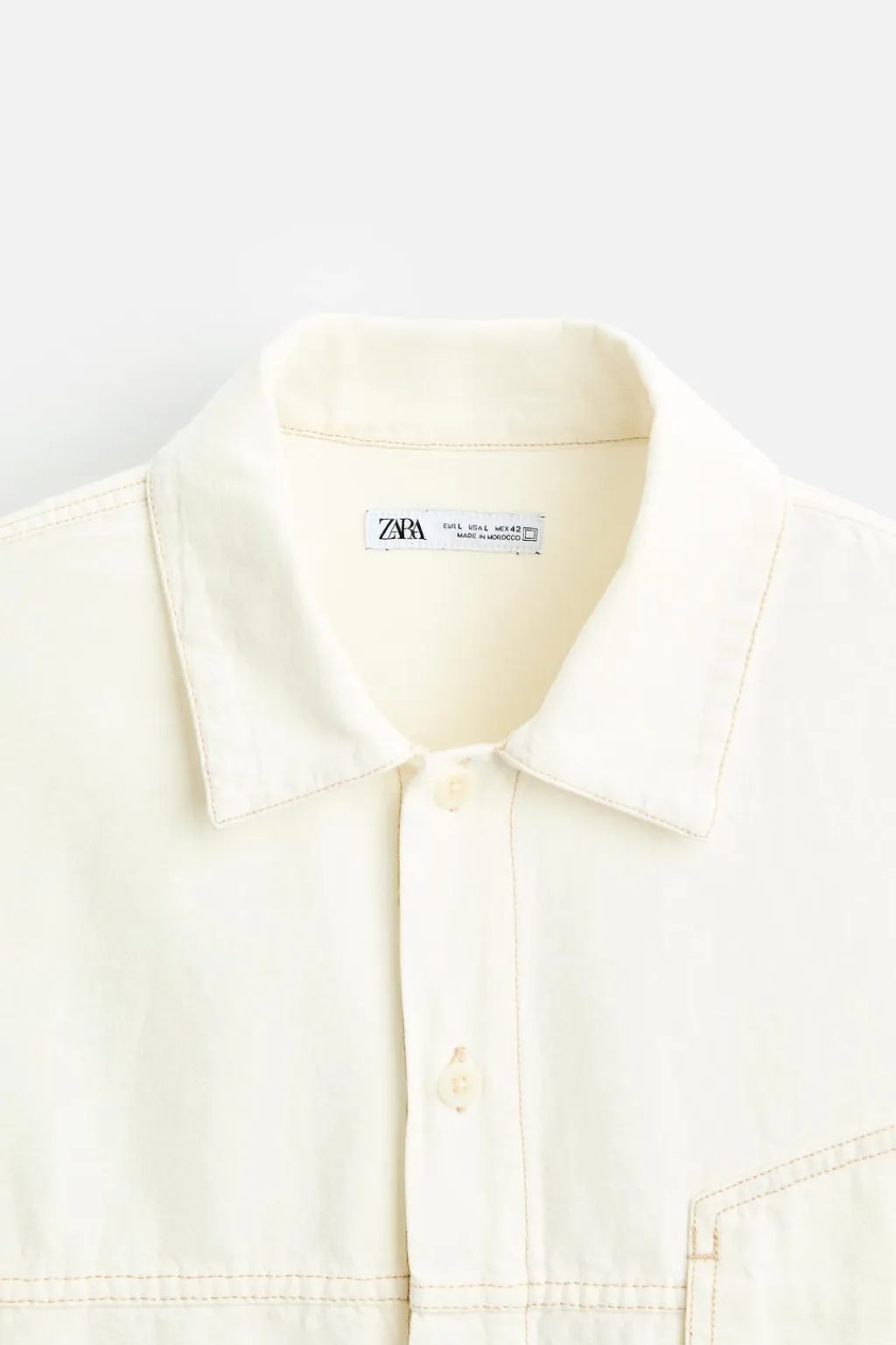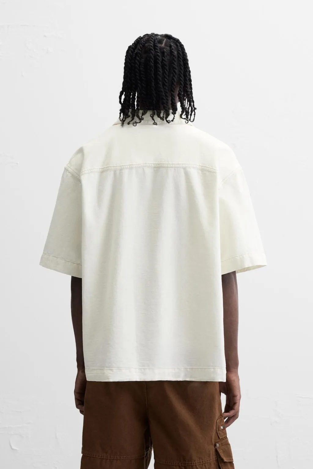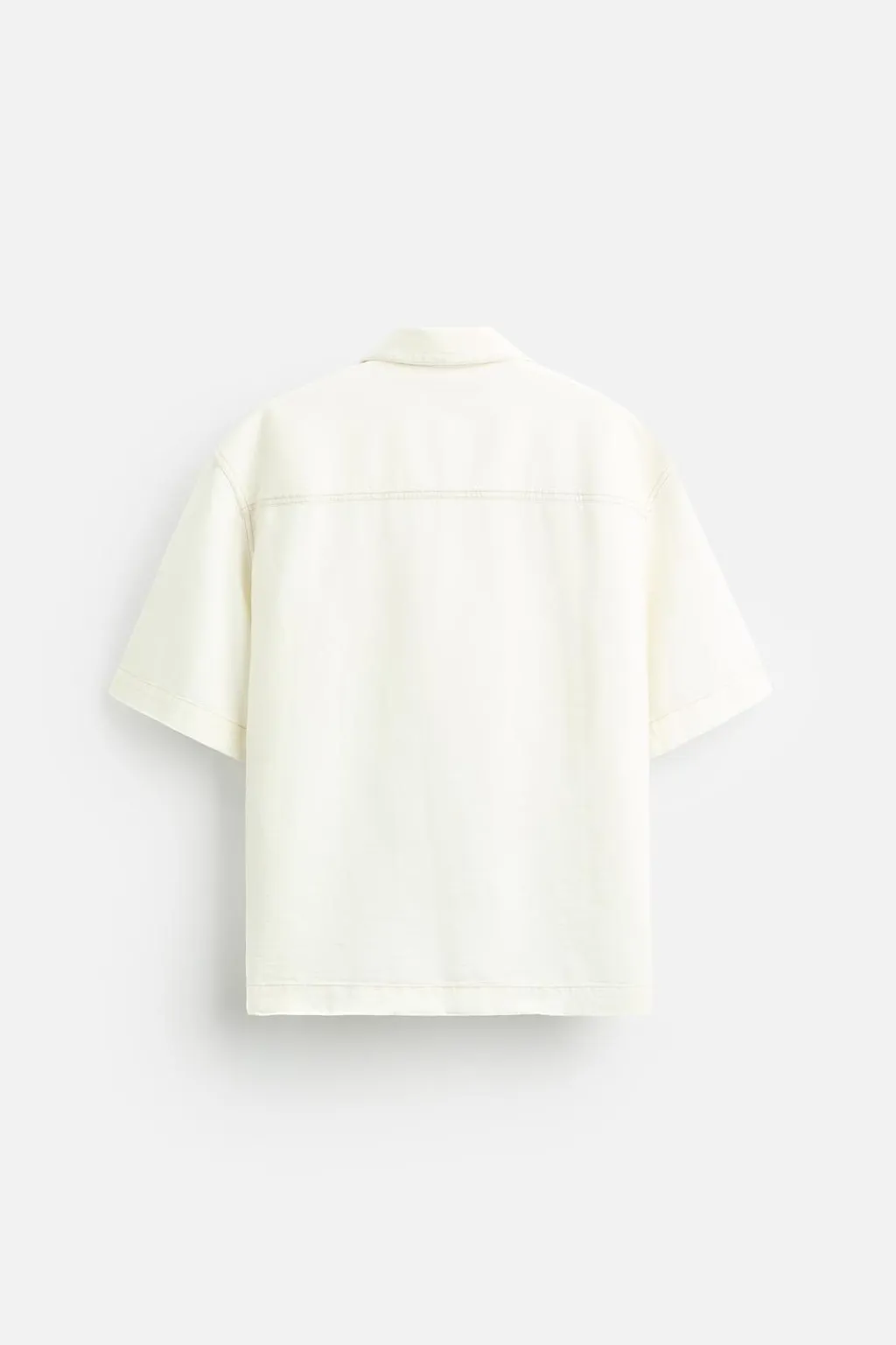 Camisa cropped fit. Cuello solapa y manga corta. Bolsillo plastrón en pecho. Pespuntes combinados a contraste en toda la prenda. Cierre frontal de botonadura.