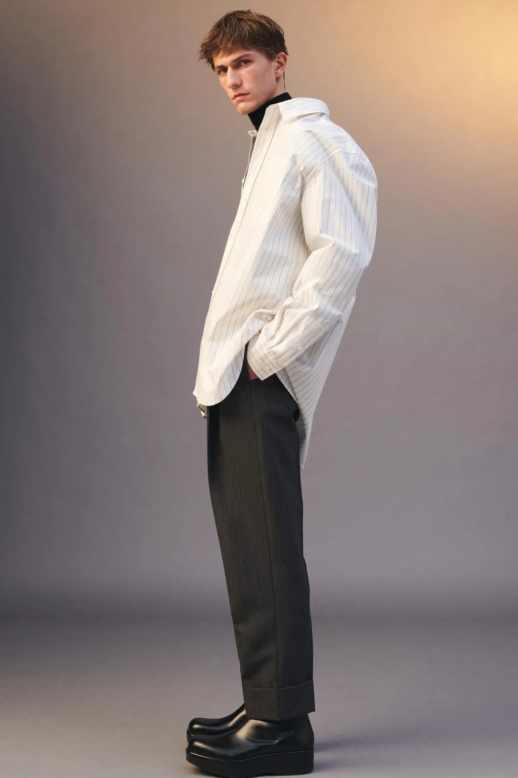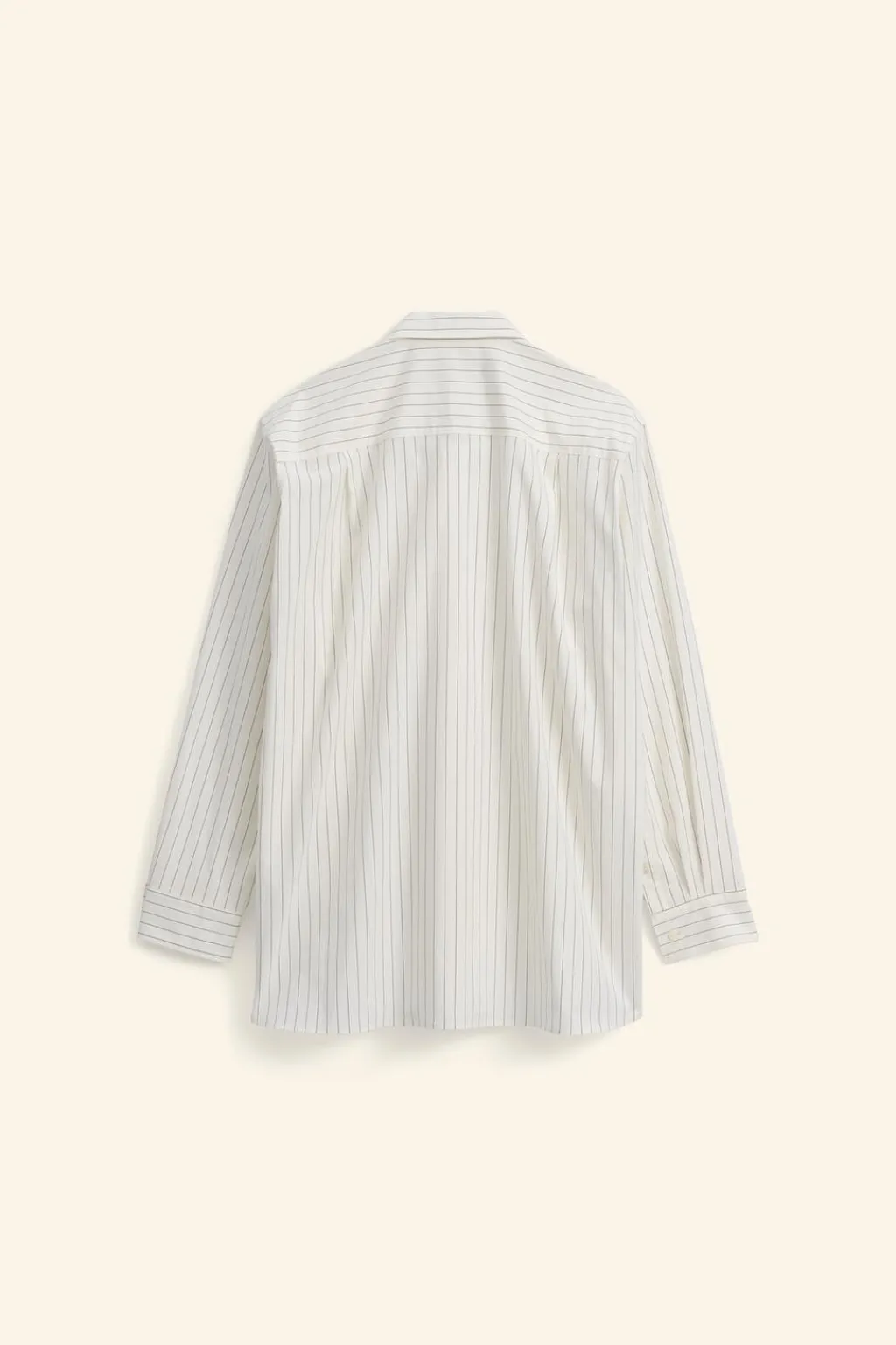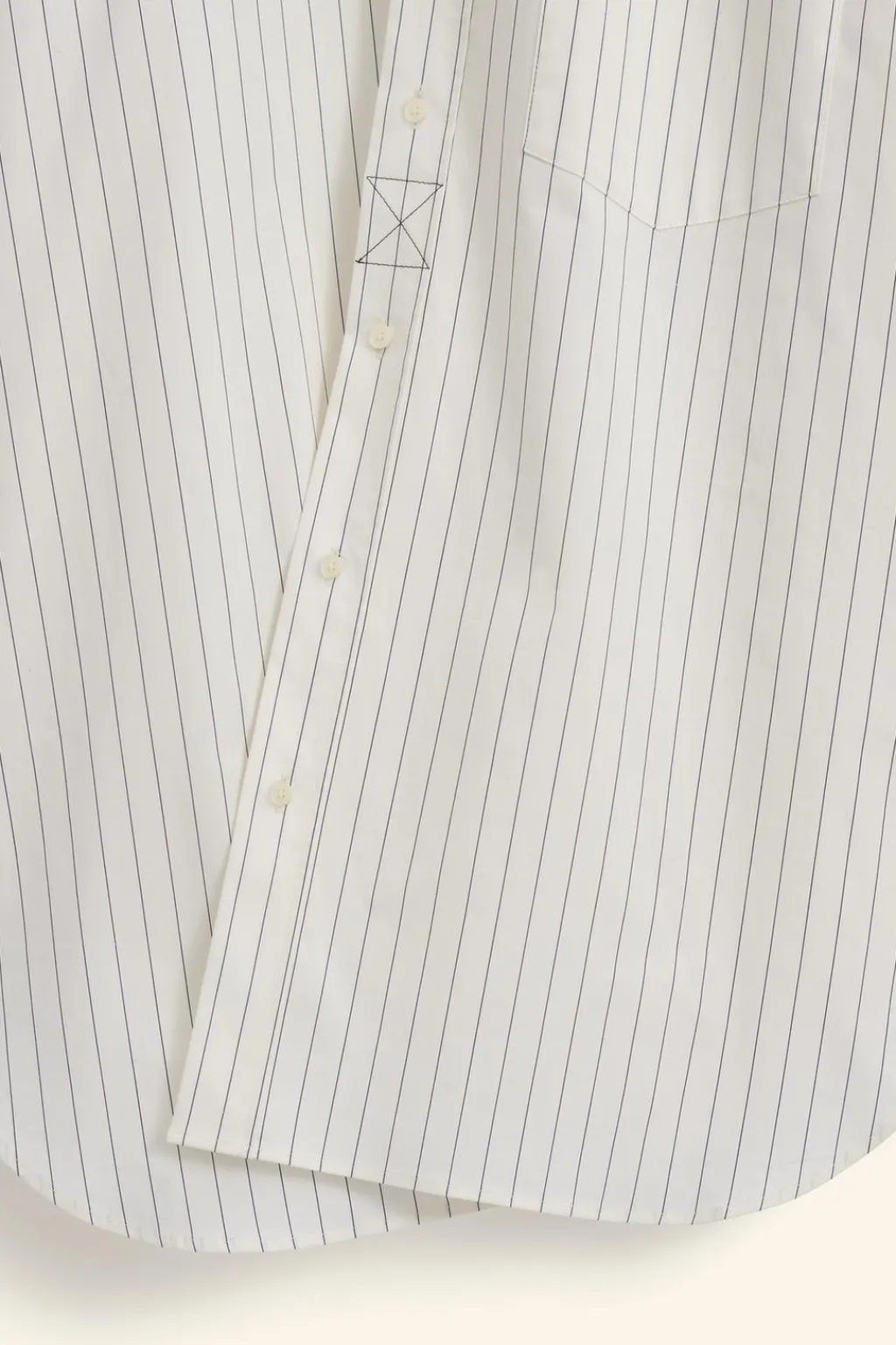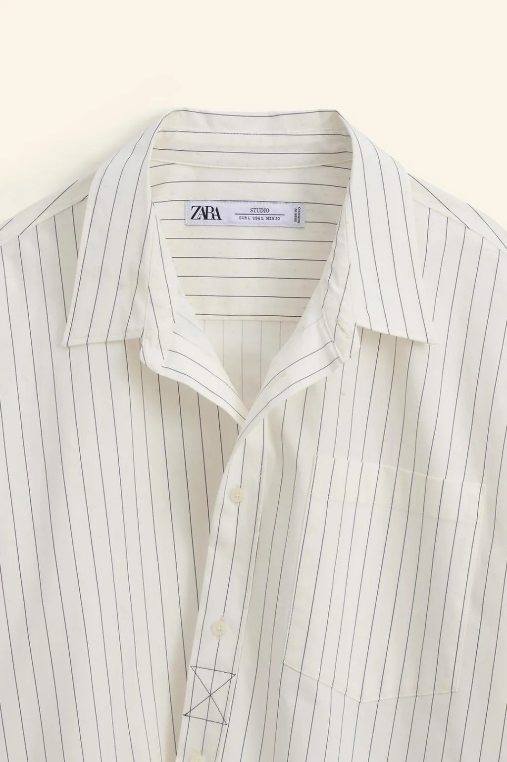 Camisa relaxed fit confeccionada en tejido de algodón con elasticidad. Cuello solapa y manga larga acabada en puño ajustable con botones. Bolsillo plastrón en pecho. Cierre frontal de botonadura cruzada asimétrica.