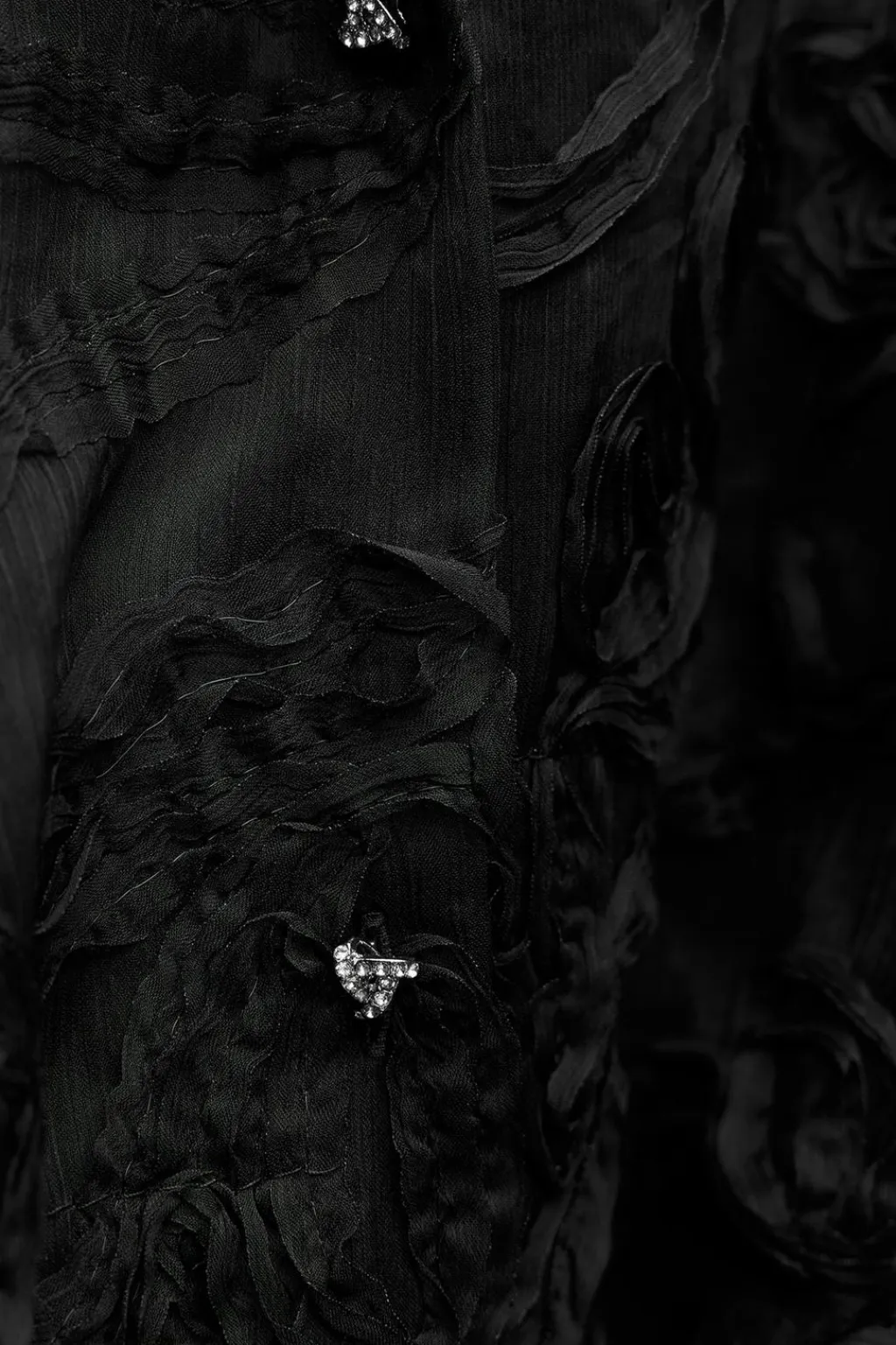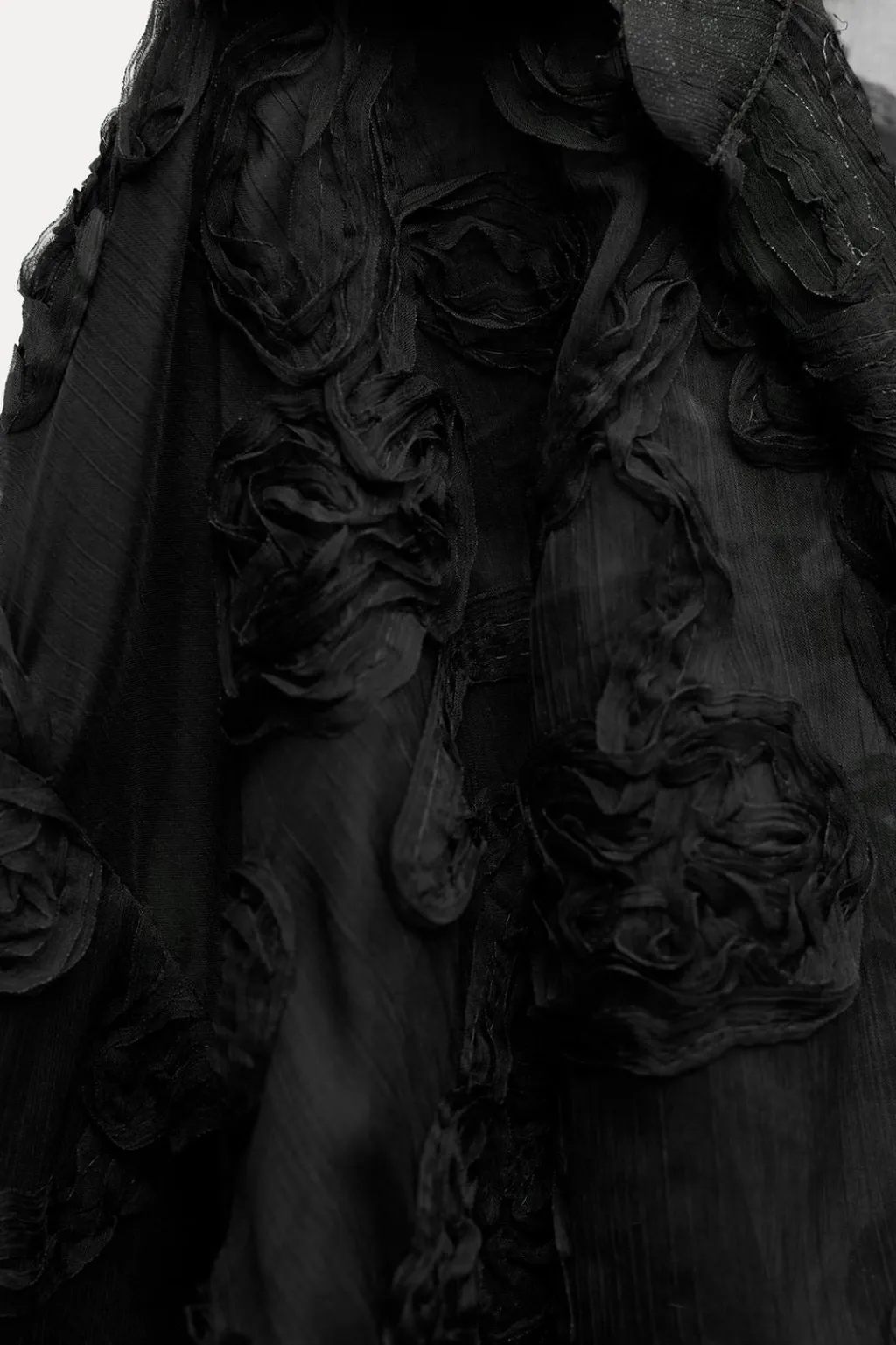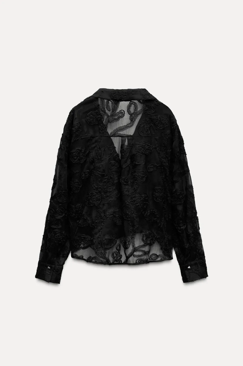 Camisa de cuello solapa con escote pico y manga larga. Detalle de tejido en estructura en forma de flor. Bajo con nudo delantero. Cierre frontal con botones joya.