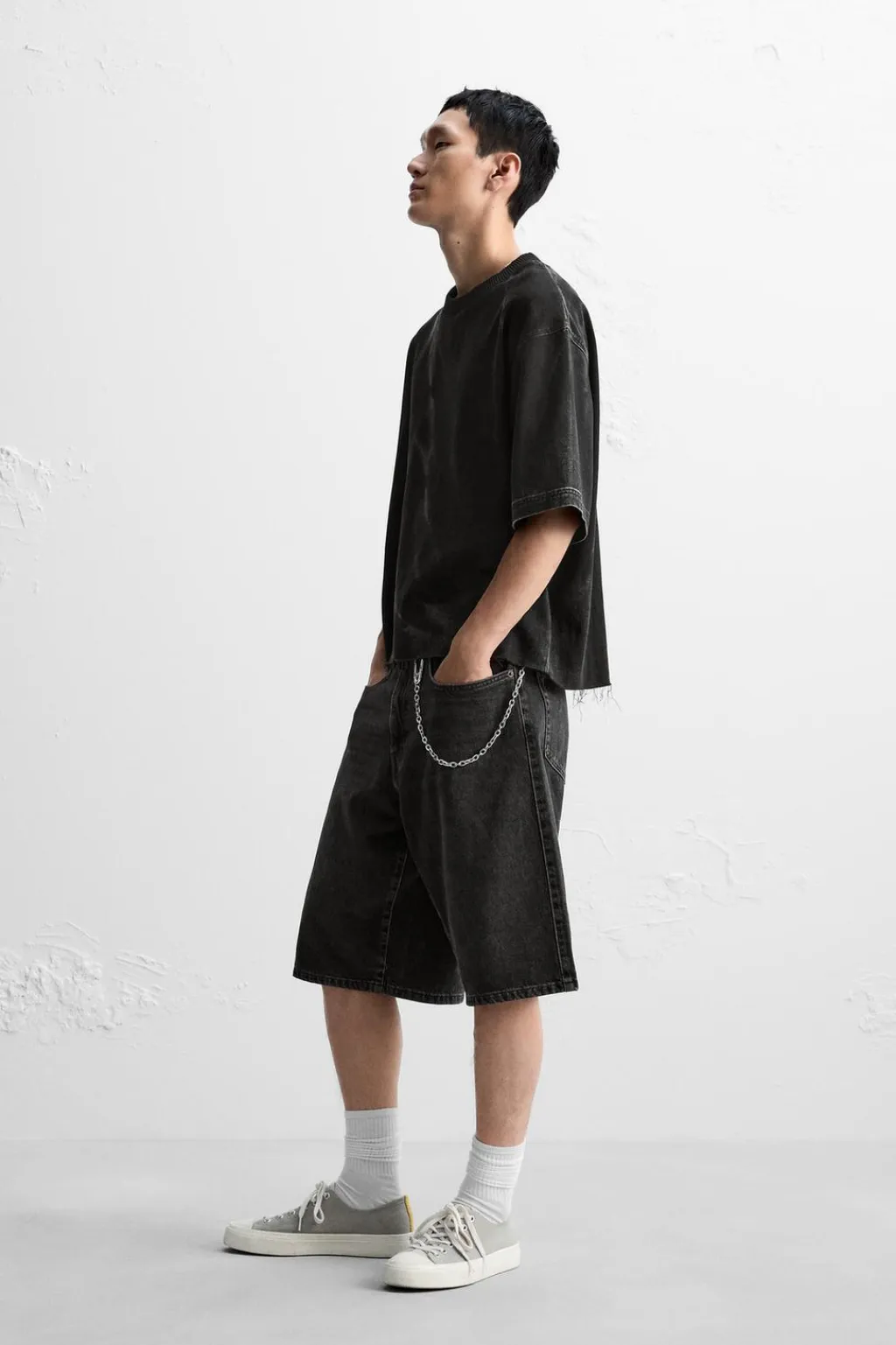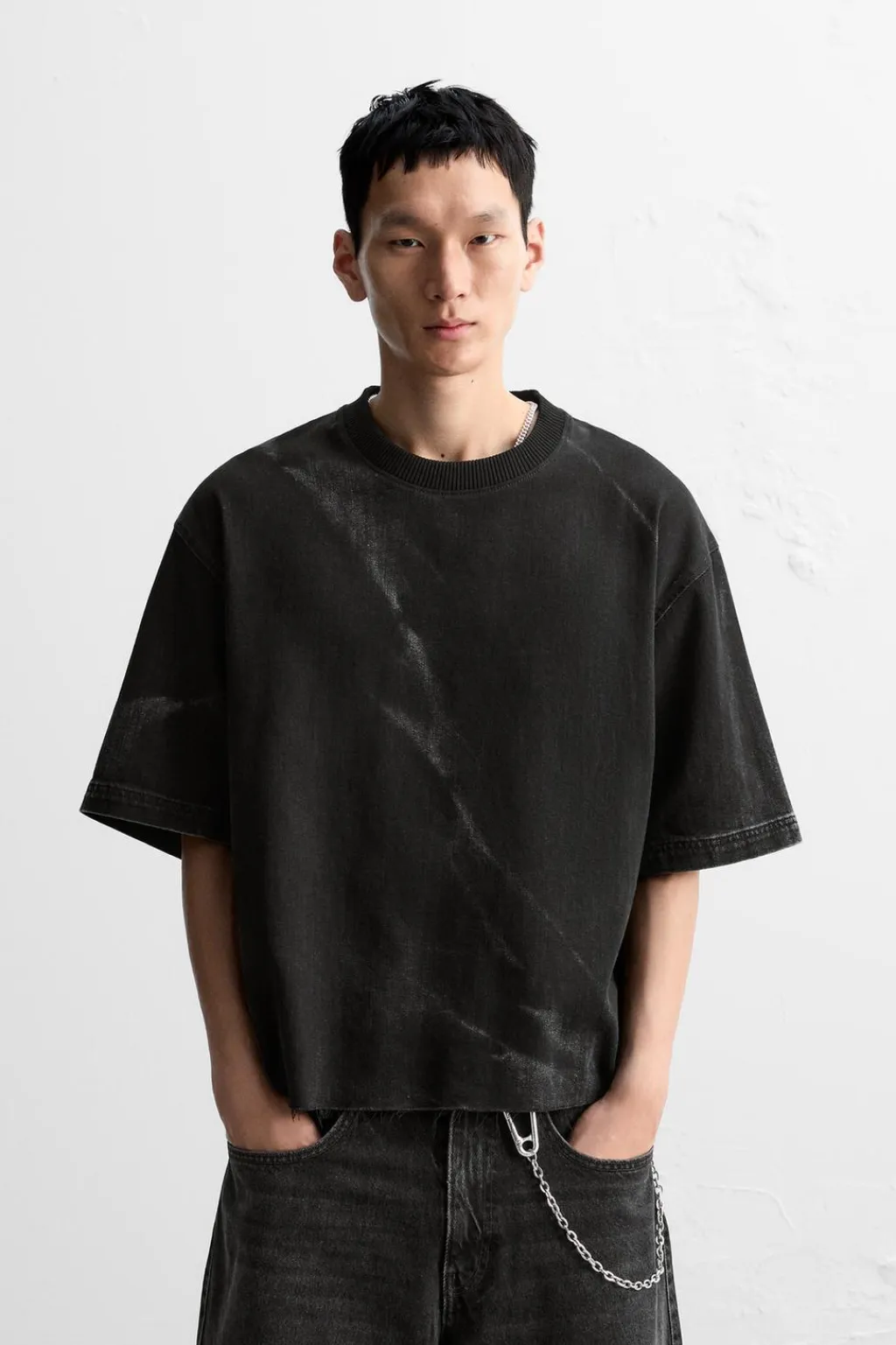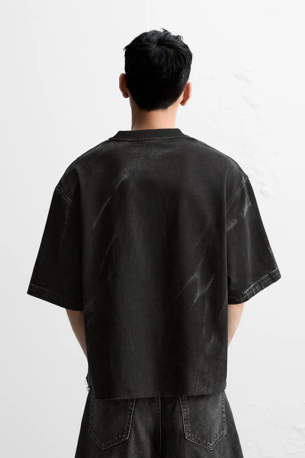 Camiseta relaxed fit confeccionada en denim de algodón. Cuello redondo y manga corta. Efecto lavado. Acabados irregulares.
