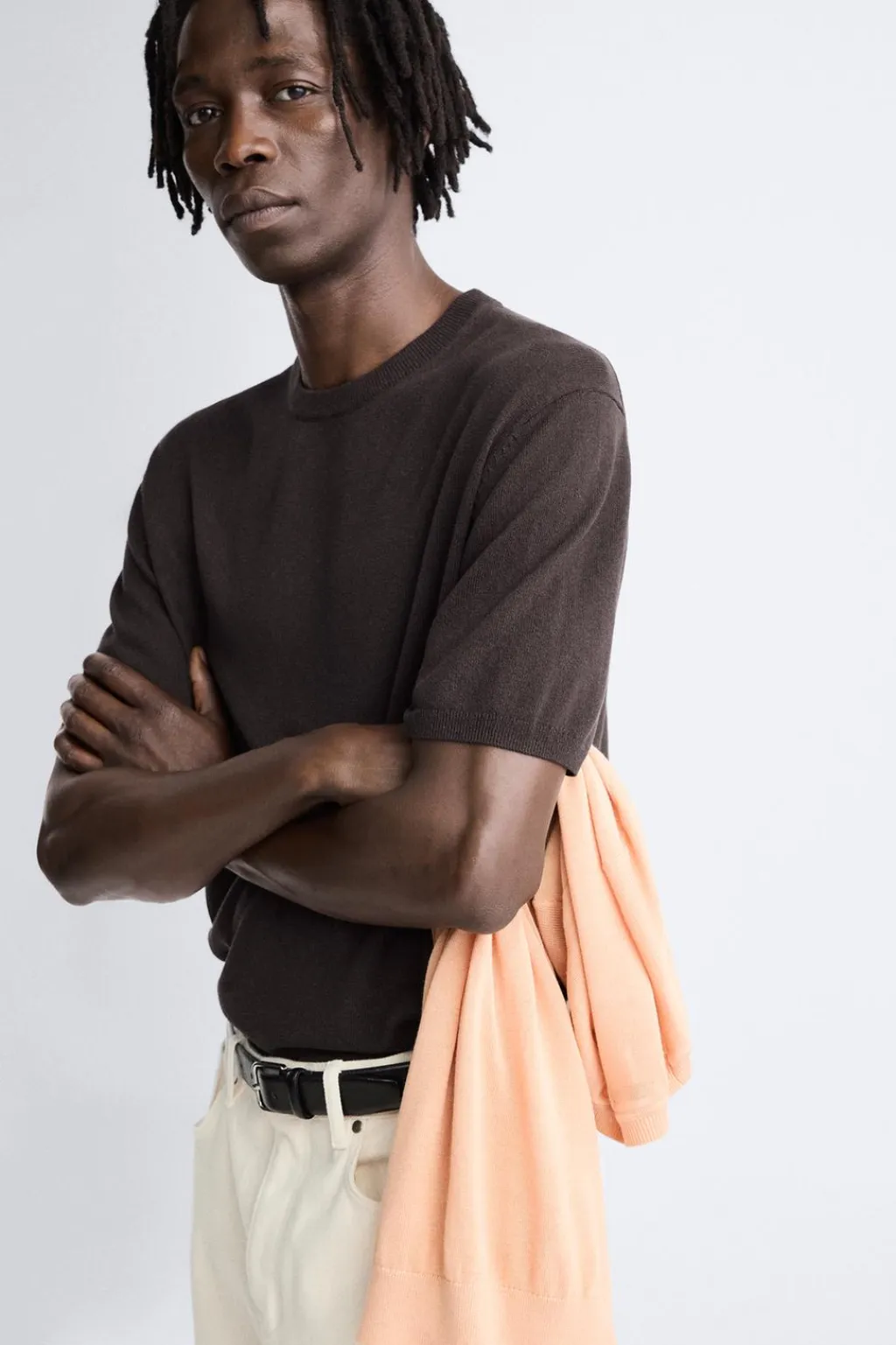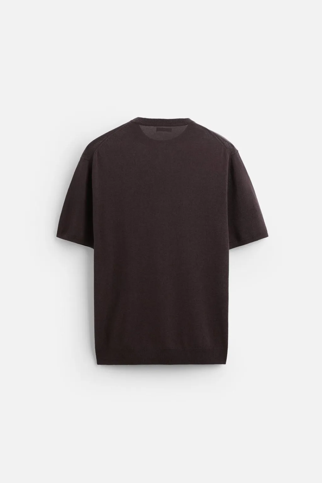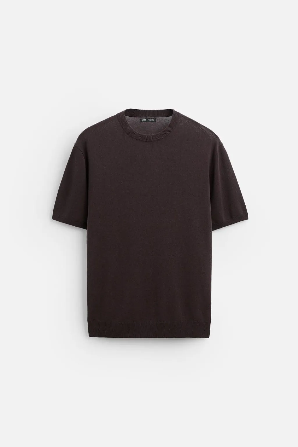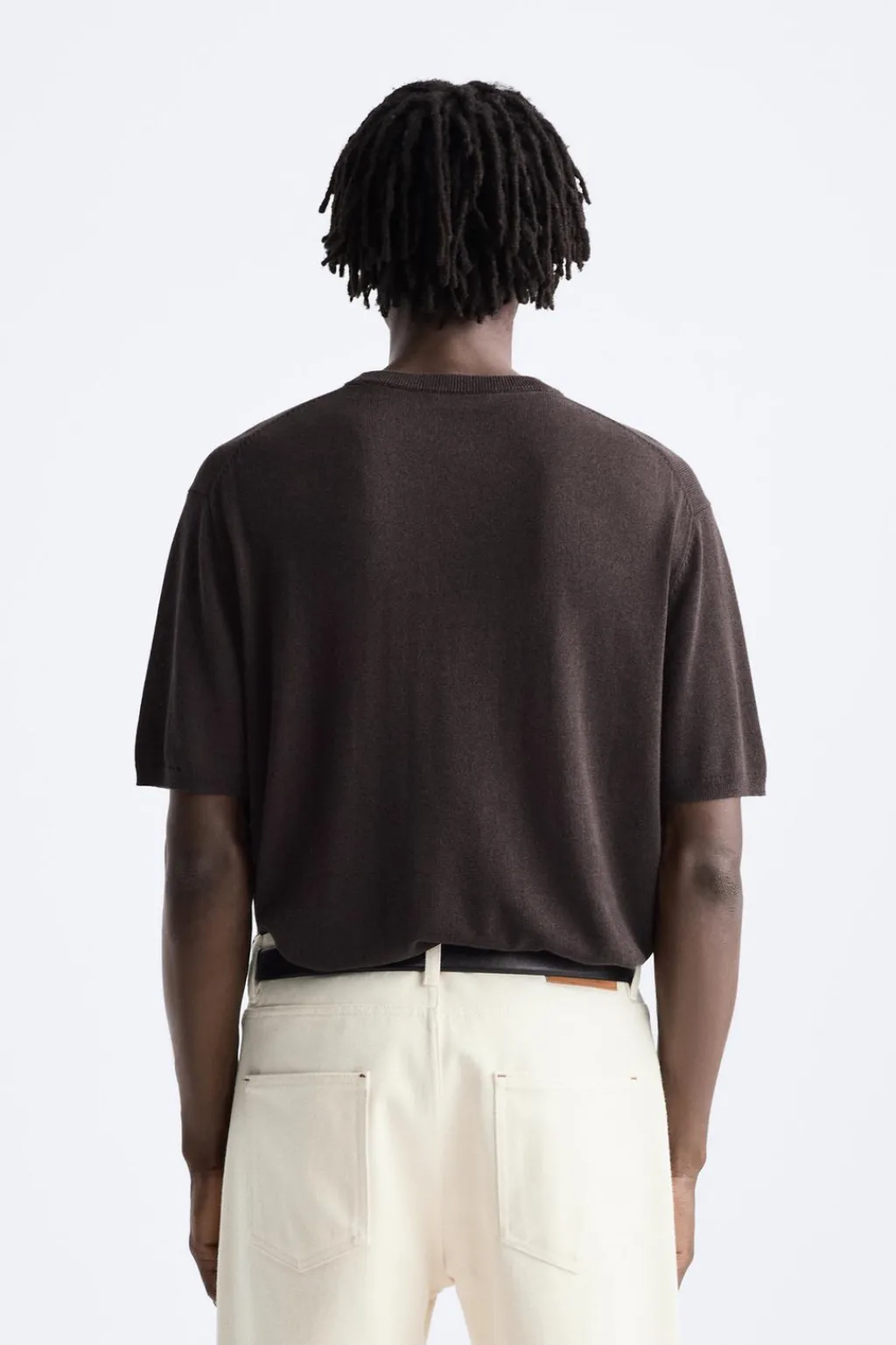 Camiseta de punto tejida en hilatura con mezcla de lyocell y lino. Cuello redondo y manga corta. Acabados en rib.