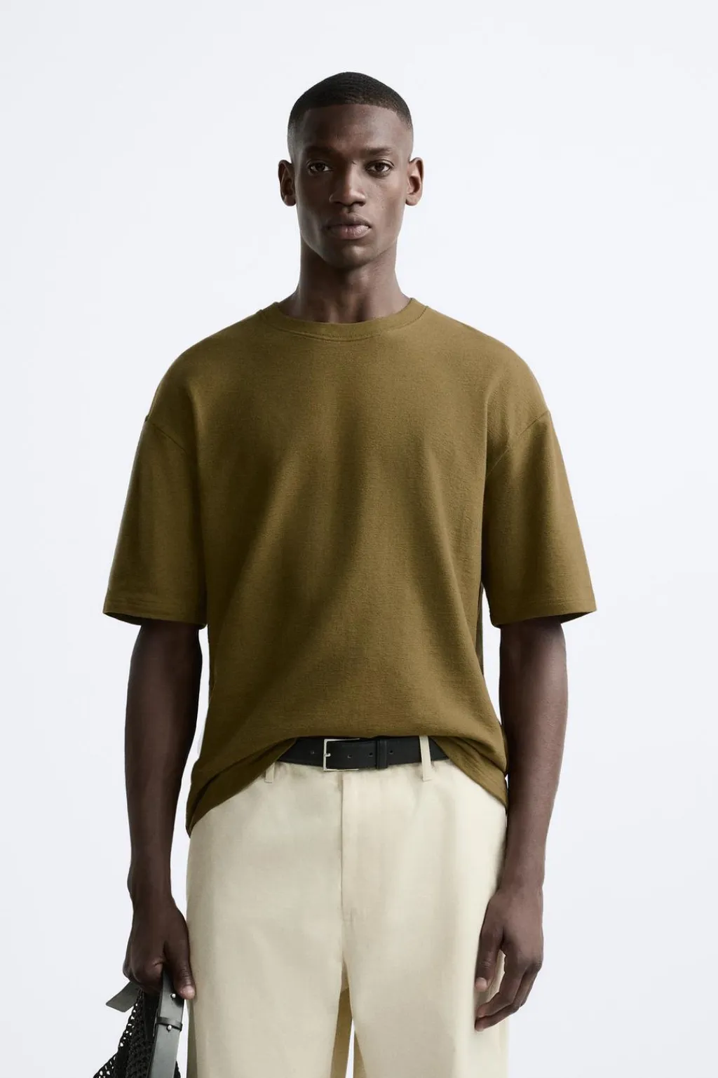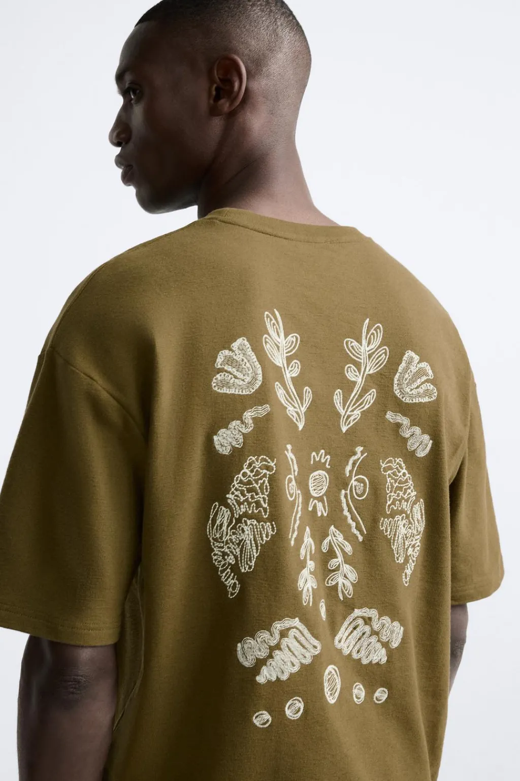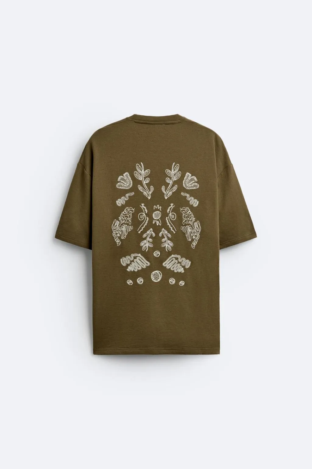Camiseta relaxed fit confeccionada en tejido de algodón con estructura irregular. Cuello redondo y manga corta. Bordados combinados a contraste en espalda.