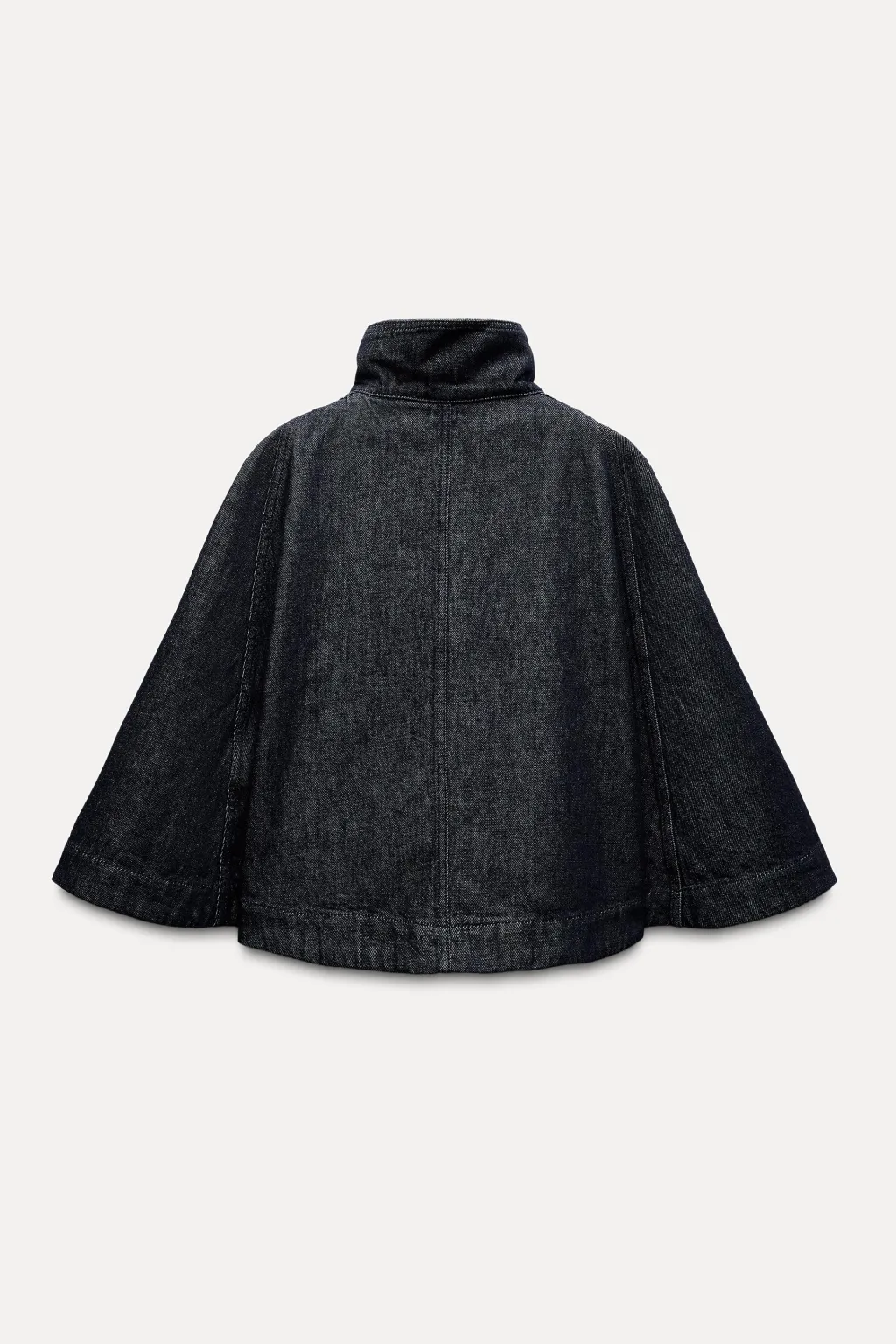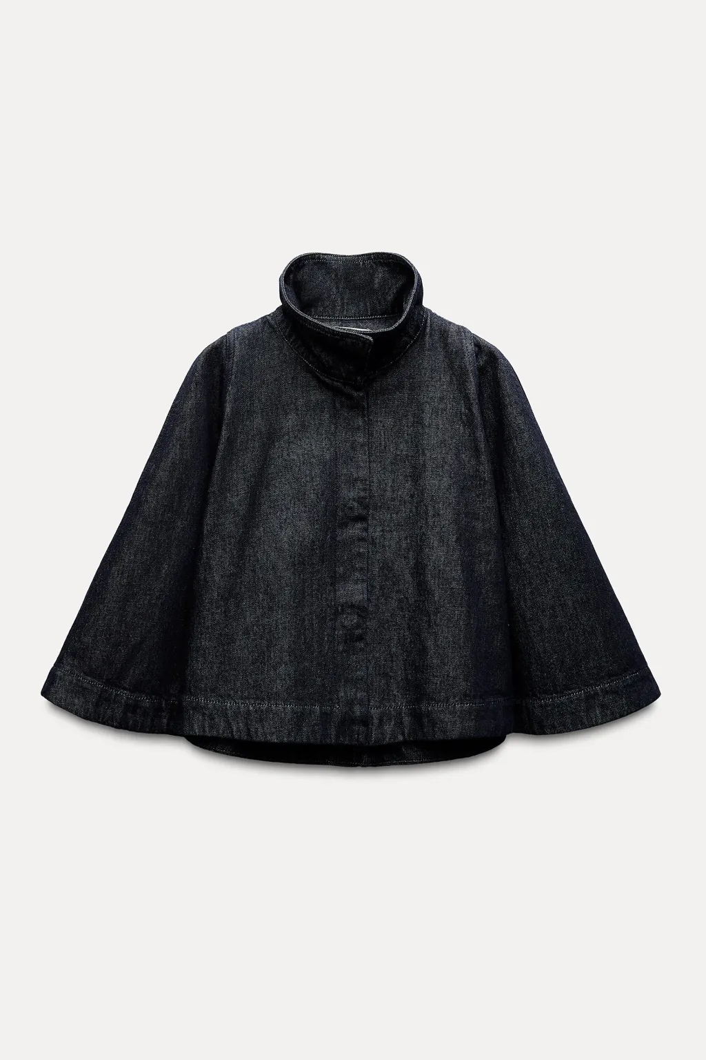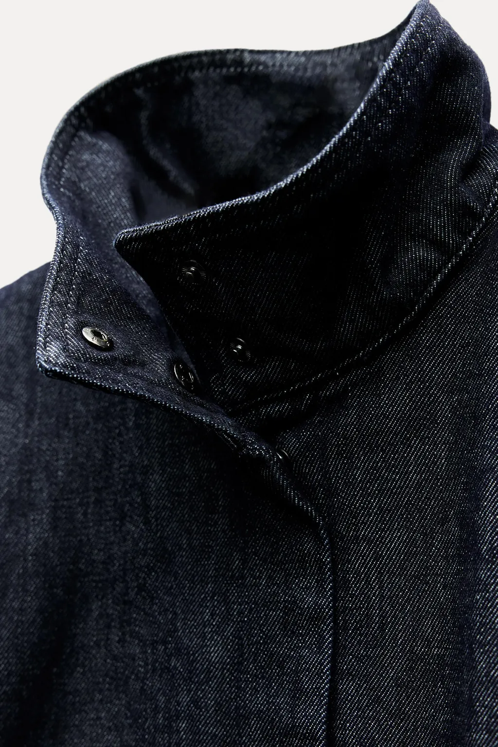 Capa confeccionada en tejido denim de cuello subido. Cierre frontal con botones a presión ocultos por sopata.