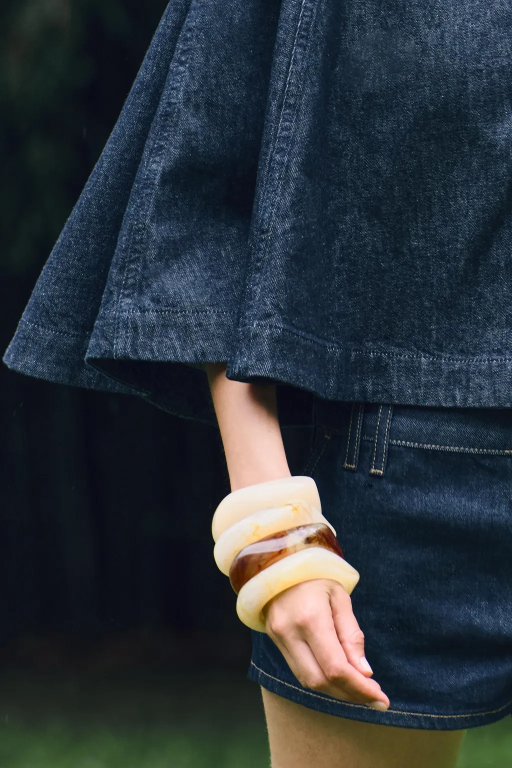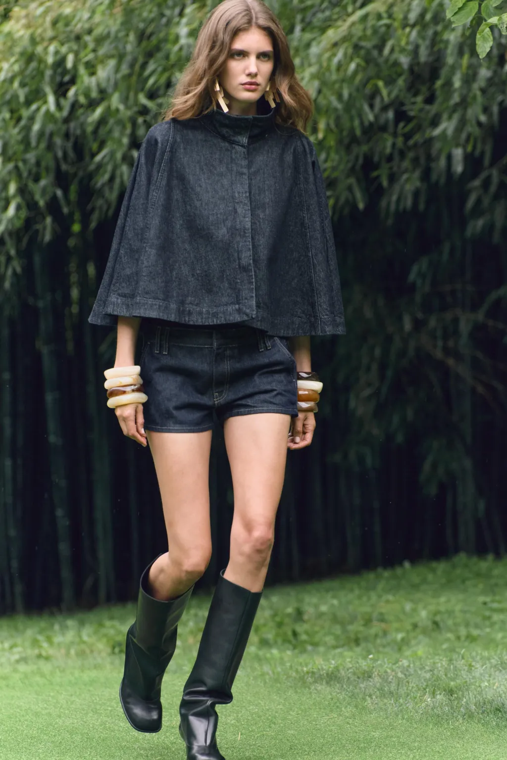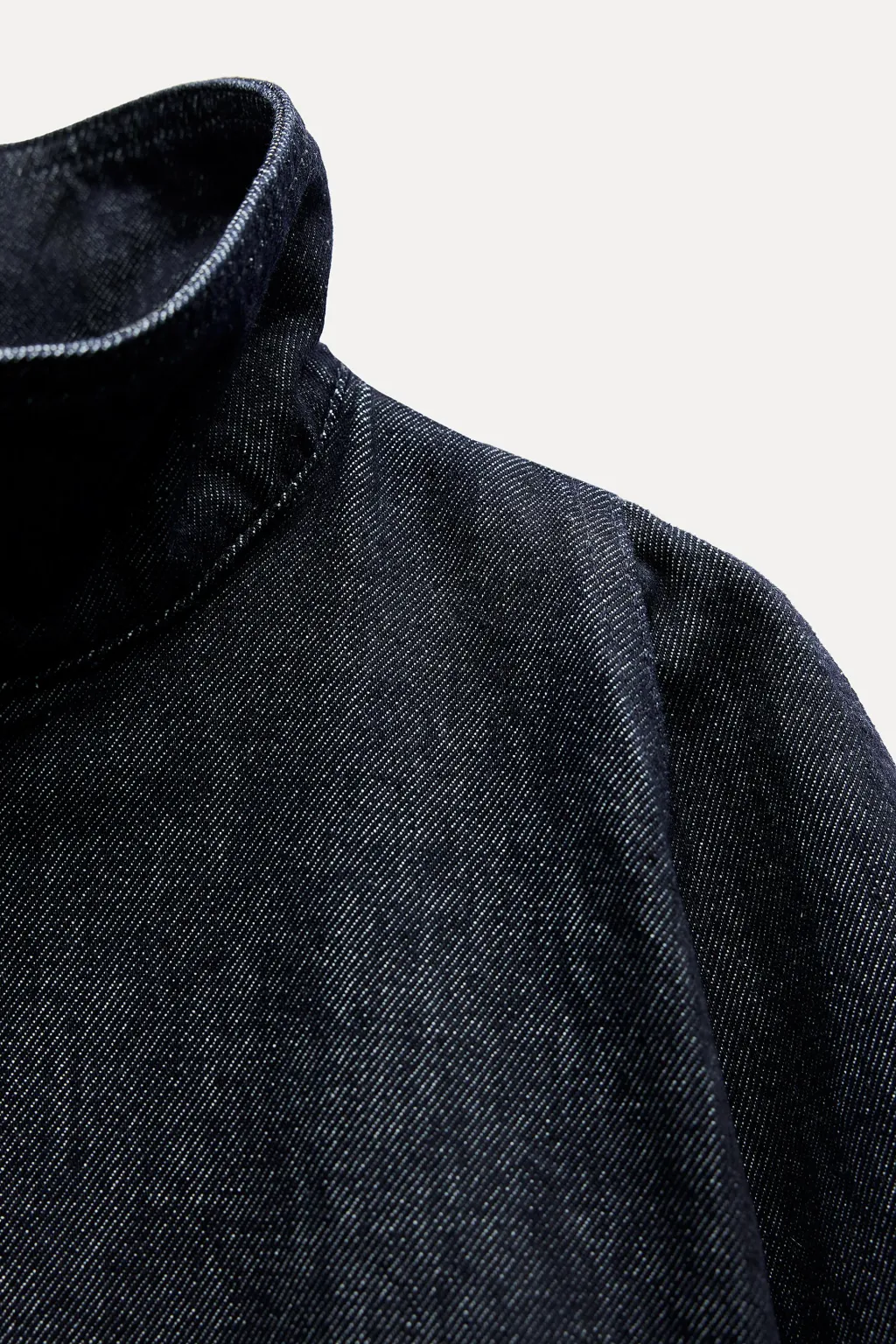 Capa confeccionada en tejido denim de cuello subido. Cierre frontal con botones a presión ocultos por sopata.