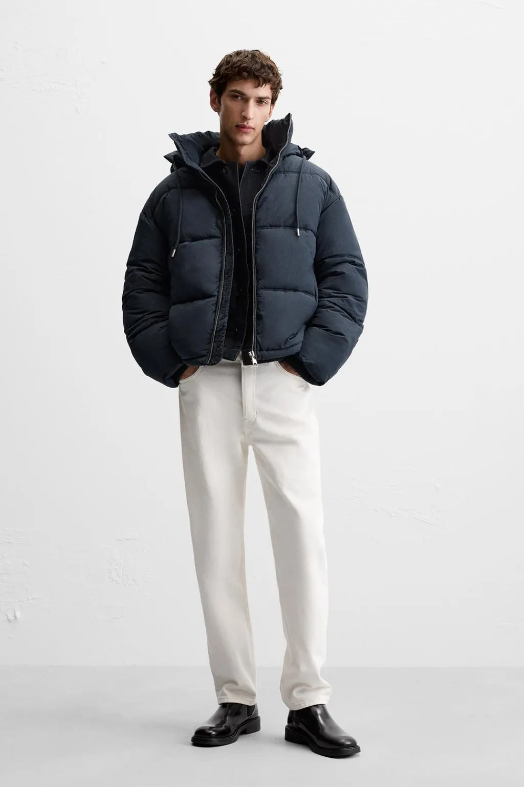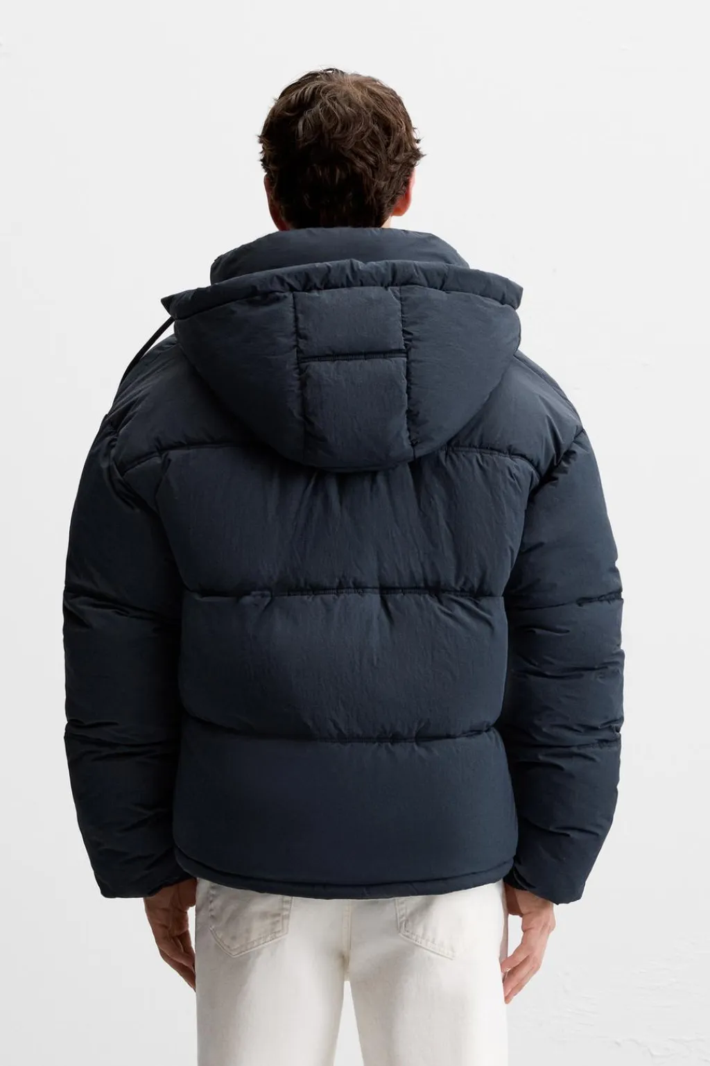 Cazadora relaxed fit confeccionada en tejido técnico. Cuello subido con capucha ajustable. Manga larga acabada en puño con el interior de rib. Bolsillos de vivo en cadera y detalle de bolsillo interior. Cierre frontal con cremallera.