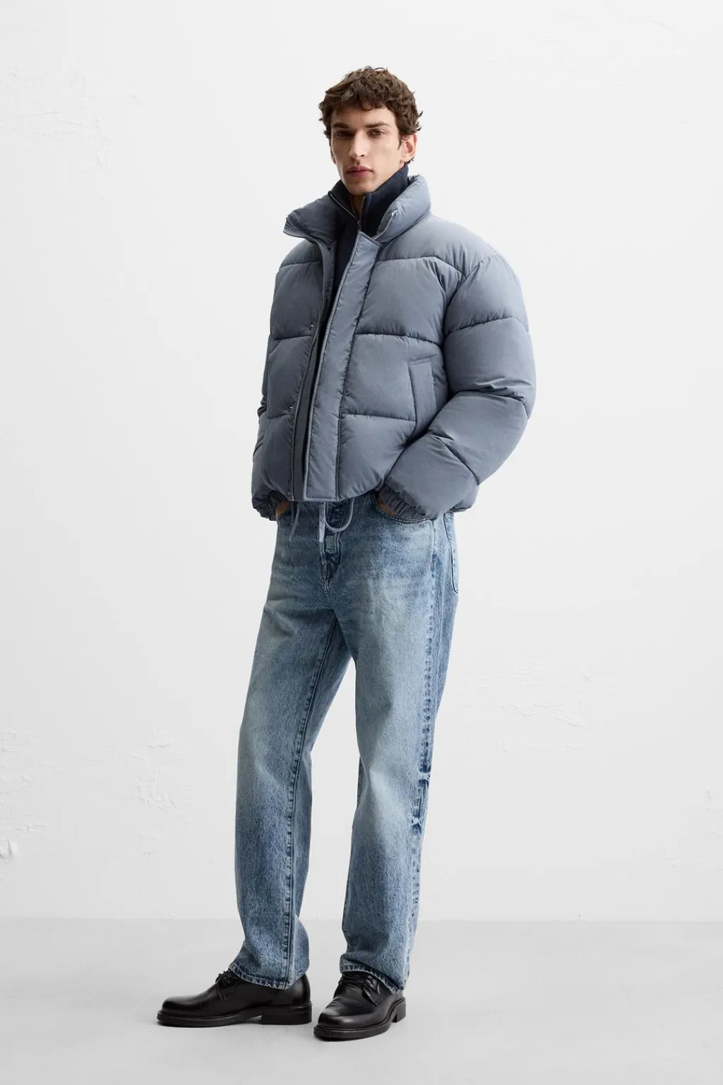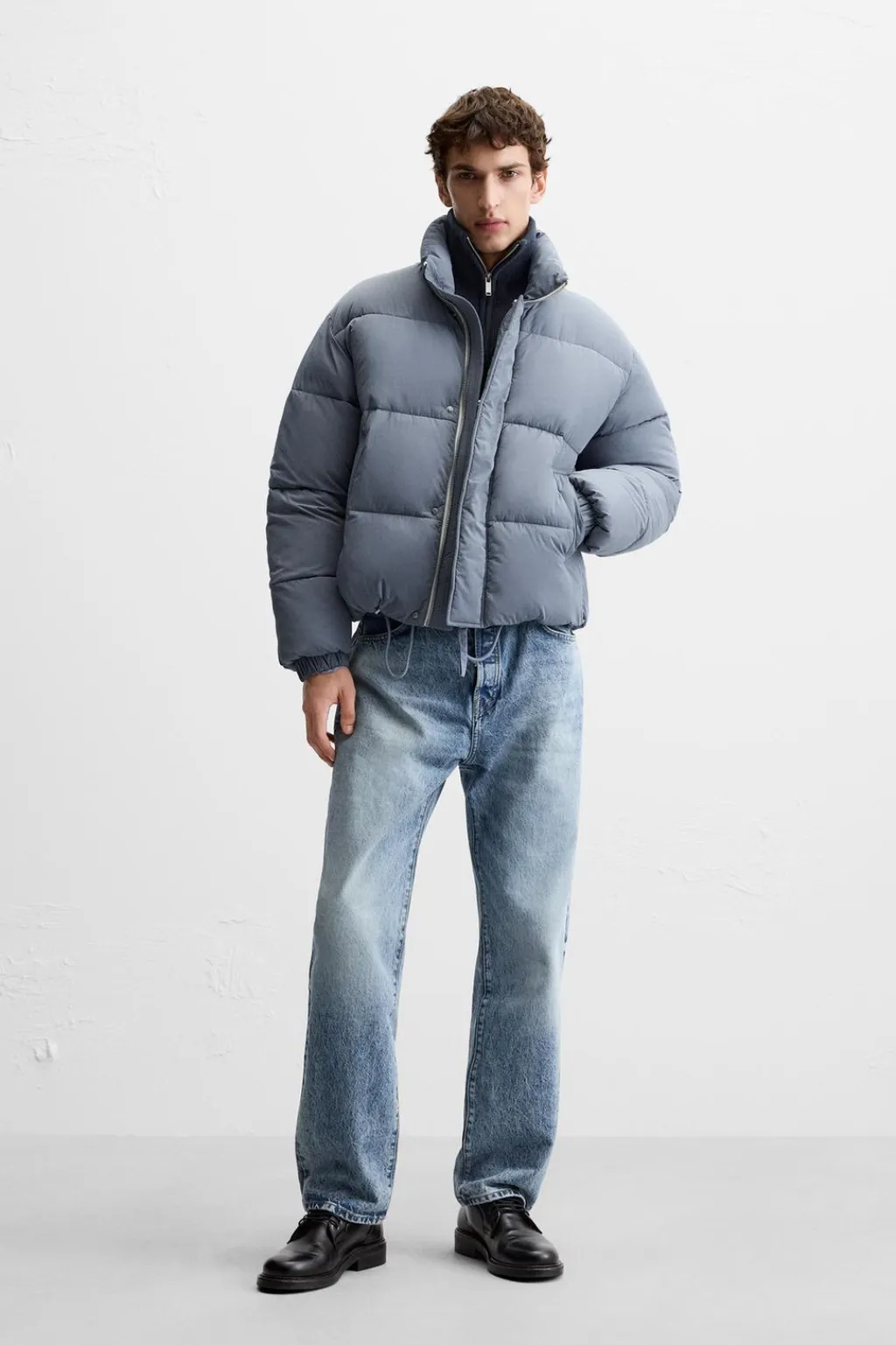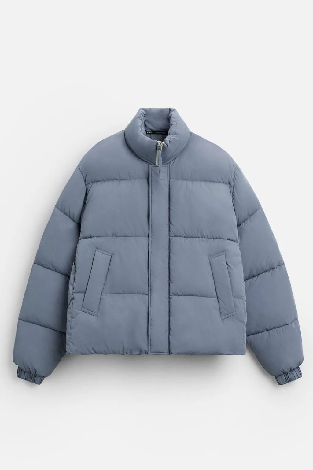 Cazadora acolchada boxy fit. Cuello subido y manga larga acabada en puño con elástico. Bolsillos de vivo en cadera y detalle de bolsillo interior. Cierre frontal con cremallera oculta por solapa con botones a presión.
