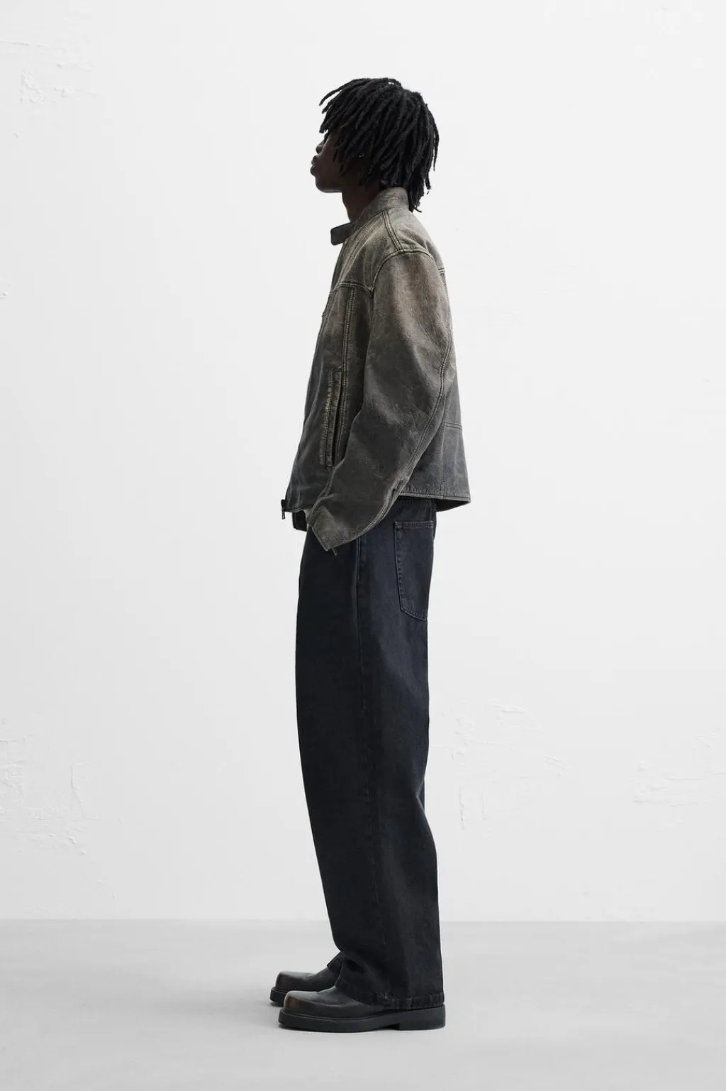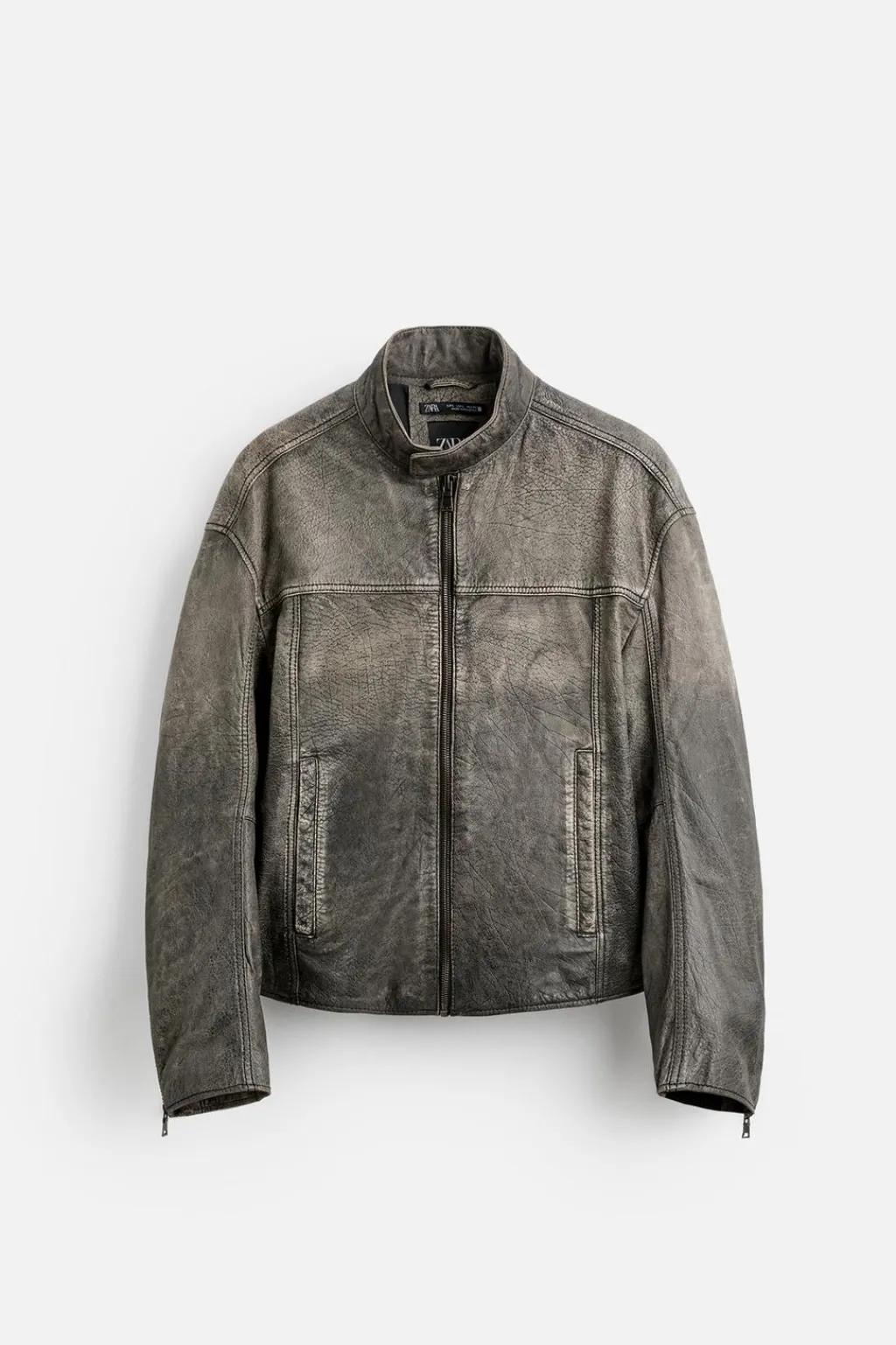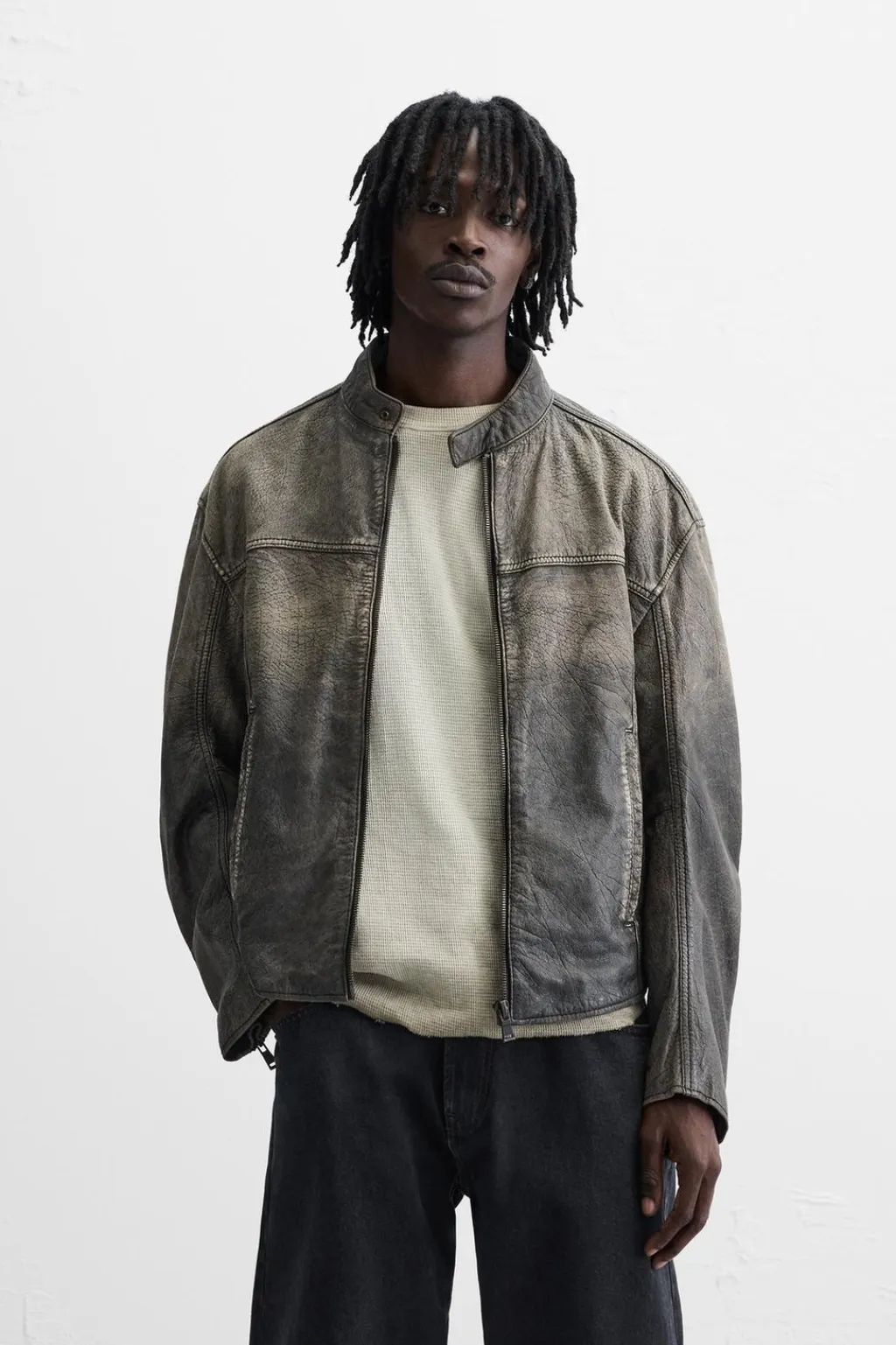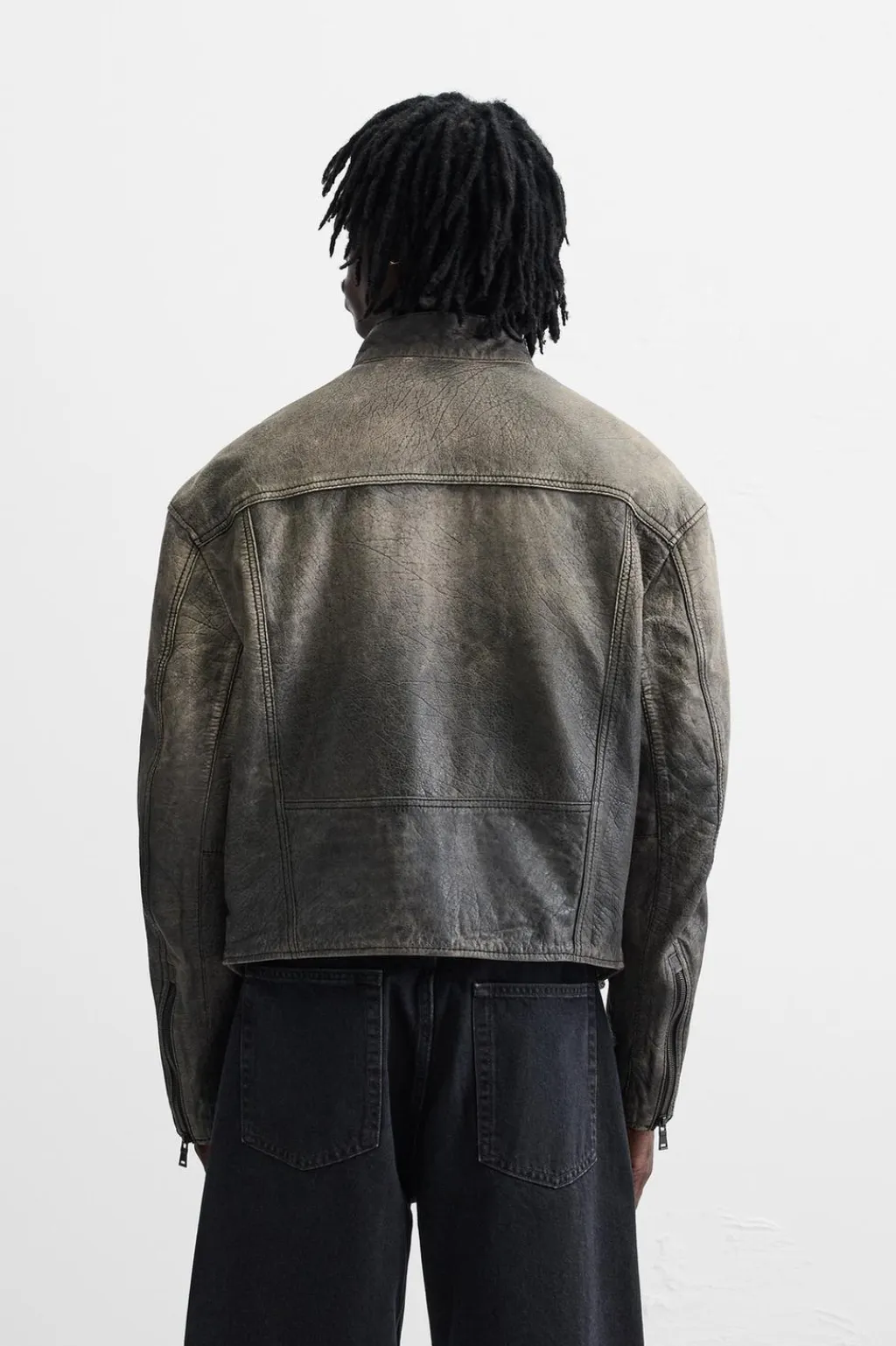 Cazadora cropped fit confeccionada en piel con acabado lavado. Cuello tira y manga larga acabada en puño ajustable con cremallera. Bolsillos de vivo en cadera. Cierre frontal con cremallera.