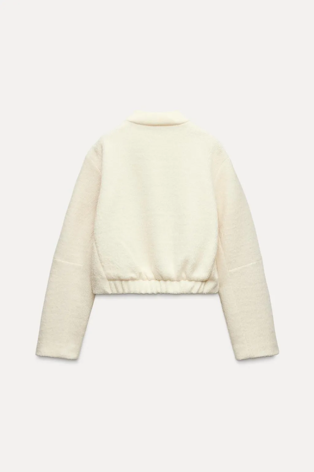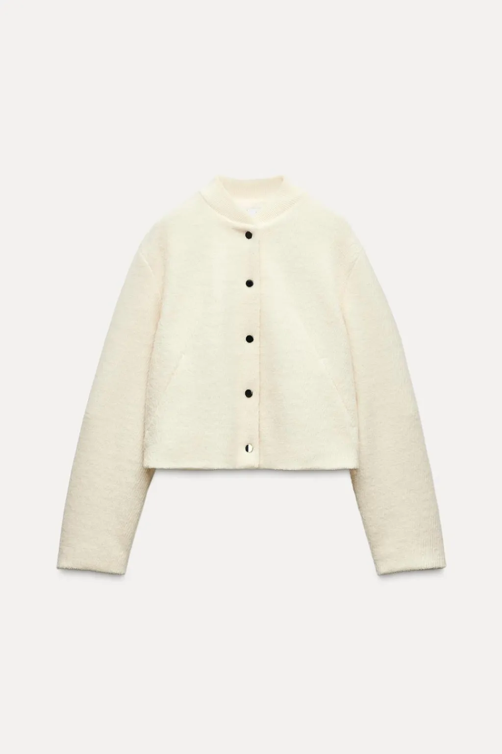 Cazadora estilo bomber de cuello redondo y manga larga. Bolsillos delanteros. Bajo con elástico en espalda. Cierre frontal con botones a presión.