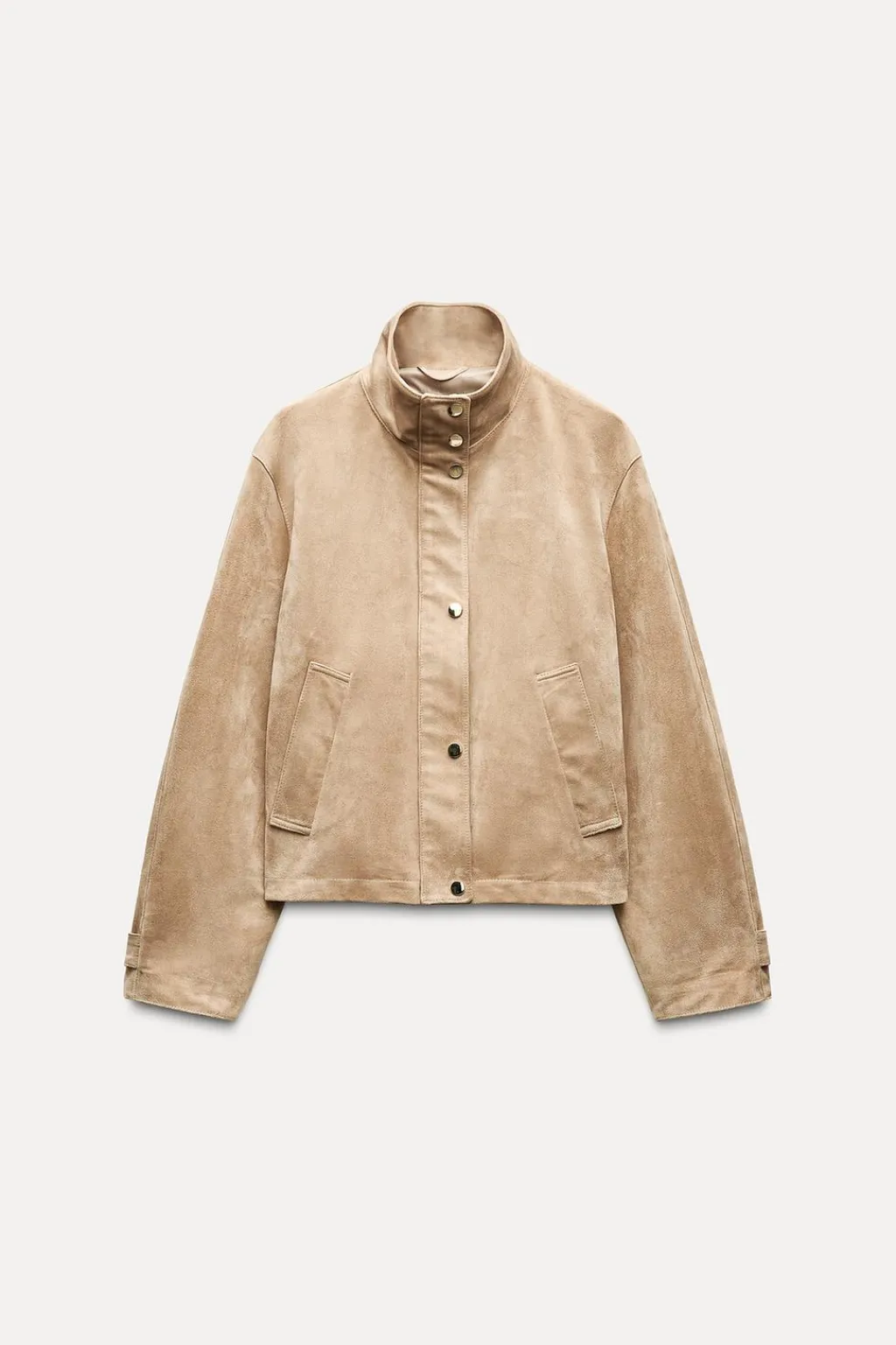 Cazadora de cuello alto y manga larga. Bolsillos delanteros de vivo. Bajo acabado con elástico en espalda. Cierre frontal con cremallera oculta y botones a presión.