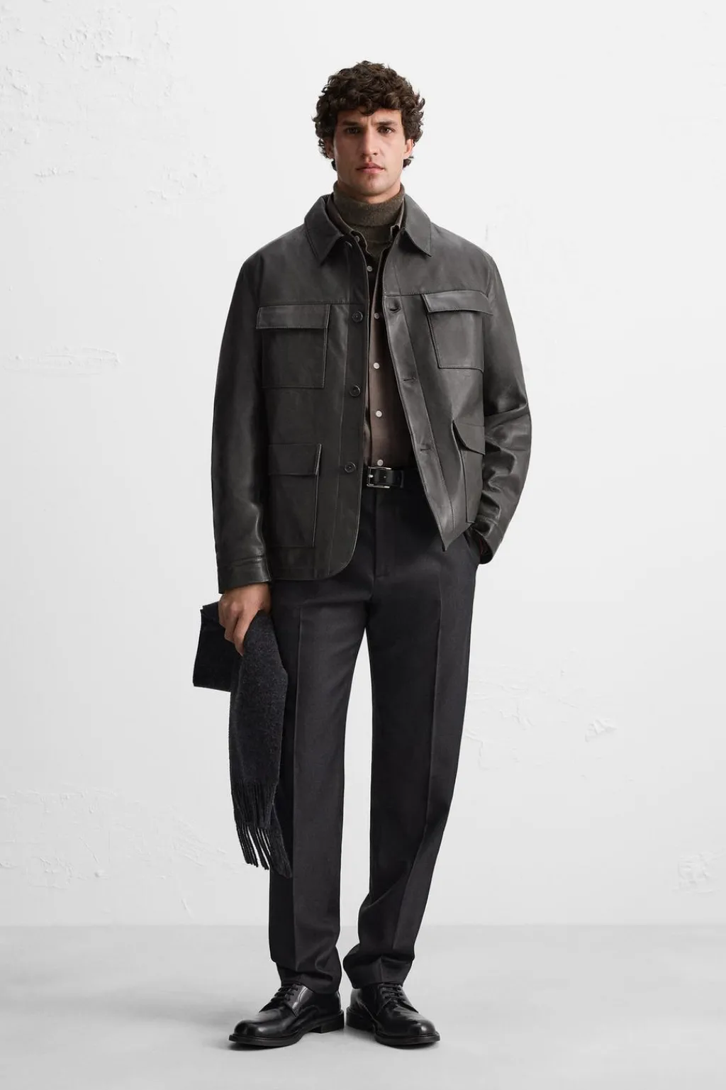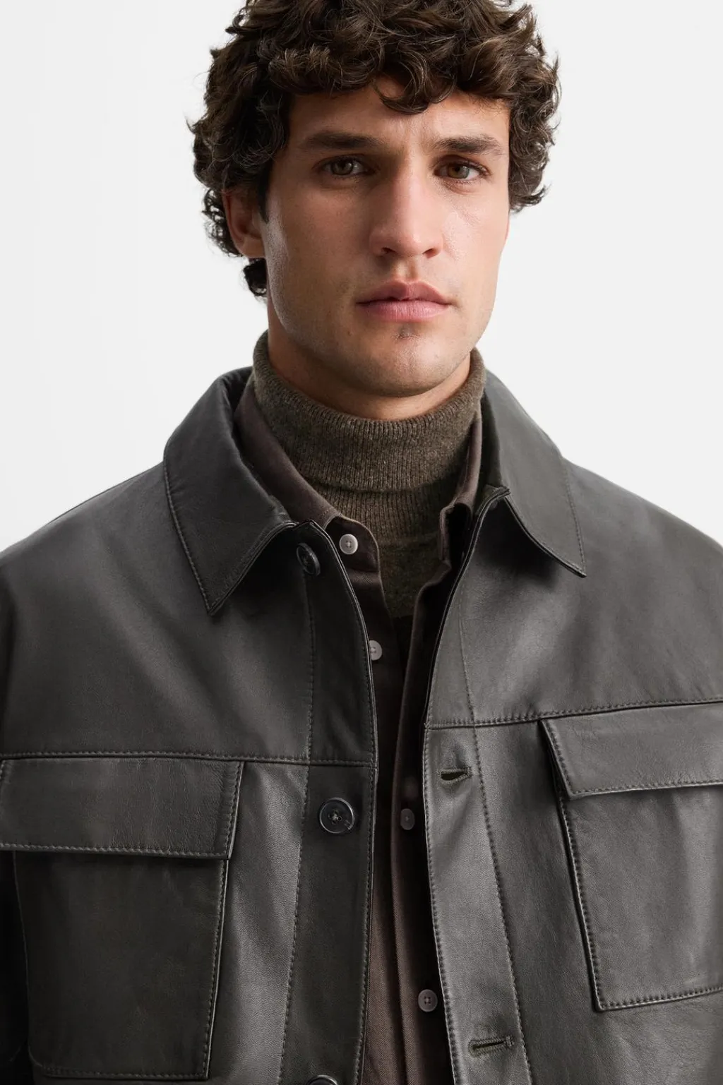 Cazadora regular fit confeccionada en piel. Cuello solapa y manga larga. Bolsillos plastrón con solapa en delantero. Cierre frontal de botonadura.