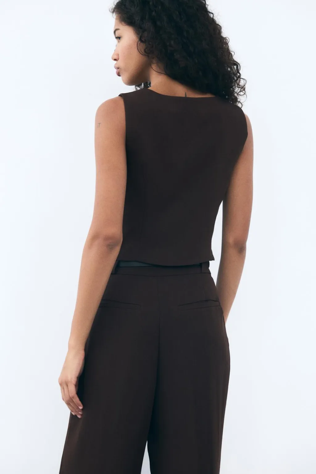 Chaleco de cuello pico y manga sisa. Forro interior. Bajo con aberturas laterales. Cierre frontal con botones.