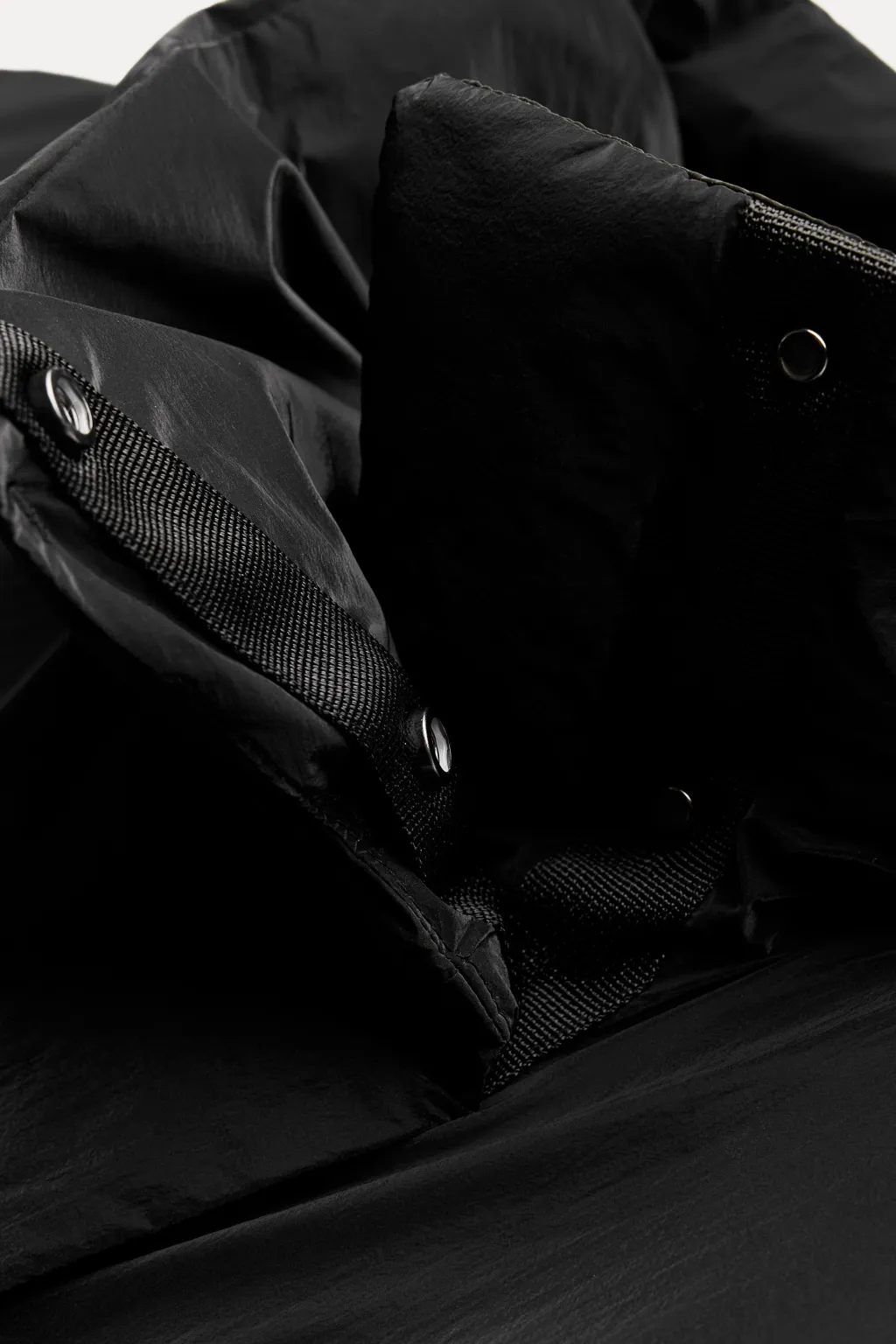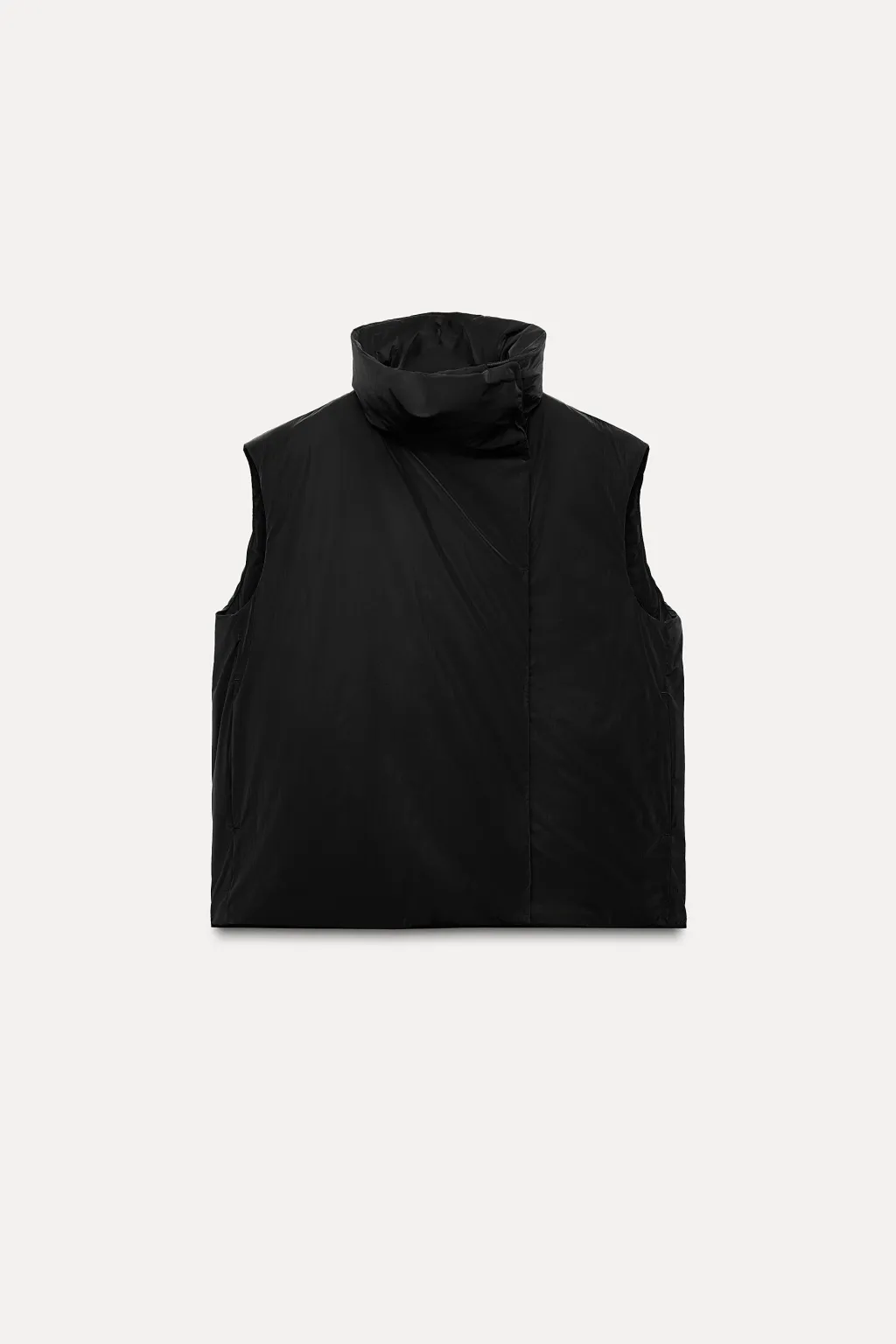 Chaleco amplio de cuello alto y manga sisa. Bolsillos laterales ocultos en costura. Cierre frontal cruzado con botones a presión.