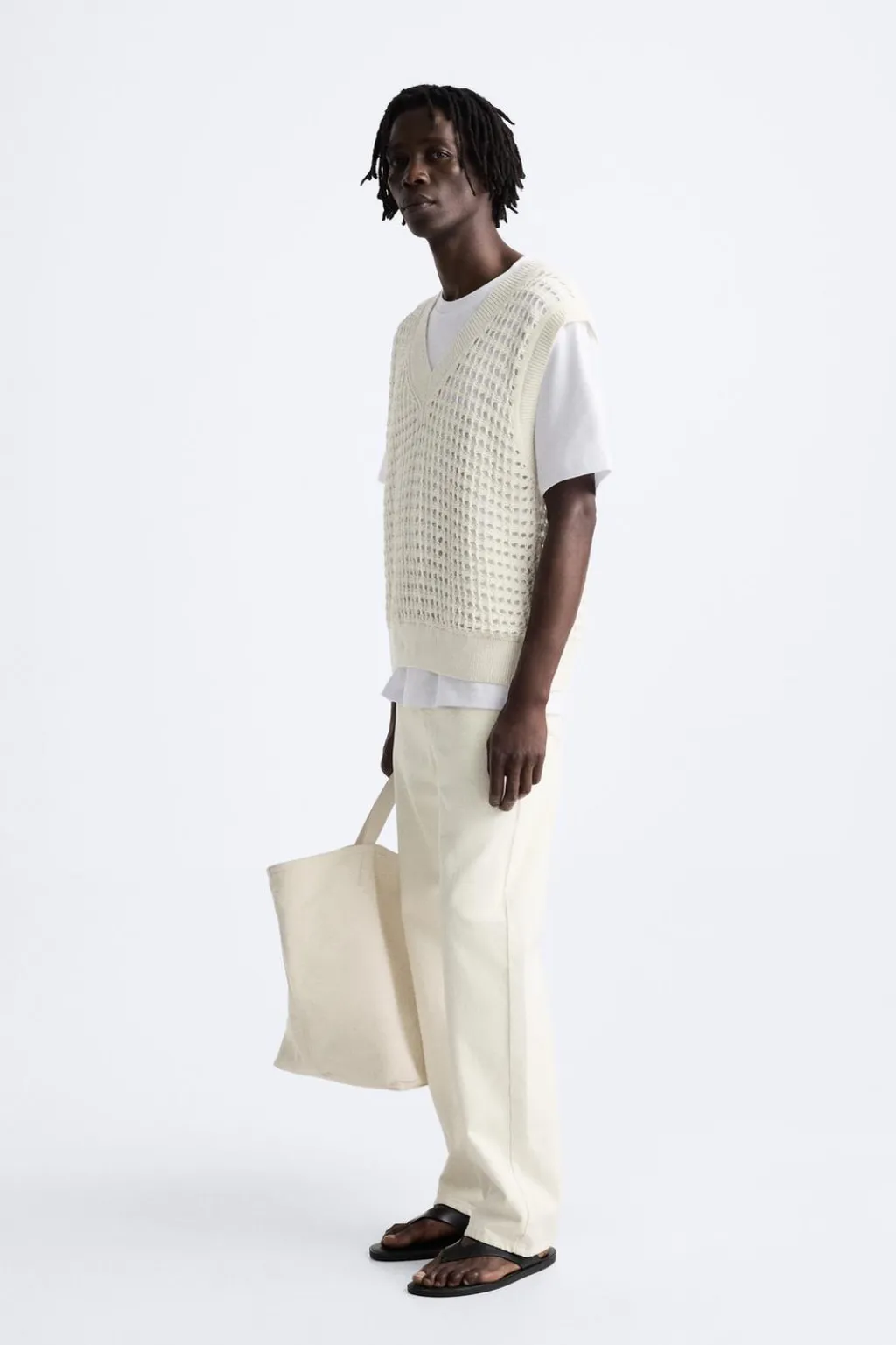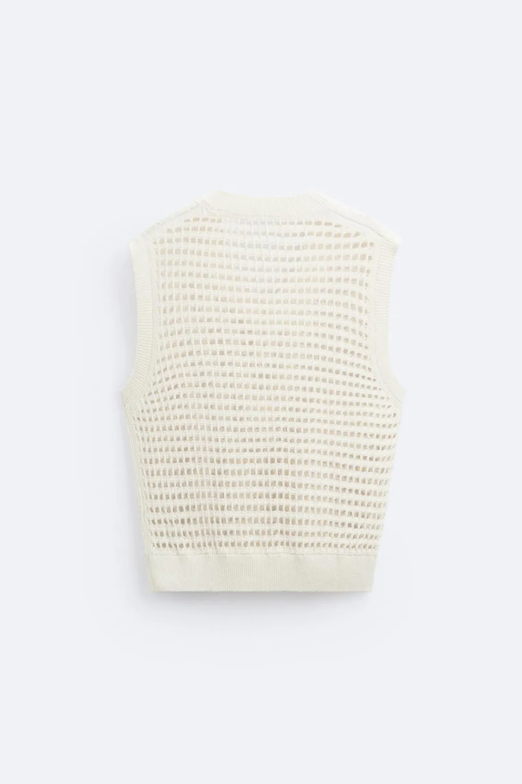 Chaleco de punto tejido con estructura abierta. Cuello pico y manga sisa. Acabados en rib.