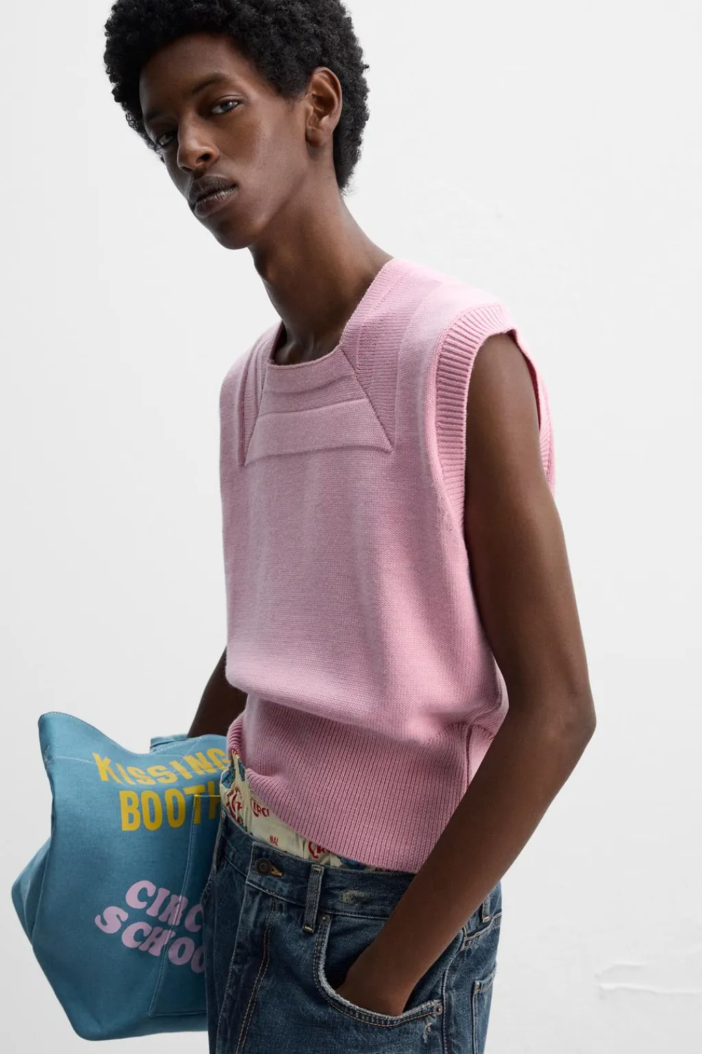 Chaleco de punto cropped fit tejido en hilatura con lana. Cuello cuadrado y manga sisa. Acabados en rib.