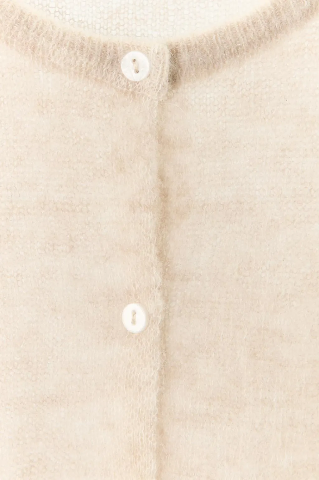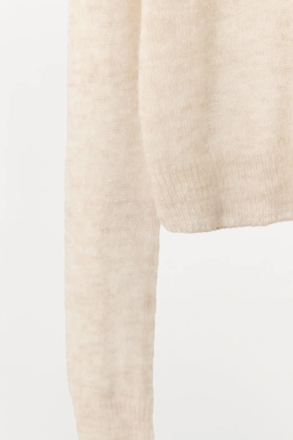 Chaqueta corta de punto fino confeccionada con lana 30% y alpaca 30%. Cuello redondo y manga larga. Cierre frontal con botones.