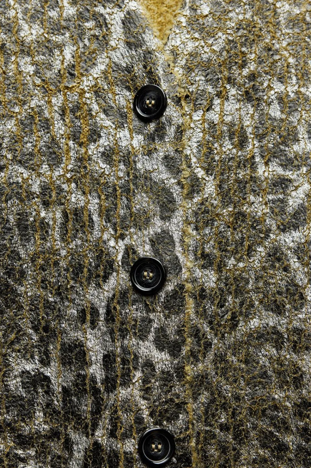 Chaqueta de escote pico y manga larga. Detalle con tejido estampado metalizado. Cierre frontal con botones.