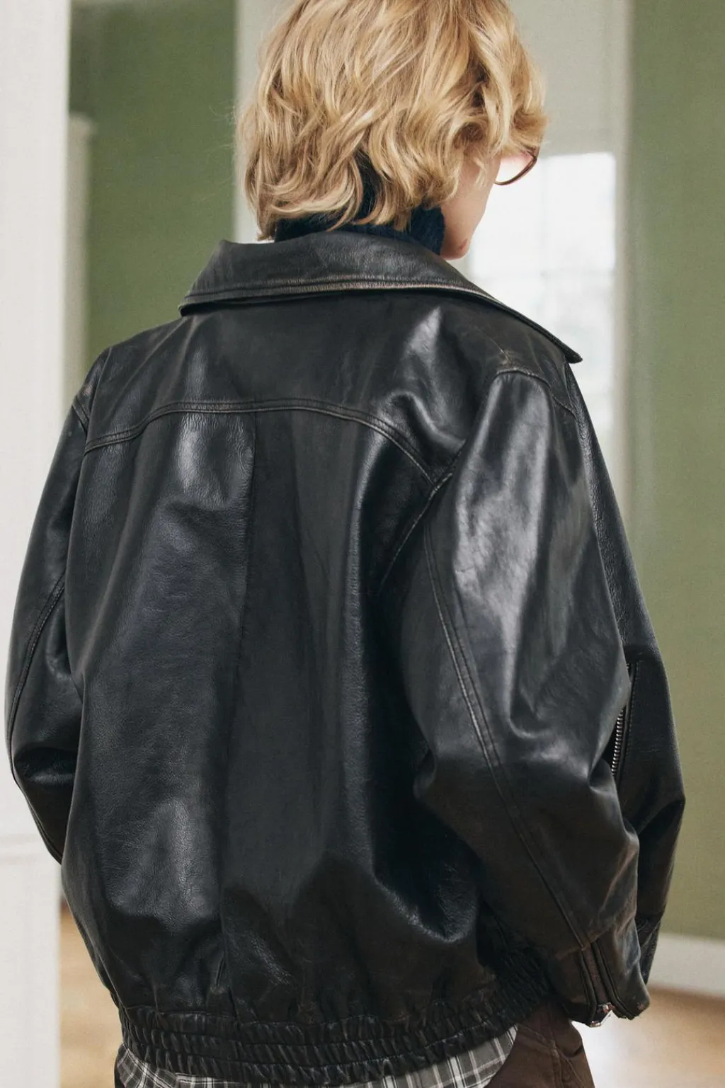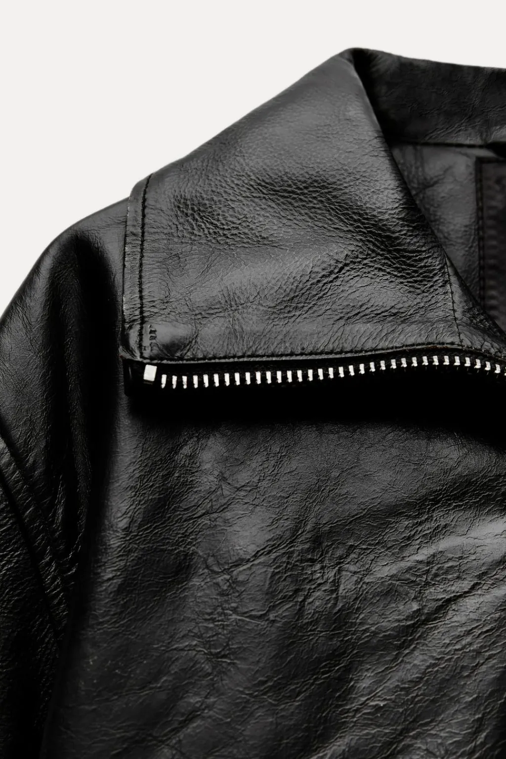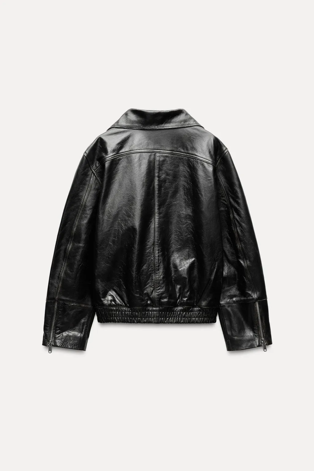 Chaqueta amplia realizada en piel 100%. Cuello solapa y manga larga acabada en cremalleras. Bajo acabado en elástico. Forro interior a tono. Cierre frontal con cremallera metálico.