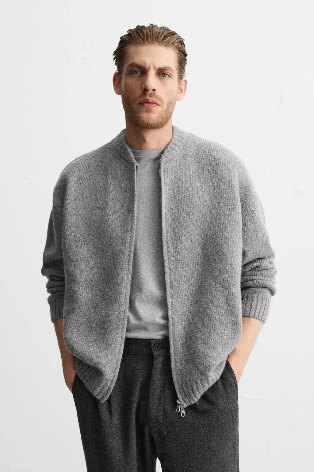 Chaqueta relaxed fit. Cuello acabado en rib elástico y manga larga. Bolsillos de vivo en cadera. Acabados en rib. Cierre frontal de cremallera.