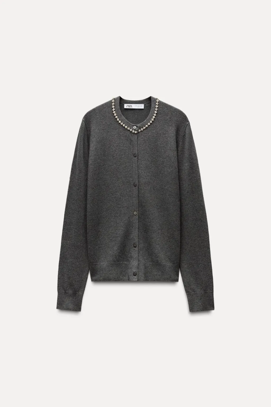 Chaqueta de cuello redondo con aplicación de abalorios joya y manga larga. Cierre frontal con botones.