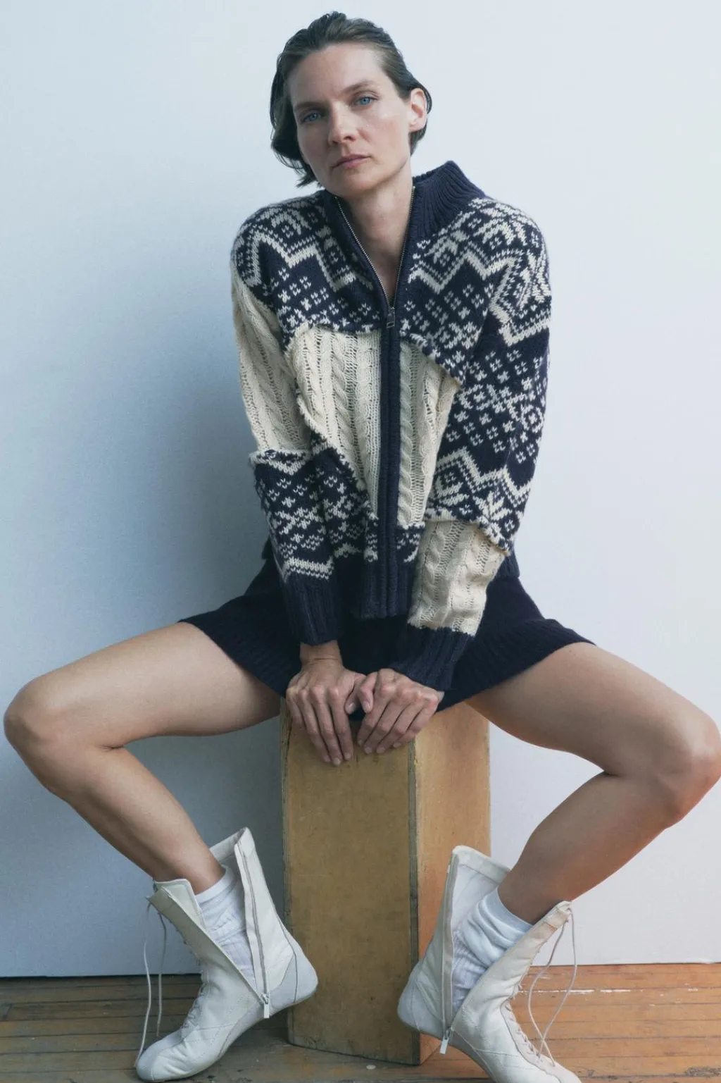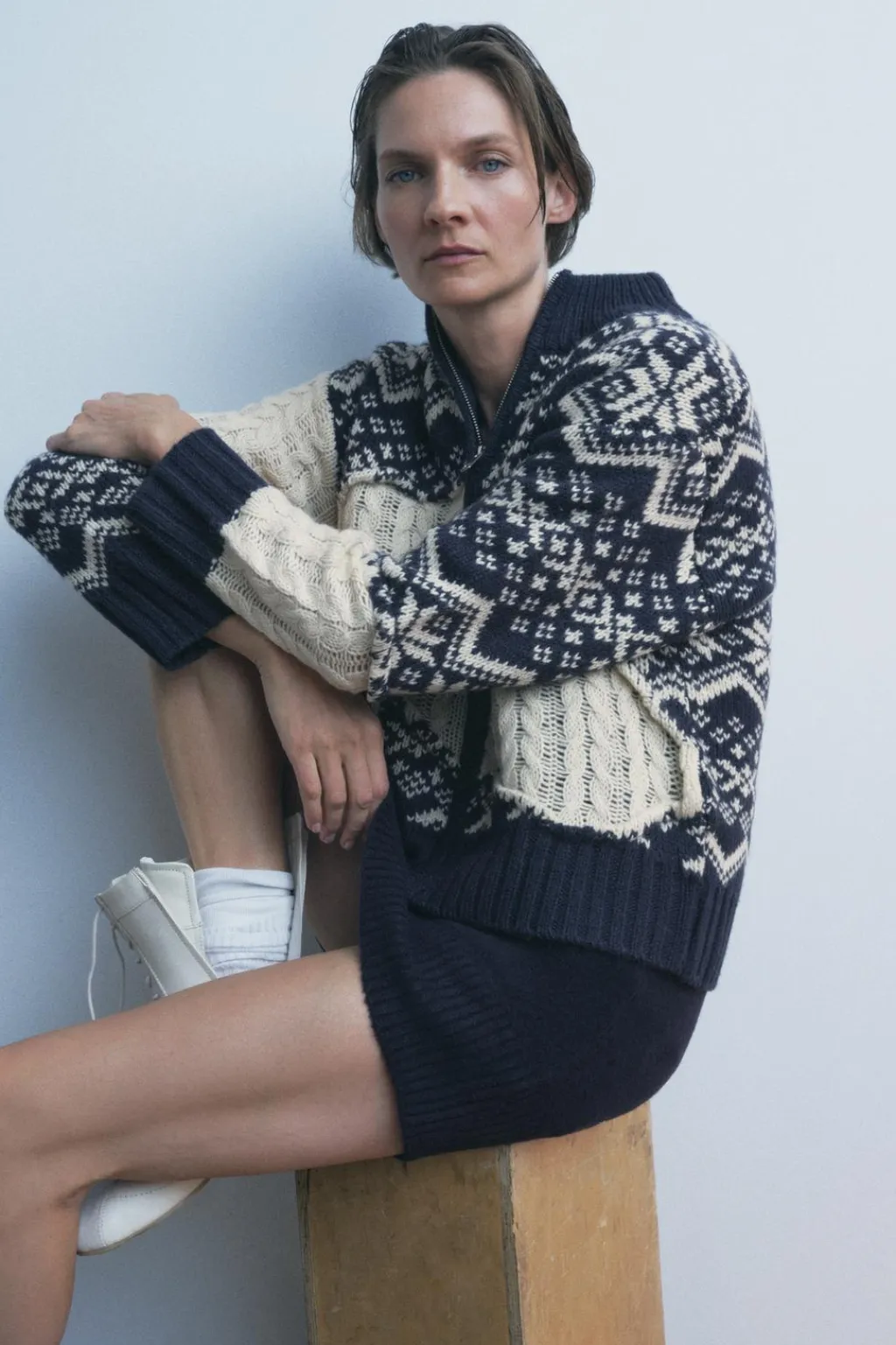 Chaqueta confeccionada con lana. Cuello redondo y manga larga. Detalle de tejido combinado con jacquard y ochos. Cierre frontal con cremallera.