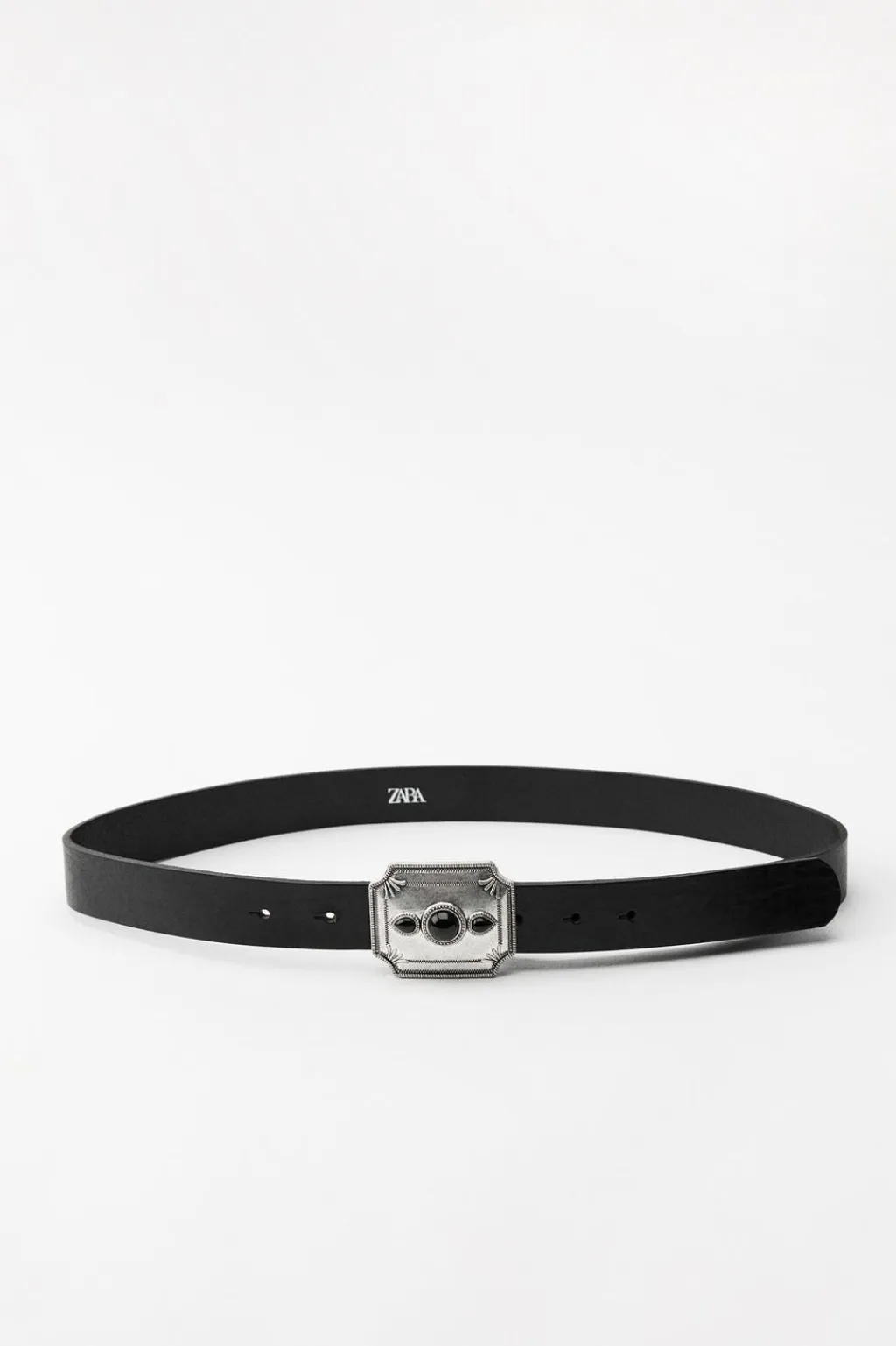 Cinturón de 3 cm de ancho realizado en piel. Hebilla metálica labrada en forma rectangular con aplicación de piedras a color.