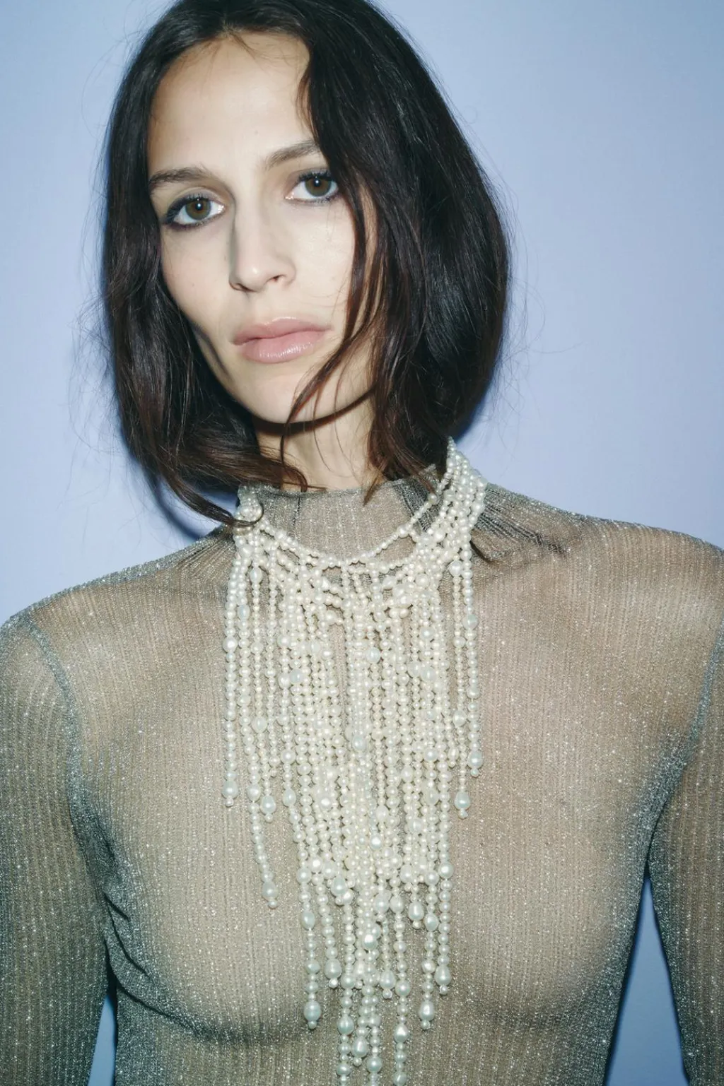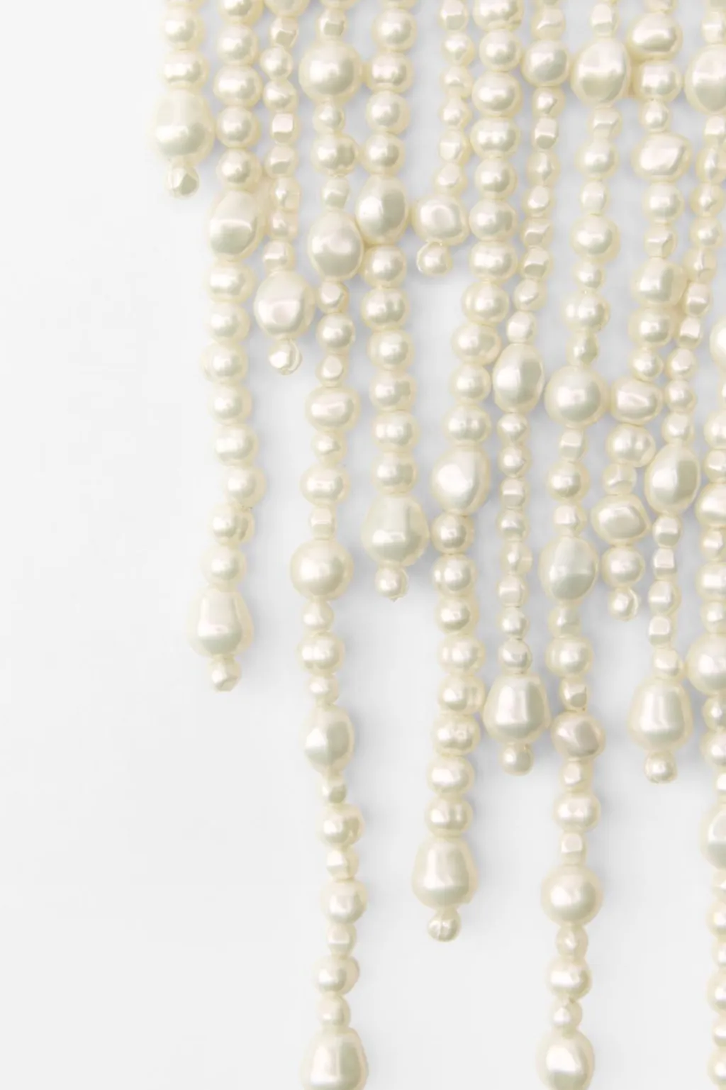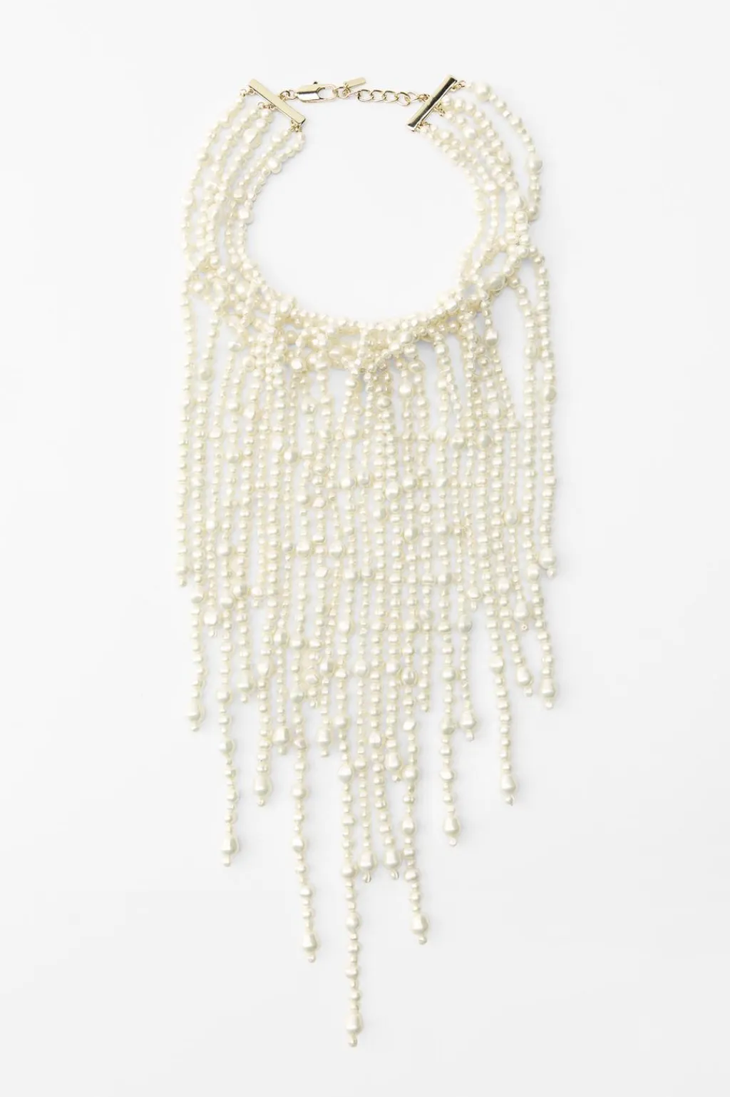 Collar múltiple con aplicaciones efecto perlas de diferentes formas y tamaños. Cierre con mosquetón.