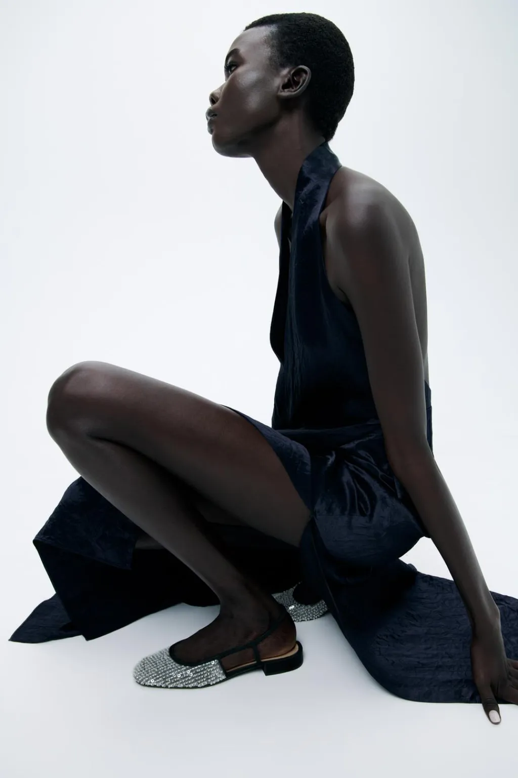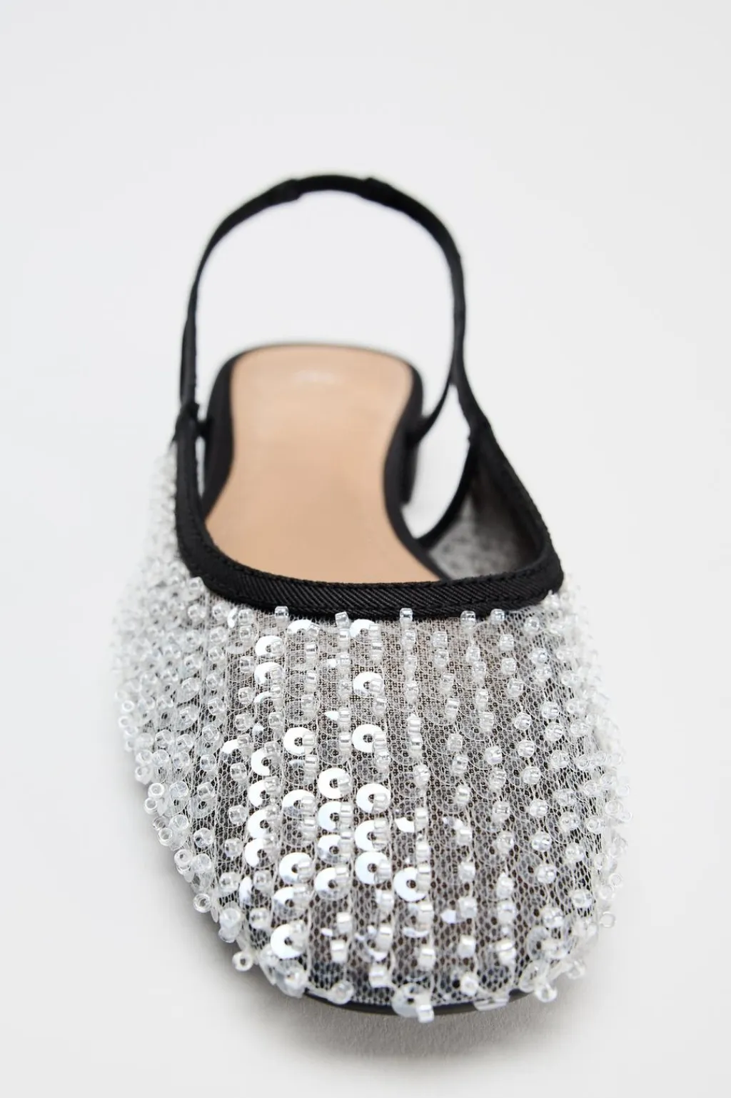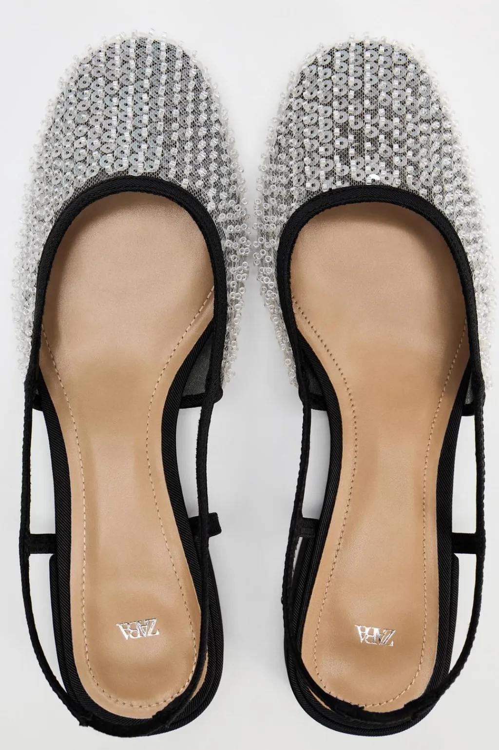 Zapato plano destalonado tipo bailarina. Detalle de lentejuelas en el corte. Cierre mediante tira elástica.