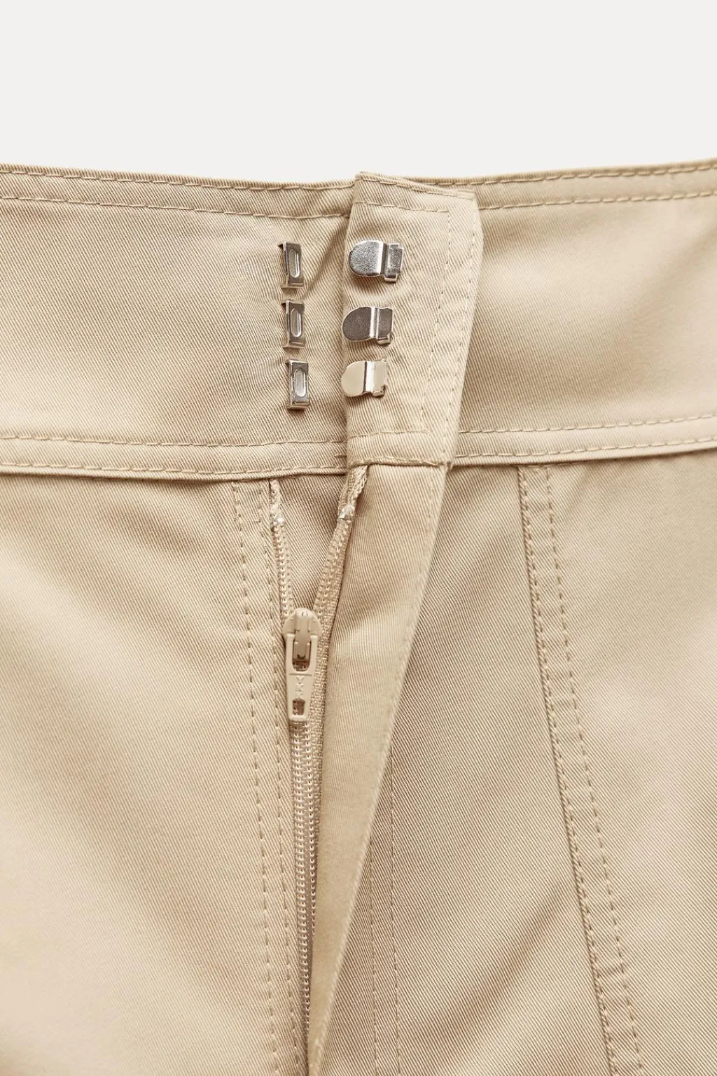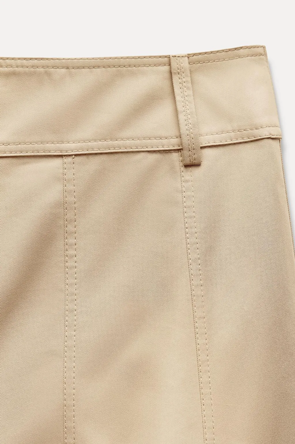 Falda midi confeccionada en tejido tipo gabardina. Tiro medio y cintura con trabillas. Bajo acabado en godets. Cierre frontal con cremallera, botón y ganchos metálicos.