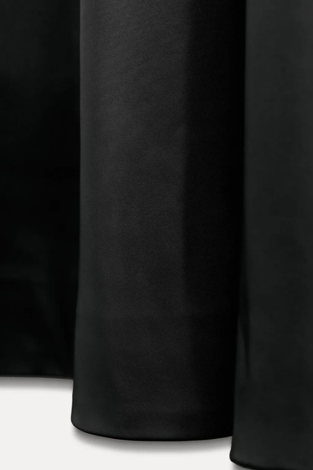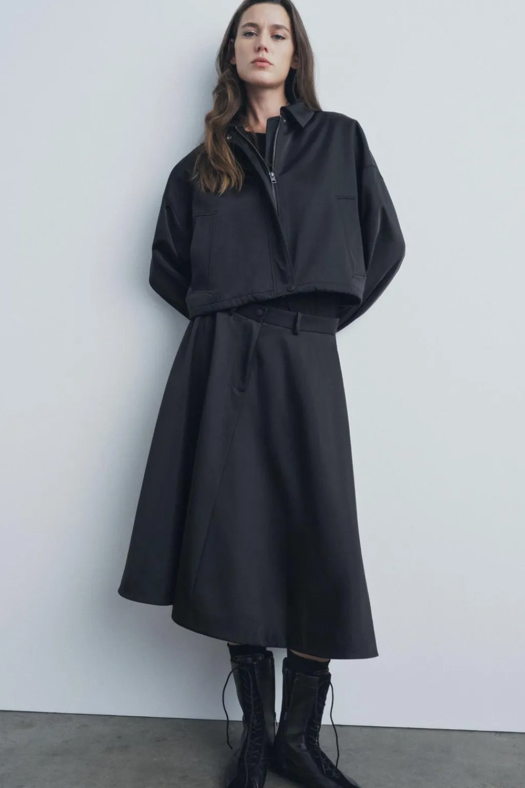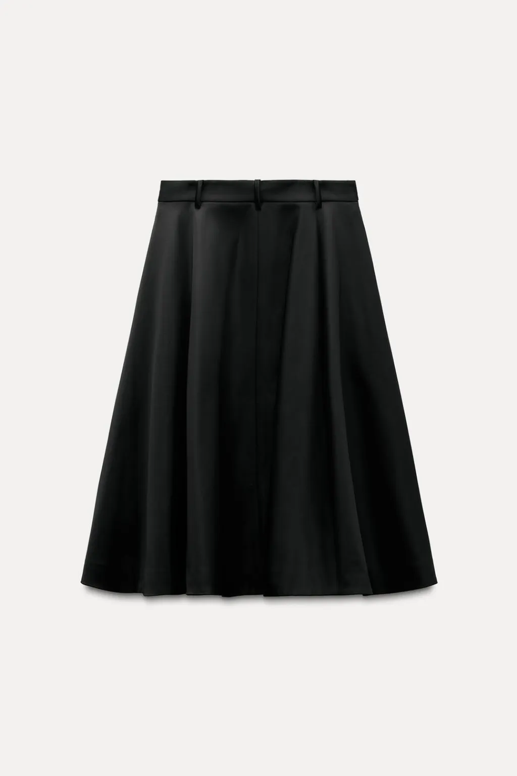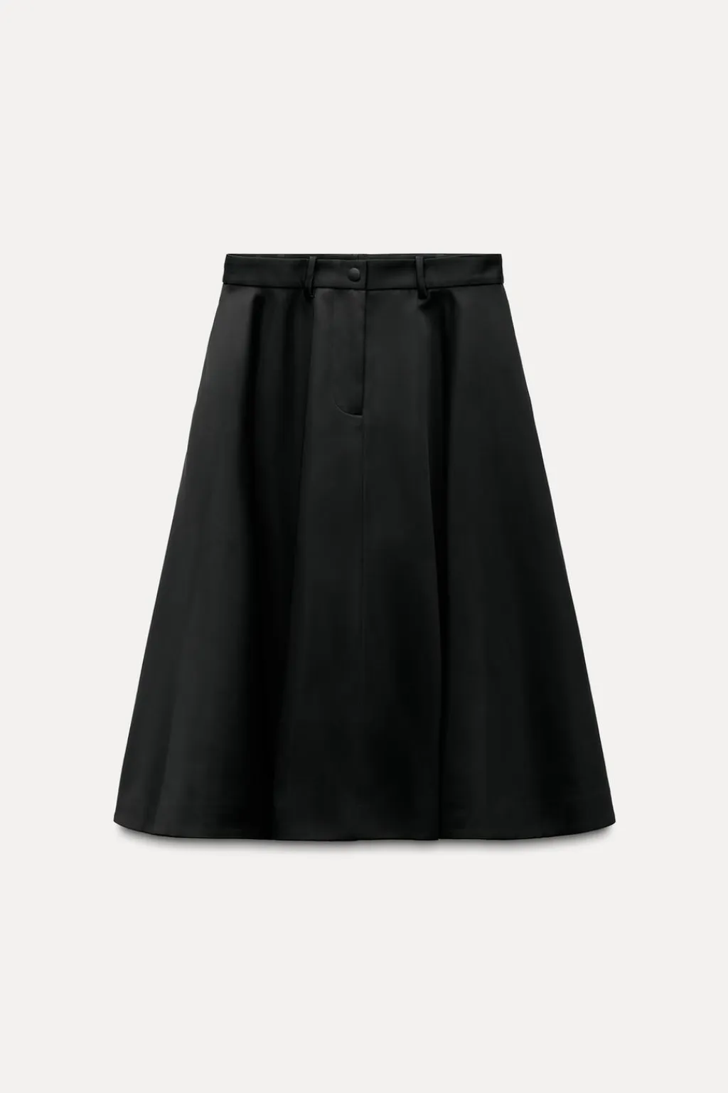 Falda midi confeccionada en tejido tipo gabardina. Tiro medio y cintura con trabillas. Bajo acabado en línea evasé con volumen. Cierre frontal con cremallera y botón.