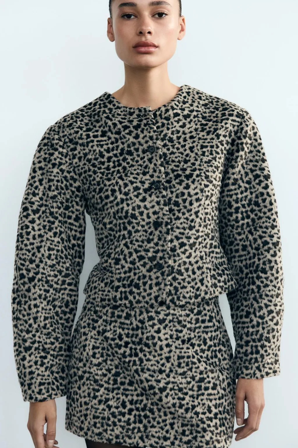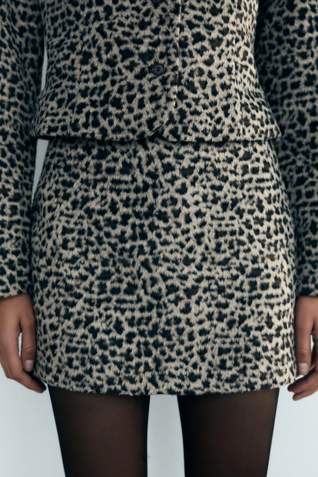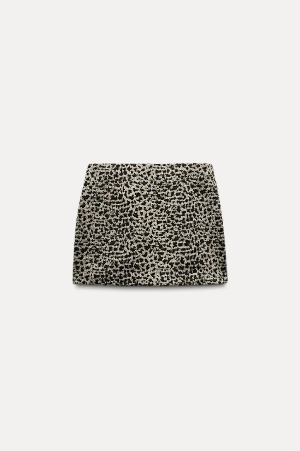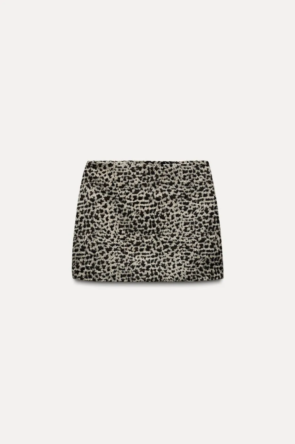 Falda mini confeccionada en tejido efecto pelo de tiro medio. Forro interior combinado a contraste. Cierre lateral con cremallera oculta en costura.
