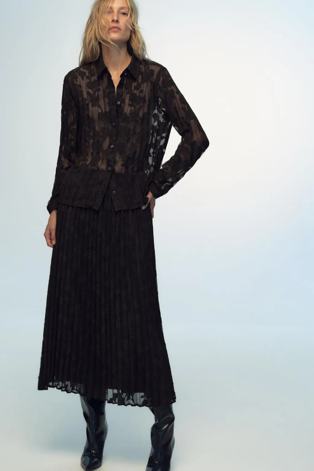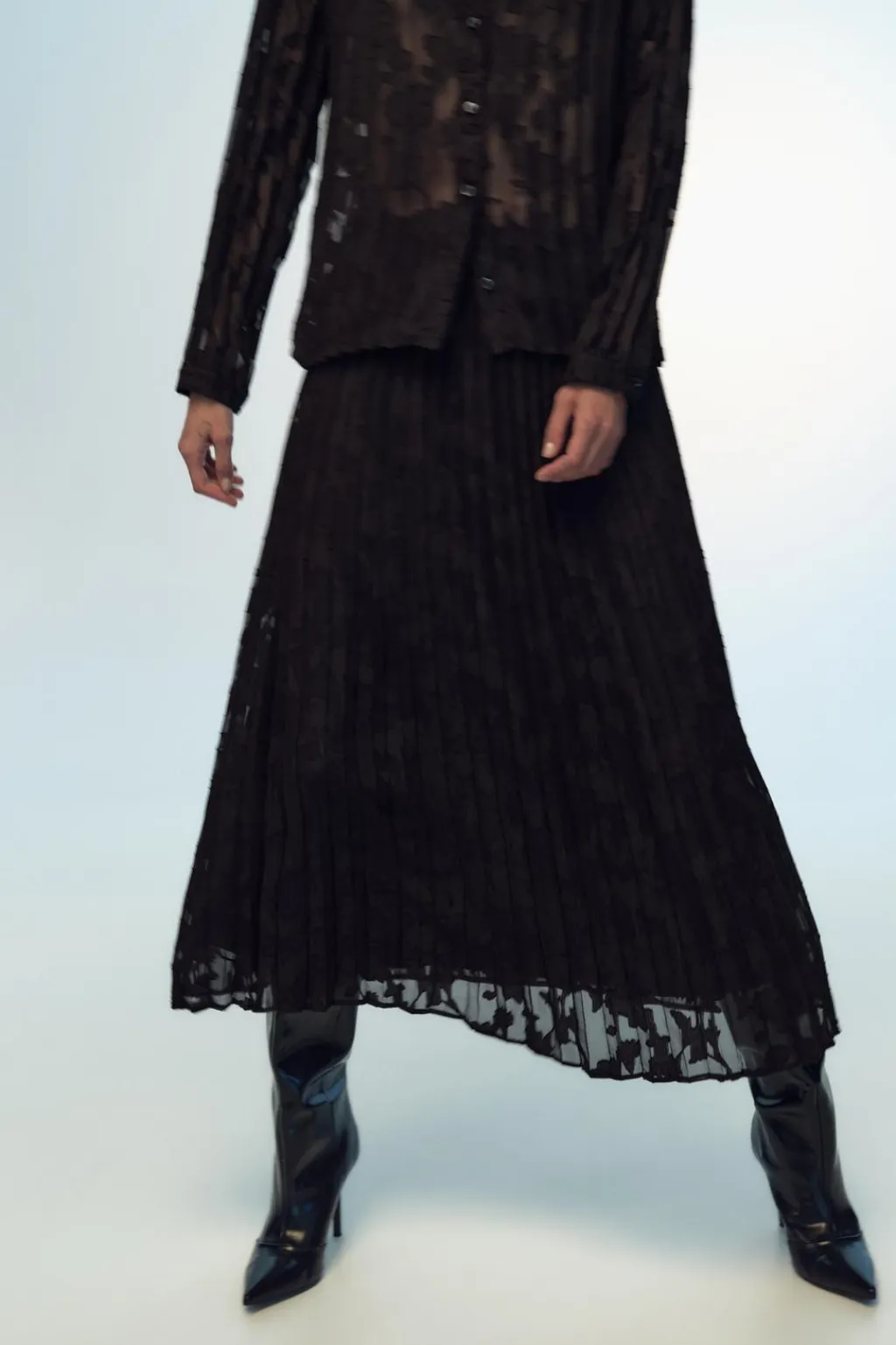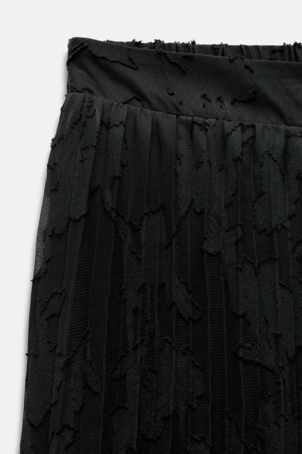 Falda con tejido semitransparente combinado en devoré. Forro interior. Cintura elástica en espalda.